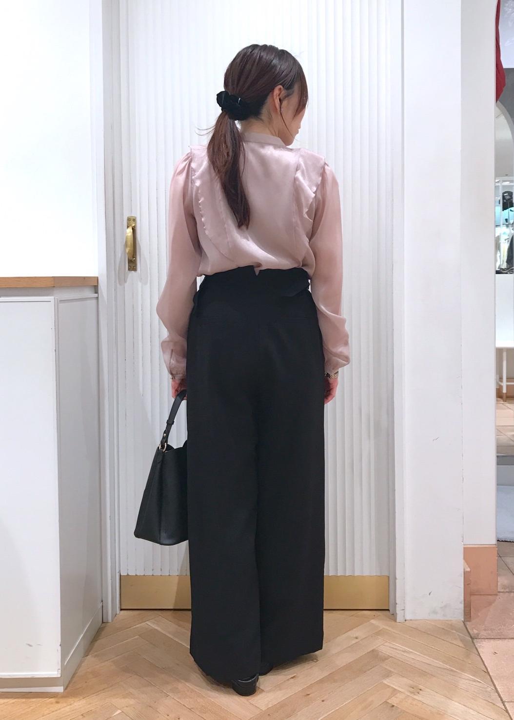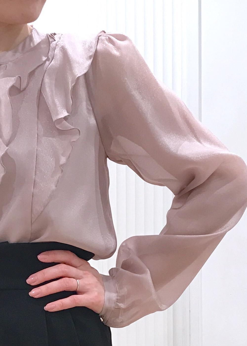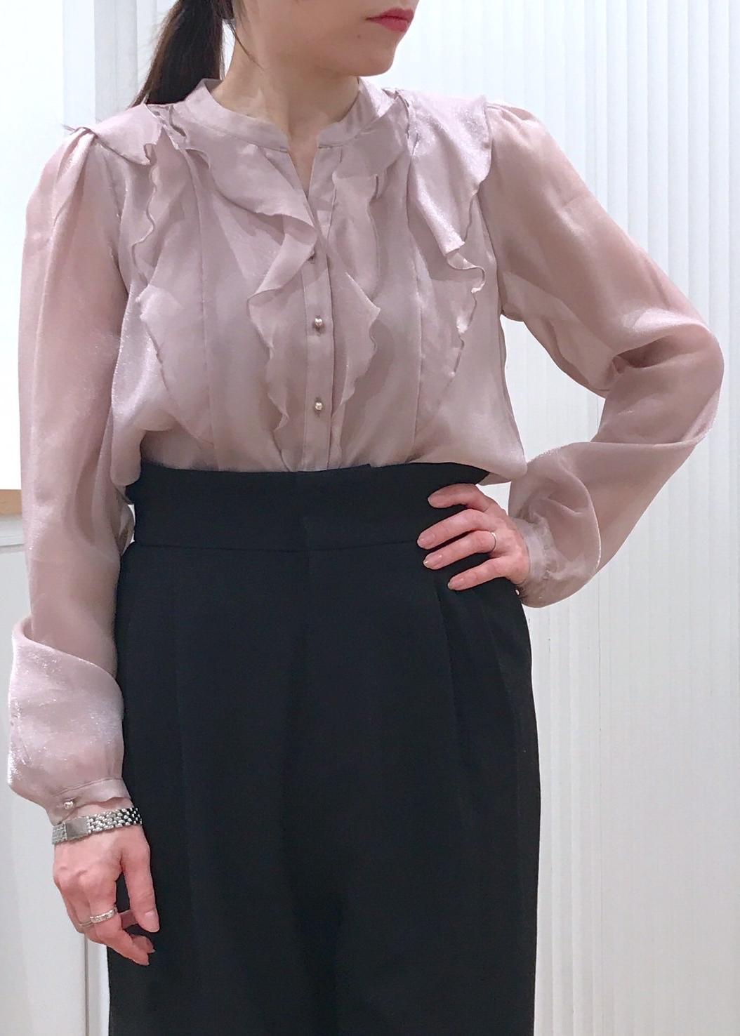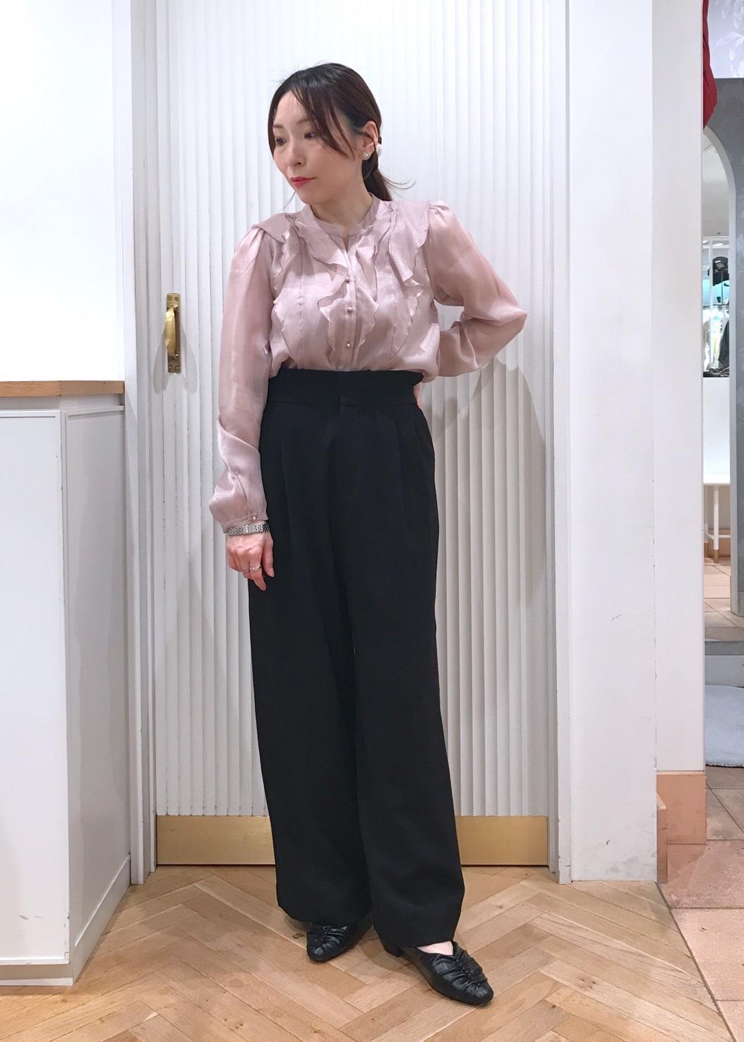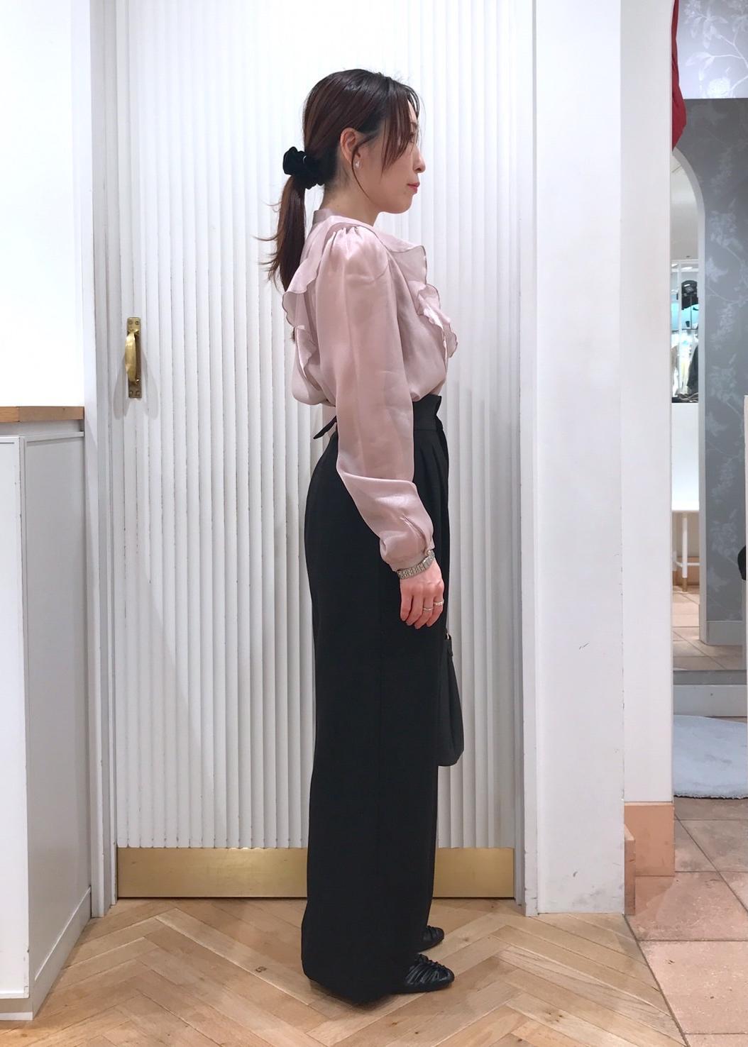 フリルブラウスをワイドパンツに合わせた、通勤にちょうど良いフェミニンコーデです。