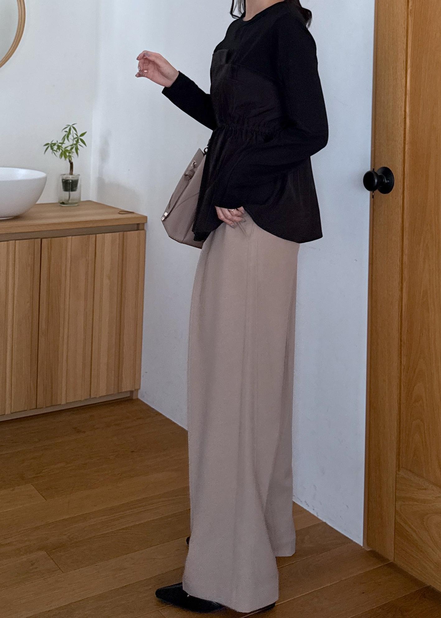 ブラック×ベージュの落ち着いたトーンのコーデ。
