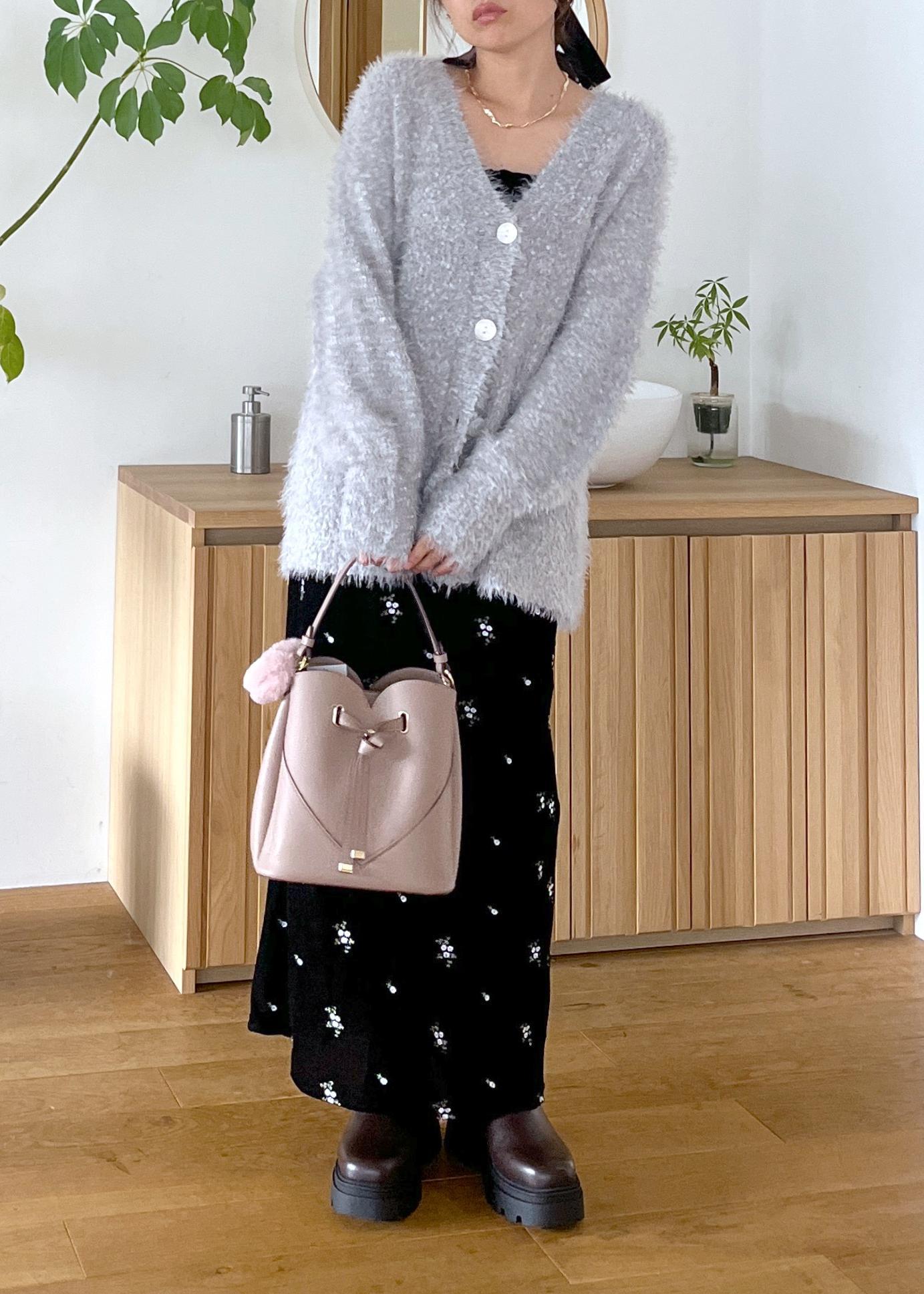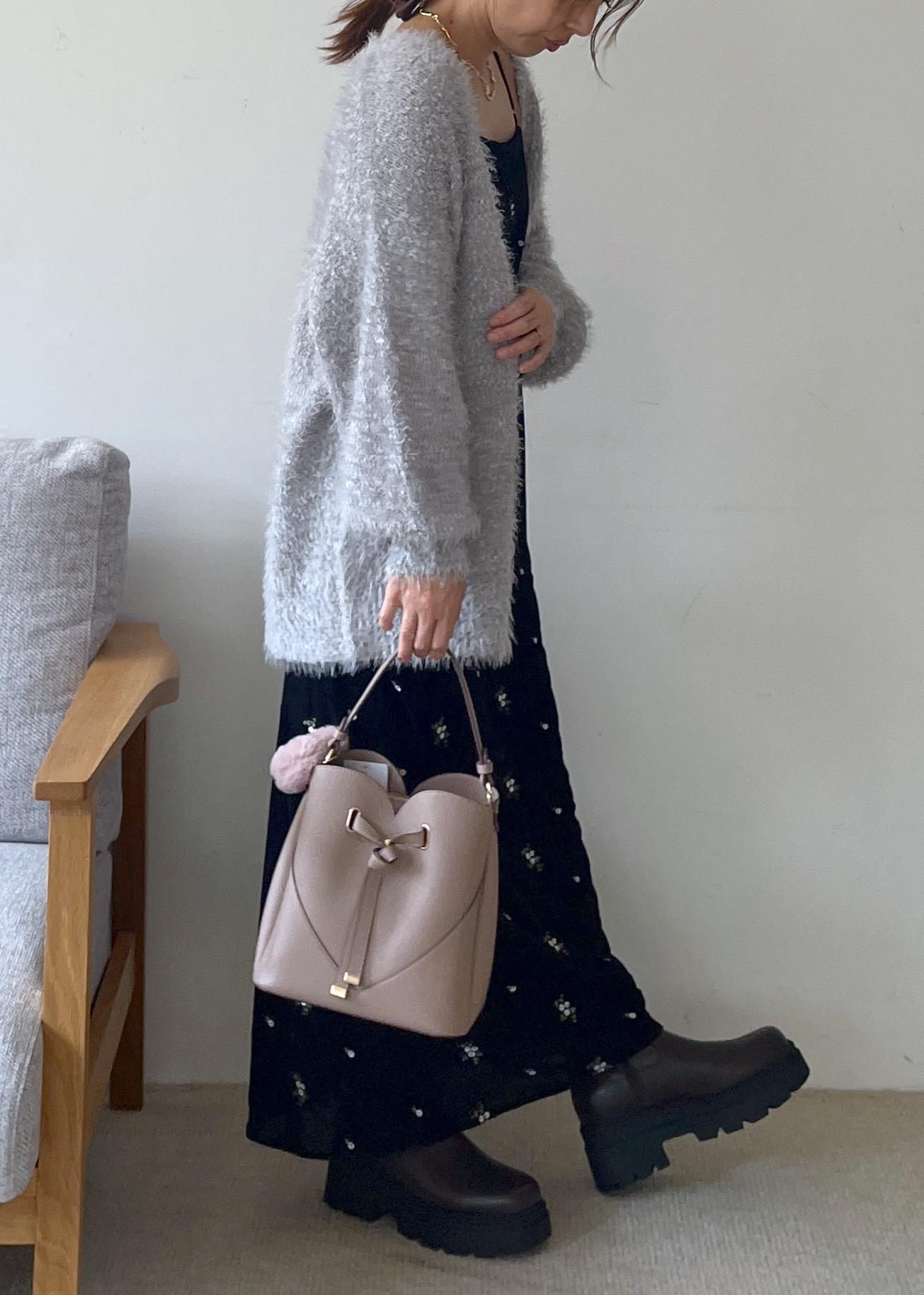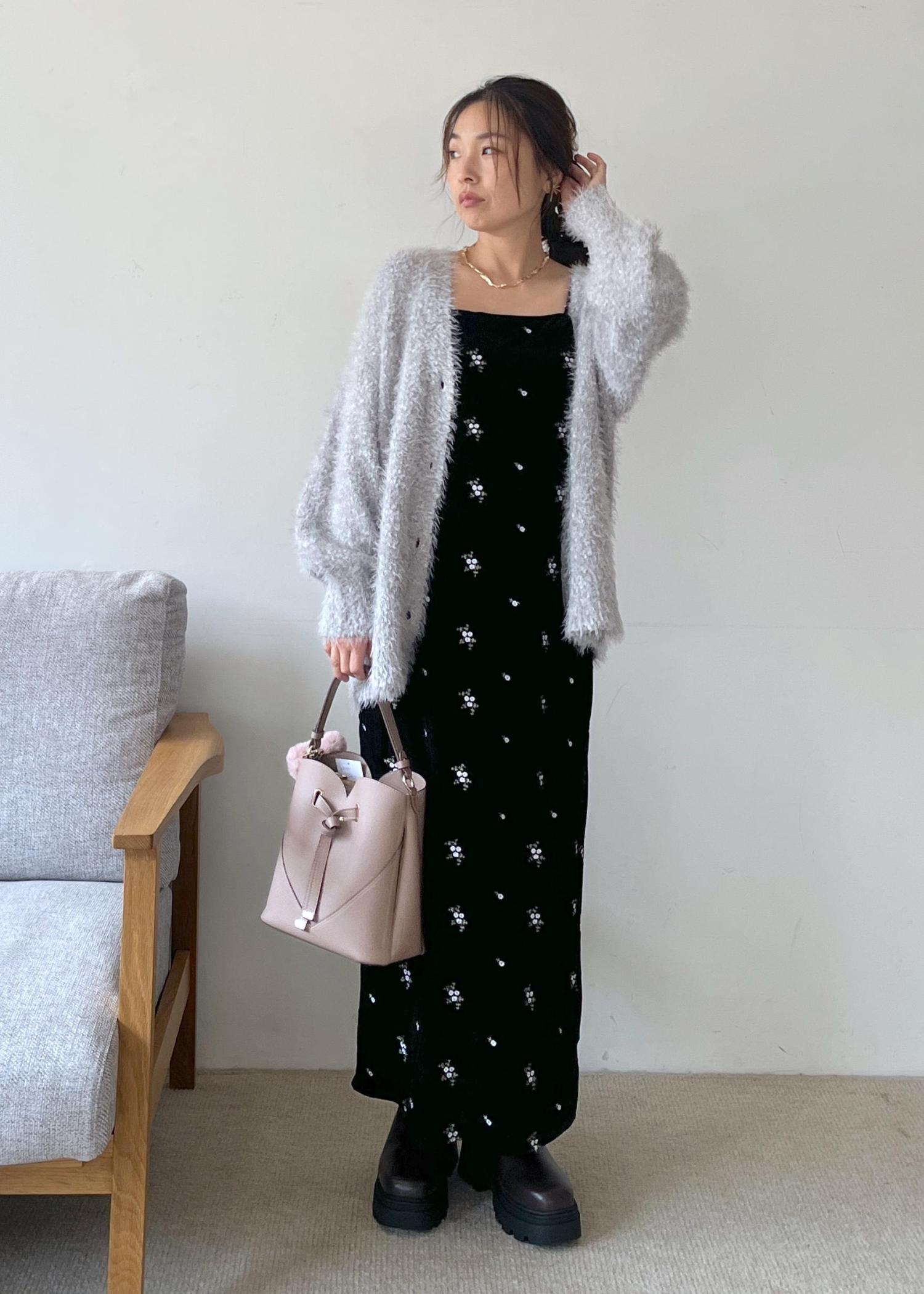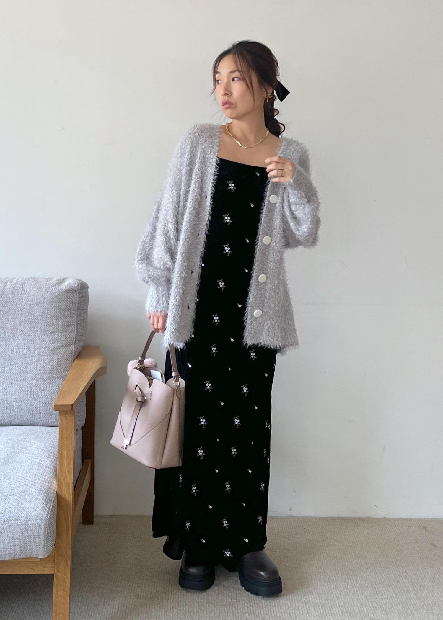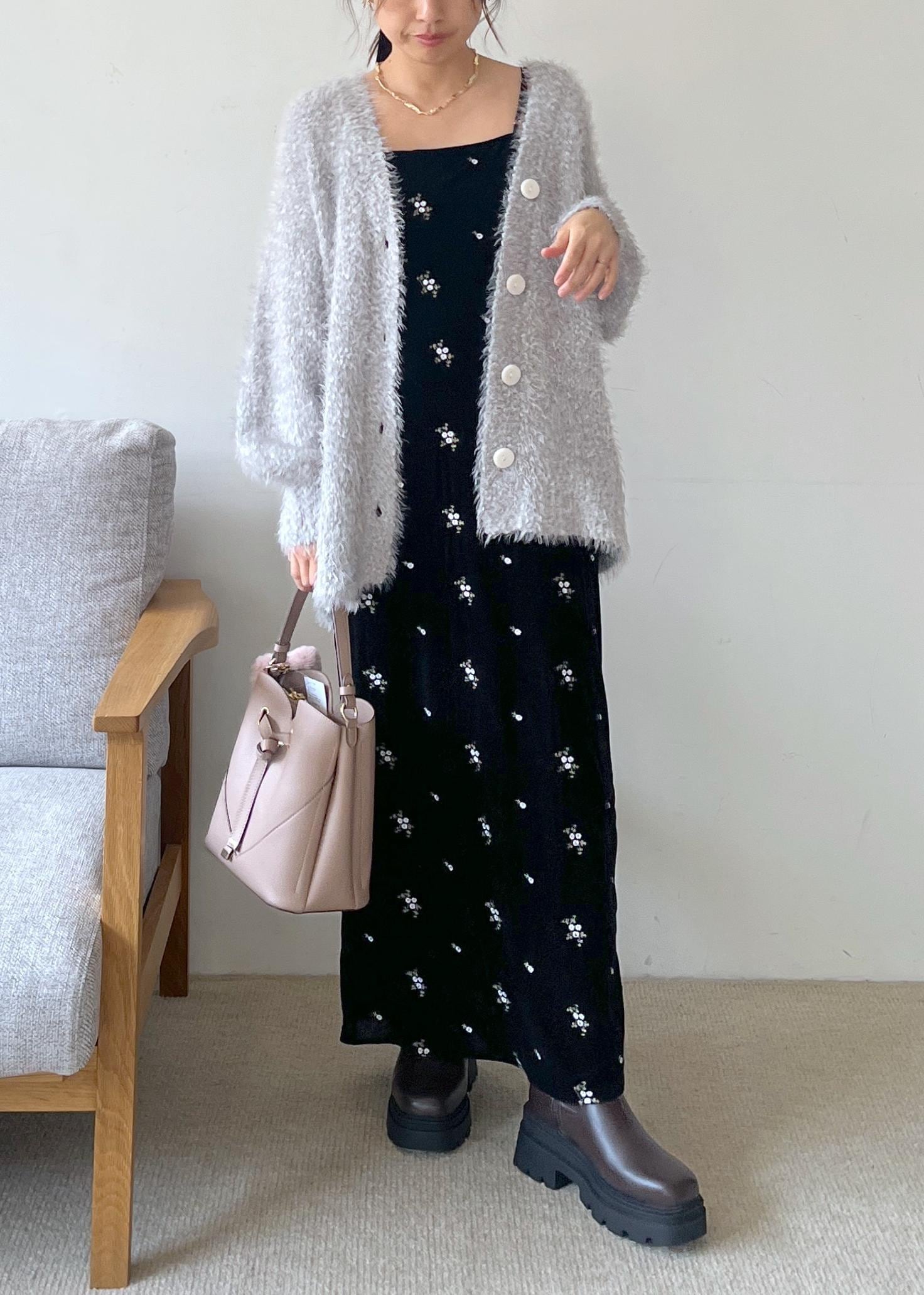 ふわっとしたシャギー素材のカーディガンに、落ち着いたブラックベースの小花柄ワンピースを合わせた、甘さと大人っぽさのバランスが絶妙なスタイリング。ボリュームソールのブーツで足元に辛さをプラスすれば、可愛いだけじゃない洗練された雰囲気に。