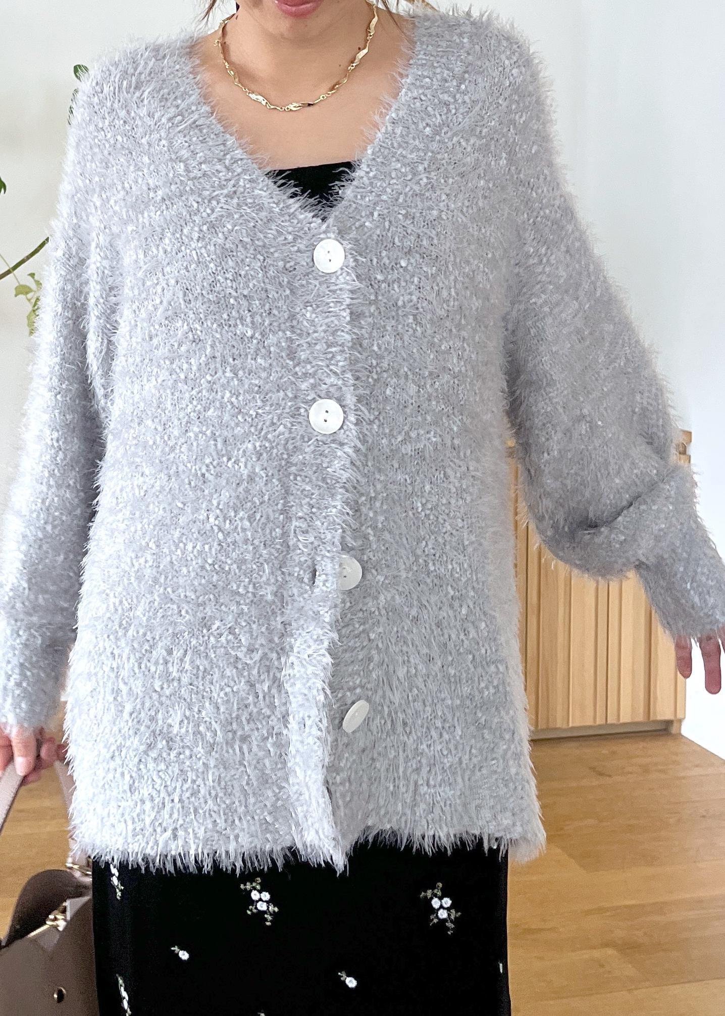 VISポップコーンヤーンラメフェザーニットカーディガン/WEB限定FSサイズライトグレー / F¥4,612レビュー152cmでFサイズ着用し、着丈はお尻が隠れるくらいの丈。ふわふわモコモコ素材は着るだけで可愛い!とっても肌触り柔らかくオチ感のあるニットなので着膨れの心配なし!袖長めなところも◎軽めのアウターとしても使えるニットカーデはとっても便利です。