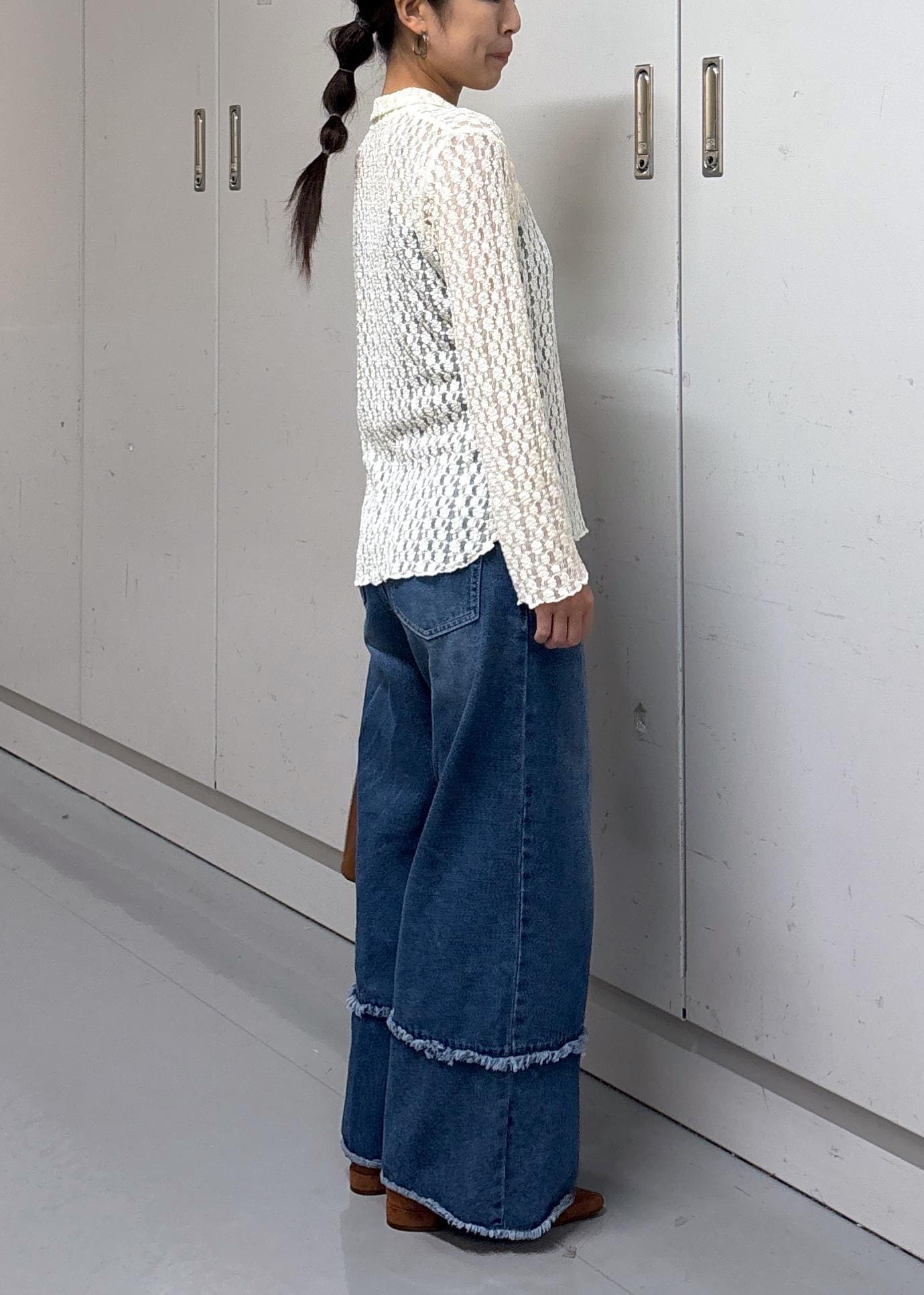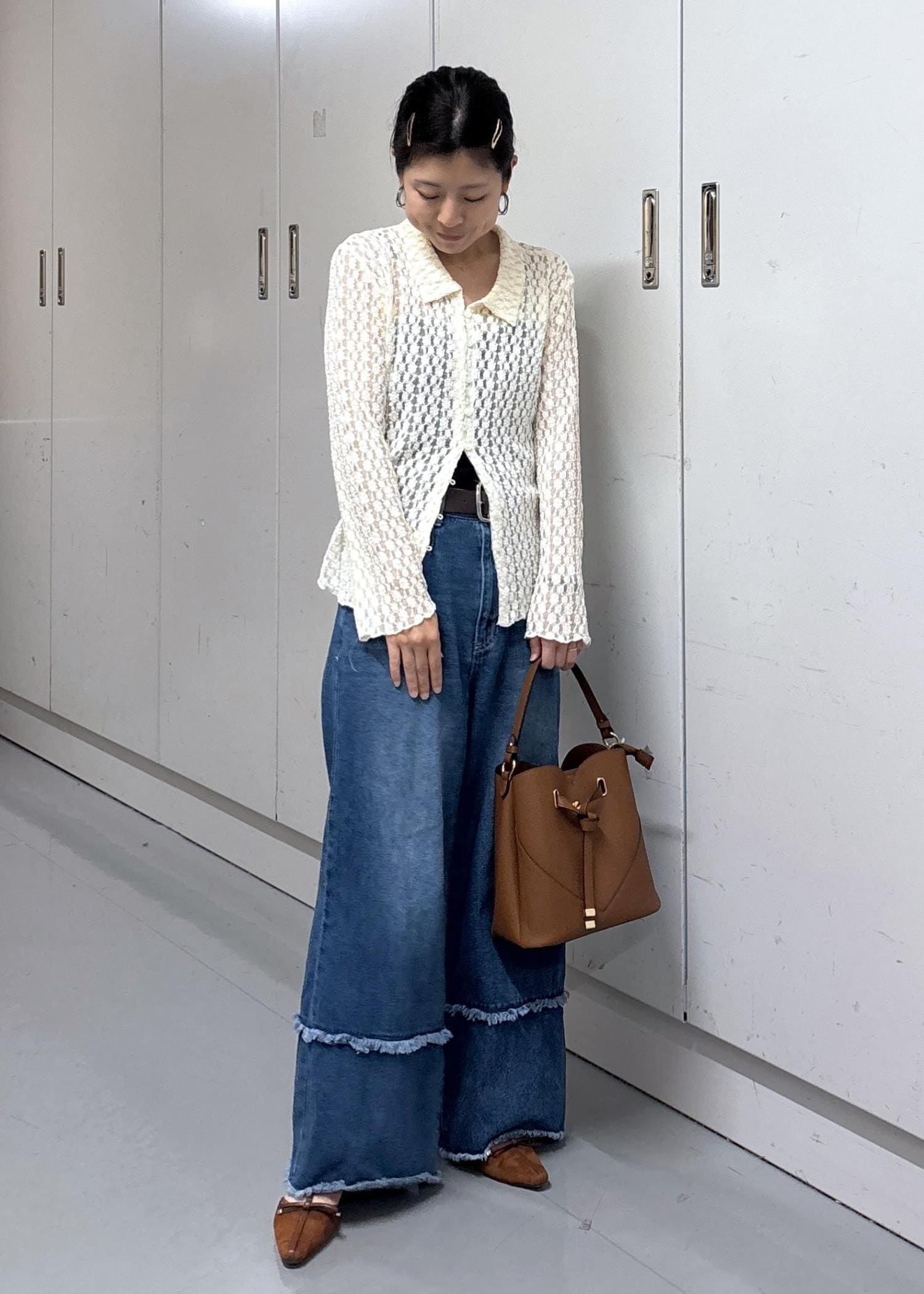 VISフリンジフレアデニムブルー系 / M¥4,395レビュー身長156cmでSサイズを着用。 ウエストは少しゆとりがありますがトップスをインするとちょうどよいです!丈は靴を履いてギリギリ床にあたらないくらいで、思ったよりもジャストで着られました◎下着のラインを拾わず程よく厚みとハリがありますが、軽くて柔らかい肌触りで暑い日も着やすい生地感。脚周りは広めですが大きく見えないデザインではきやすいです!