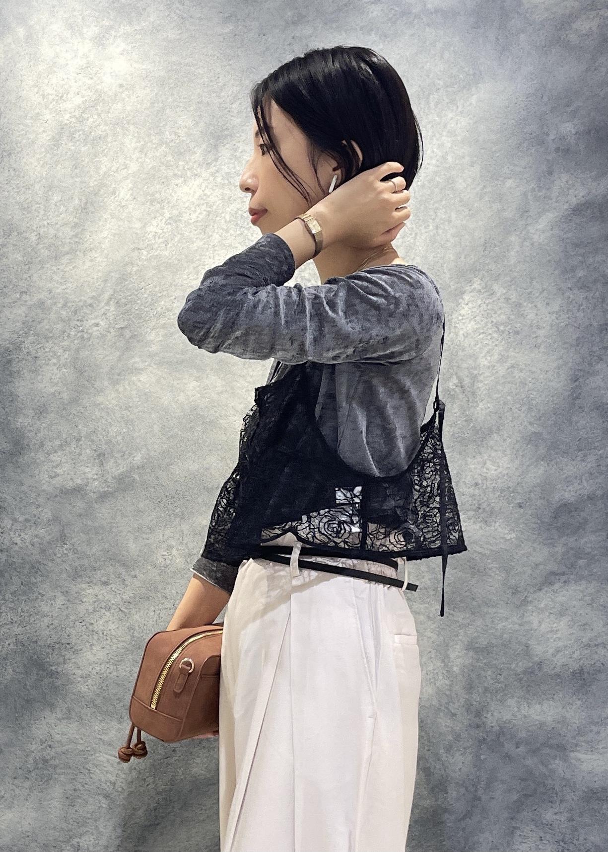 VISシアーベロアロングスリーブTシャツグレー / F¥4,389レビューベロア調のシアーカットソーで、一枚着はもちろん、ビスチェやジャケットのインナーにもピッタリです。