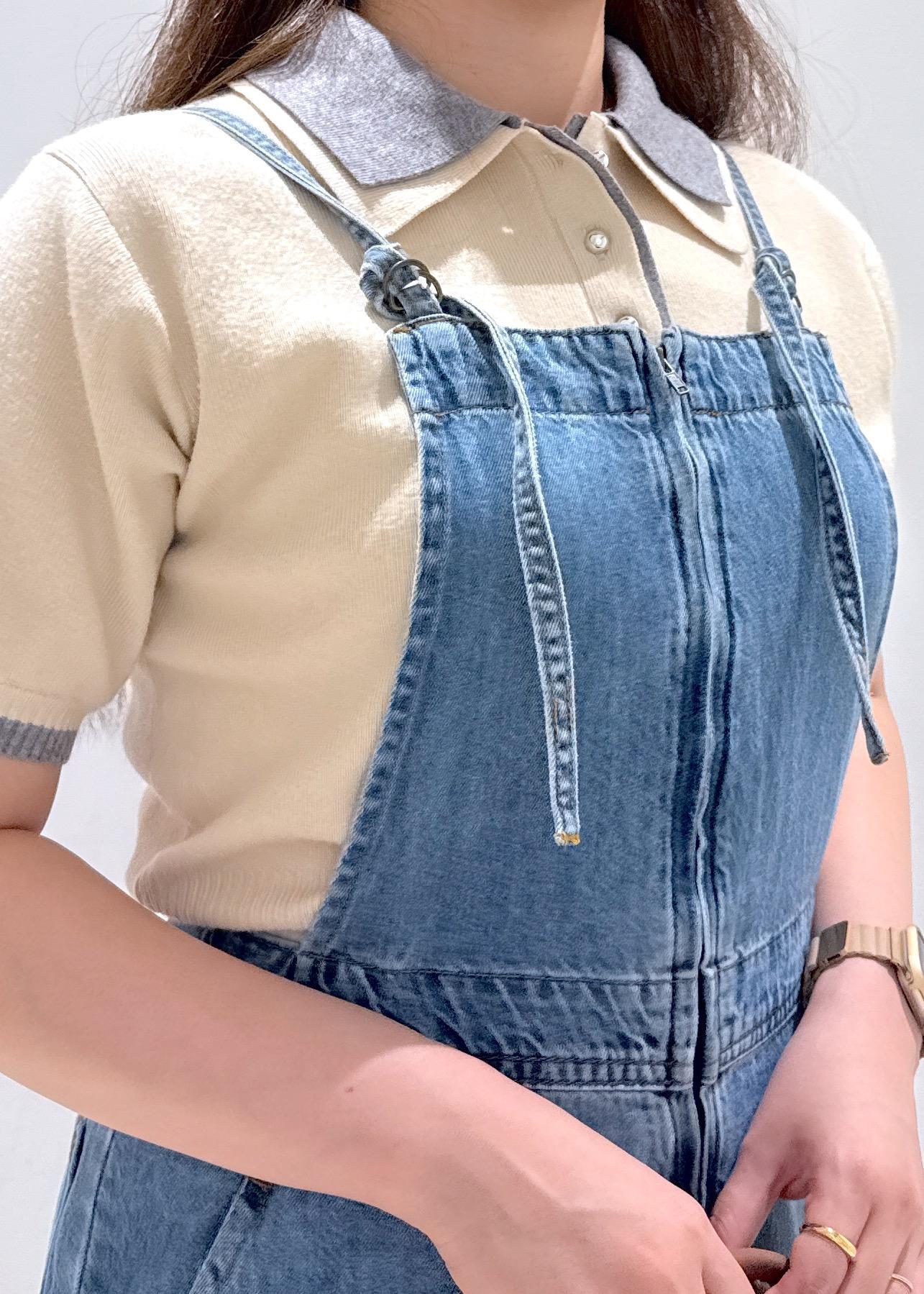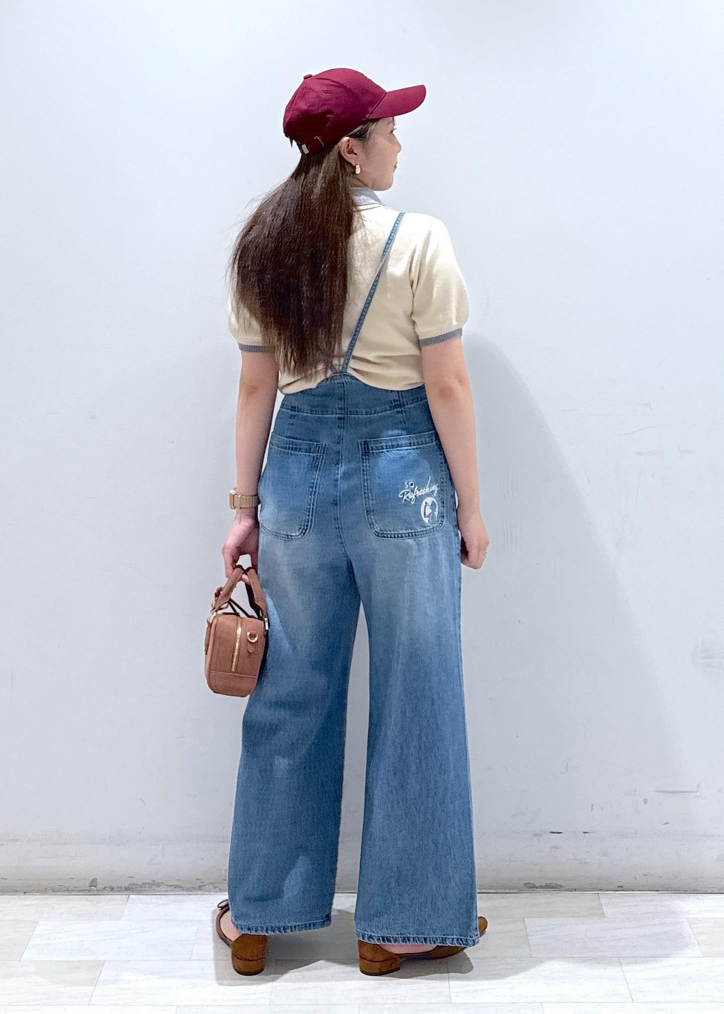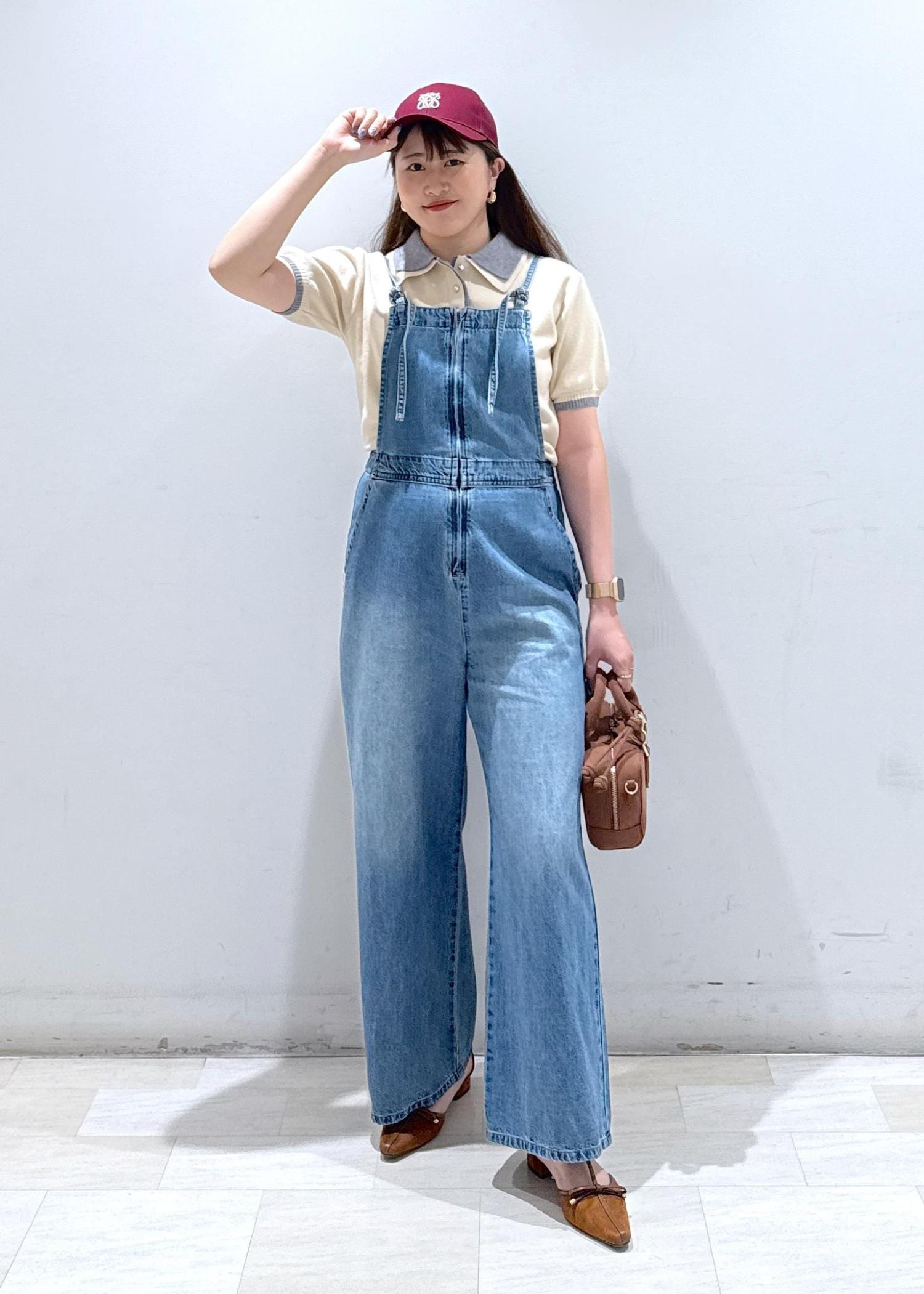 コカコーラのコラボアイテムのデニムオールインワンに、今年トレンドのダブルカラーポロニットのトップスをインナー代わりに使用してカジュアルなコーディネートにしました。