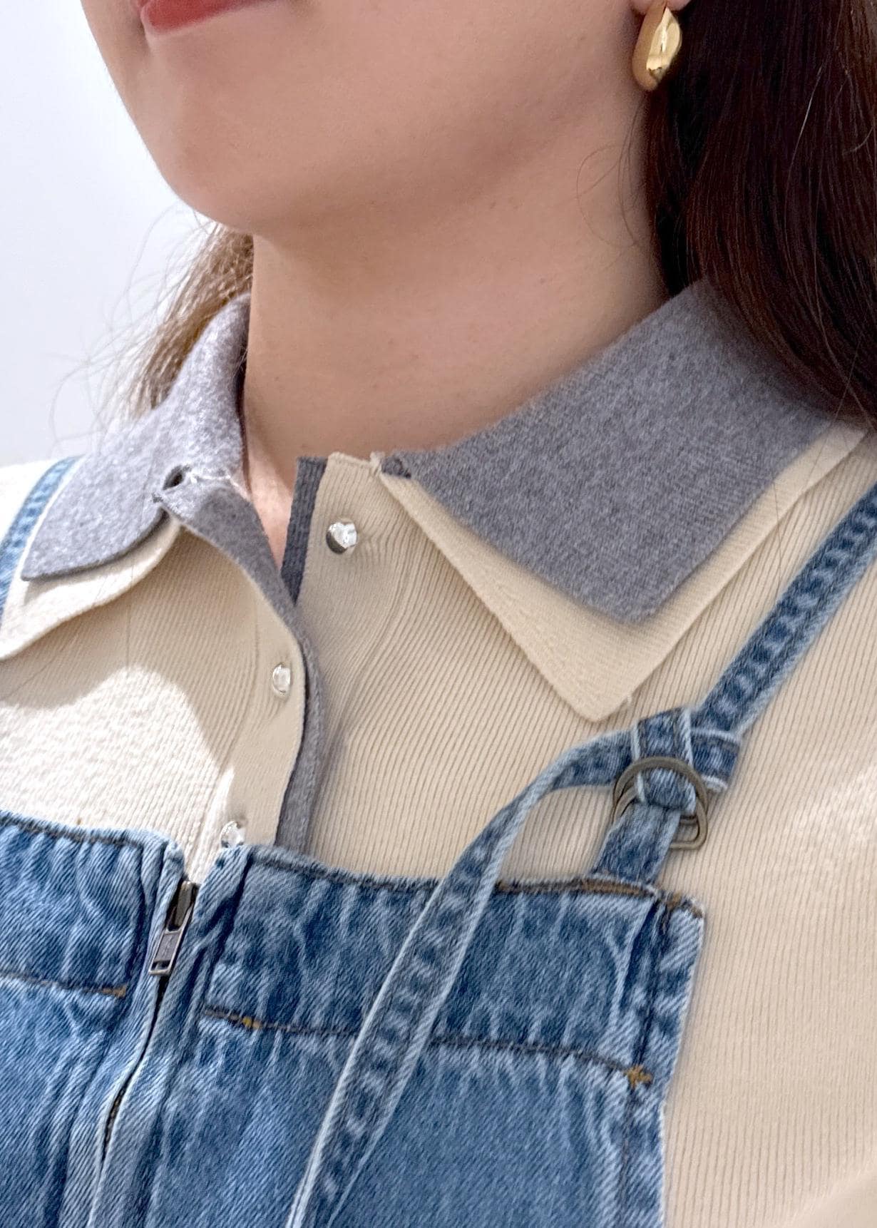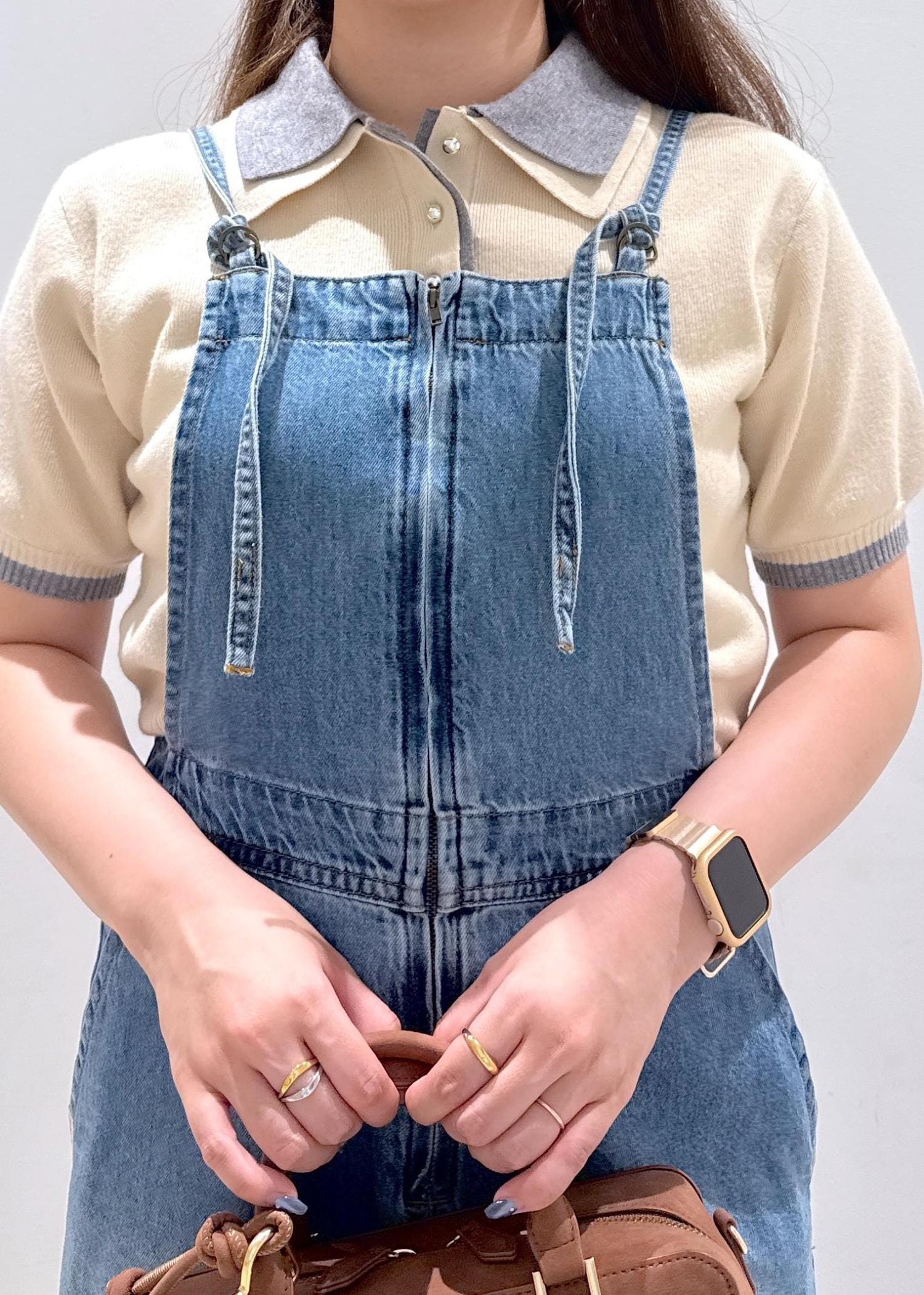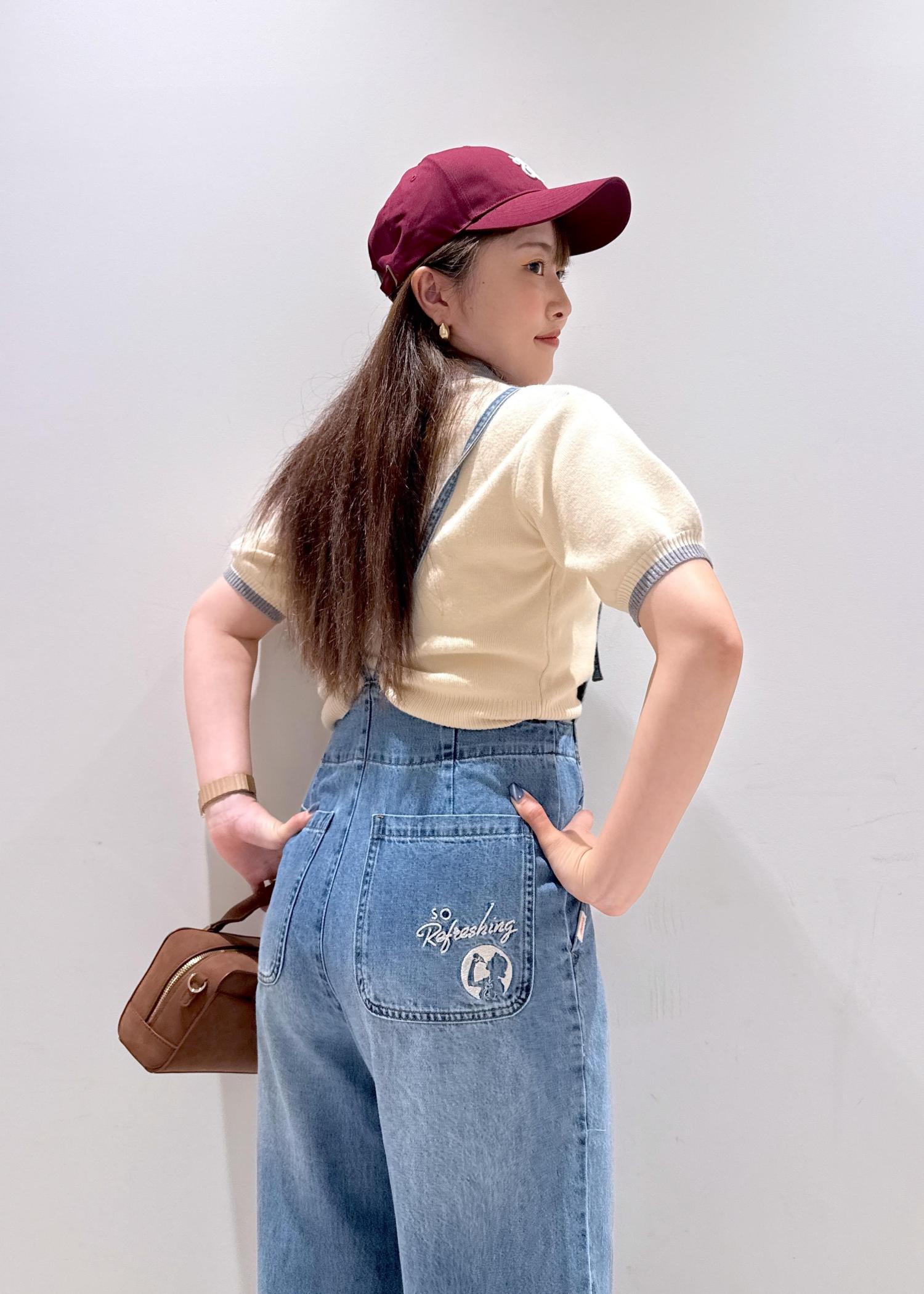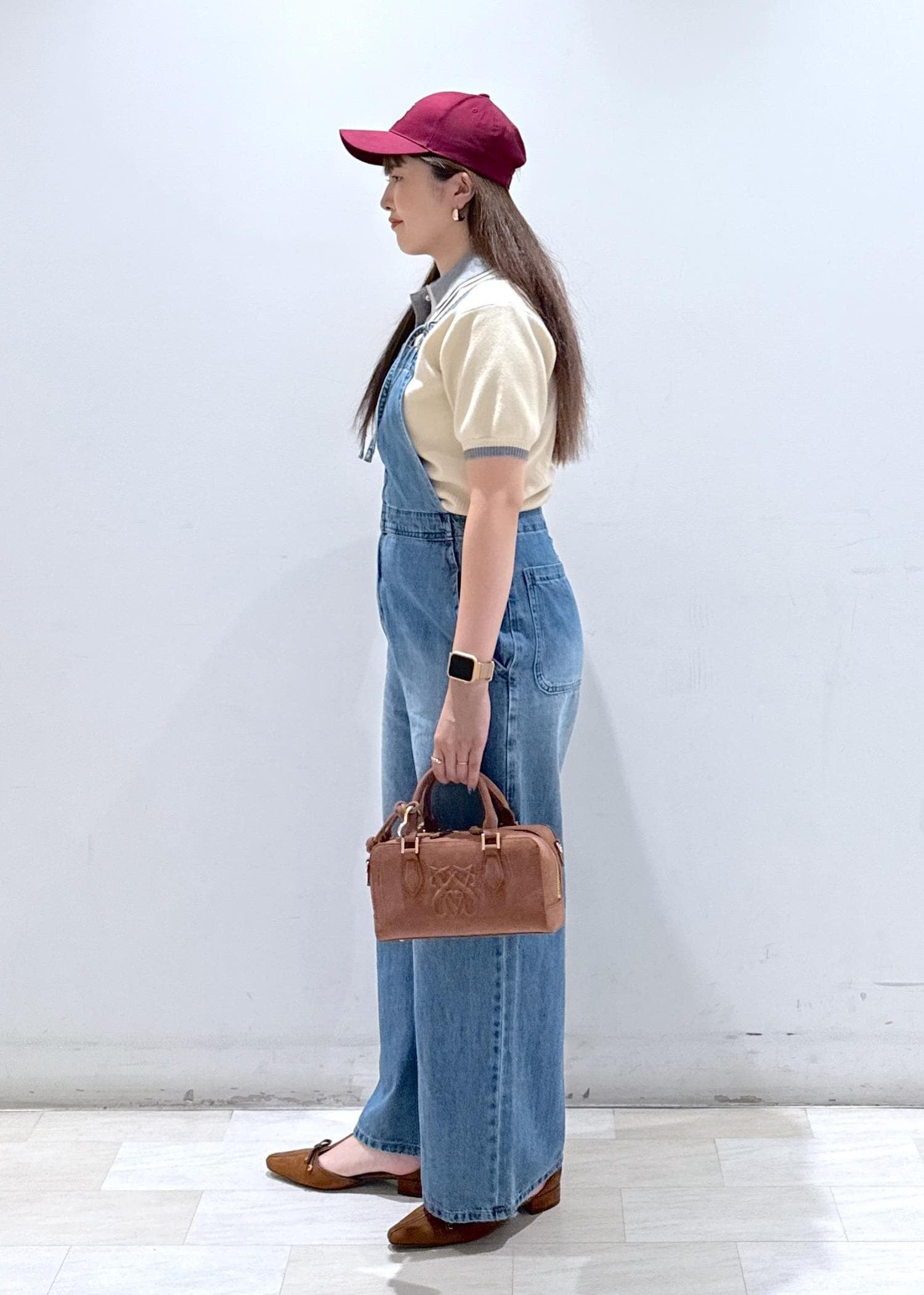 コカコーラのコラボアイテムのデニムオールインワンに、今年トレンドのダブルカラーポロニットのトップスをインナー代わりに使用してカジュアルなコーディネートにしました。