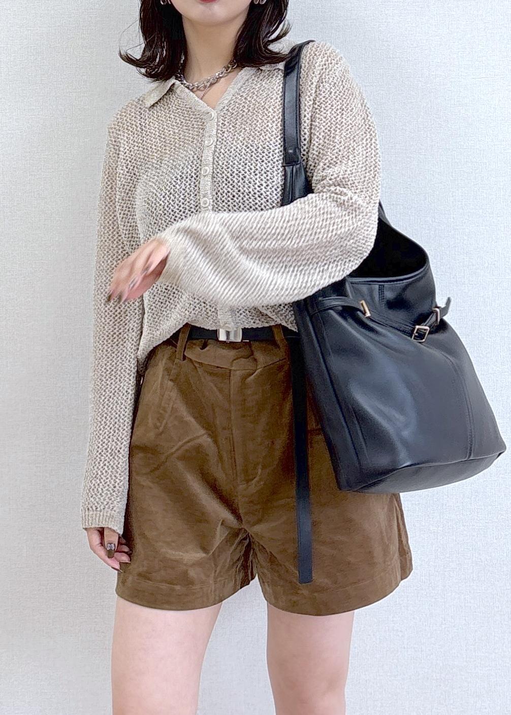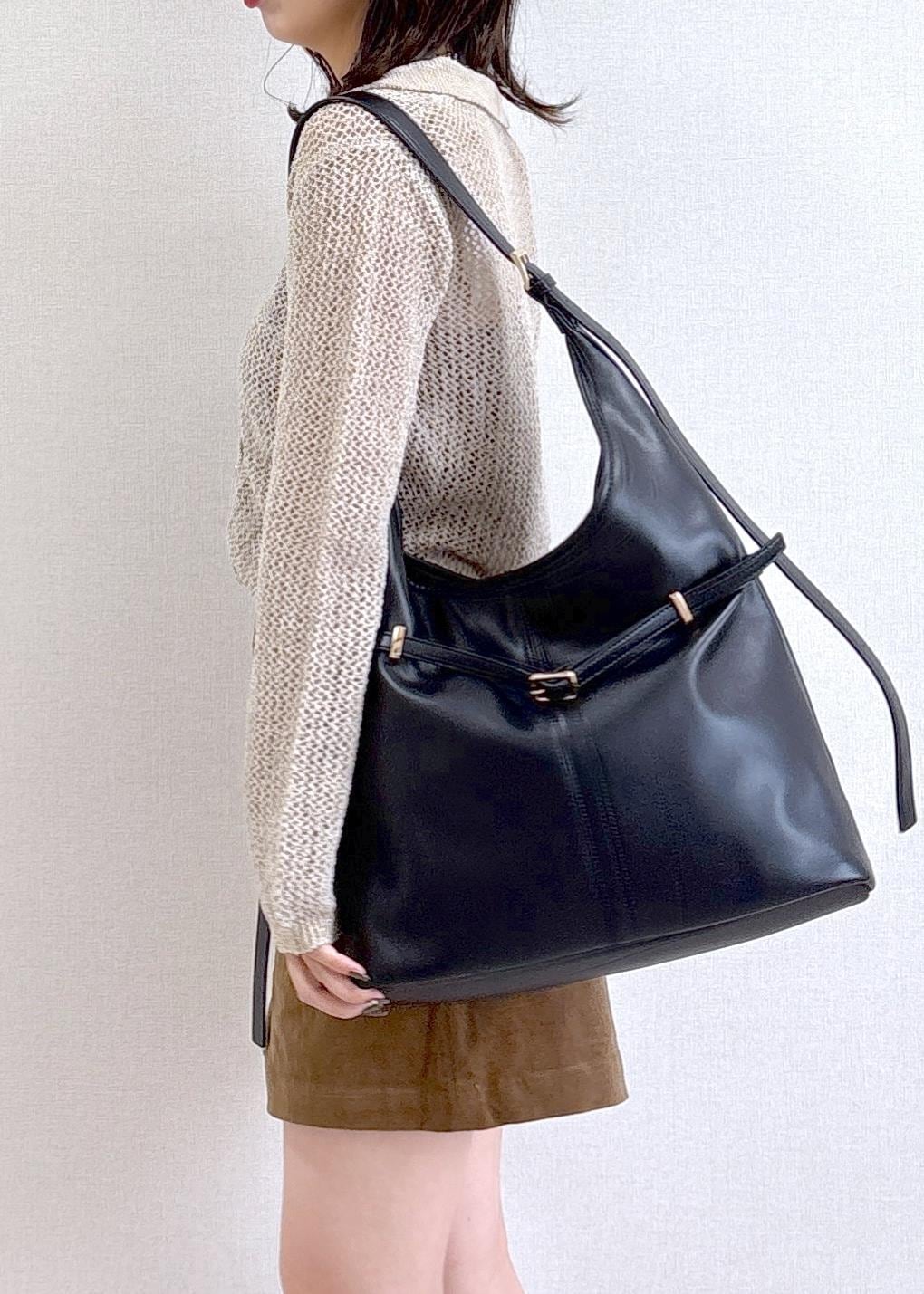 大きさもしっかりあって、チャックが広く開くので出し入れのしやすさも◎、素材が柔らかいので厚みのある荷物も入れやすいですし、大きさの割にシルエットが華奢な感じがするのもとても良いです!