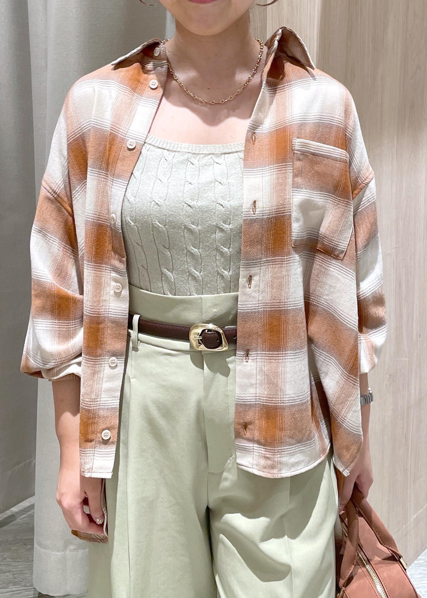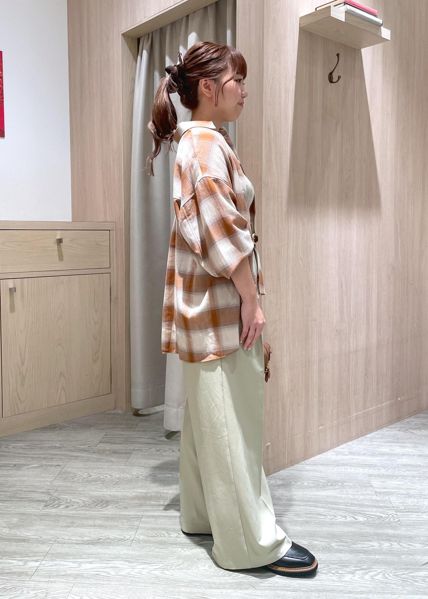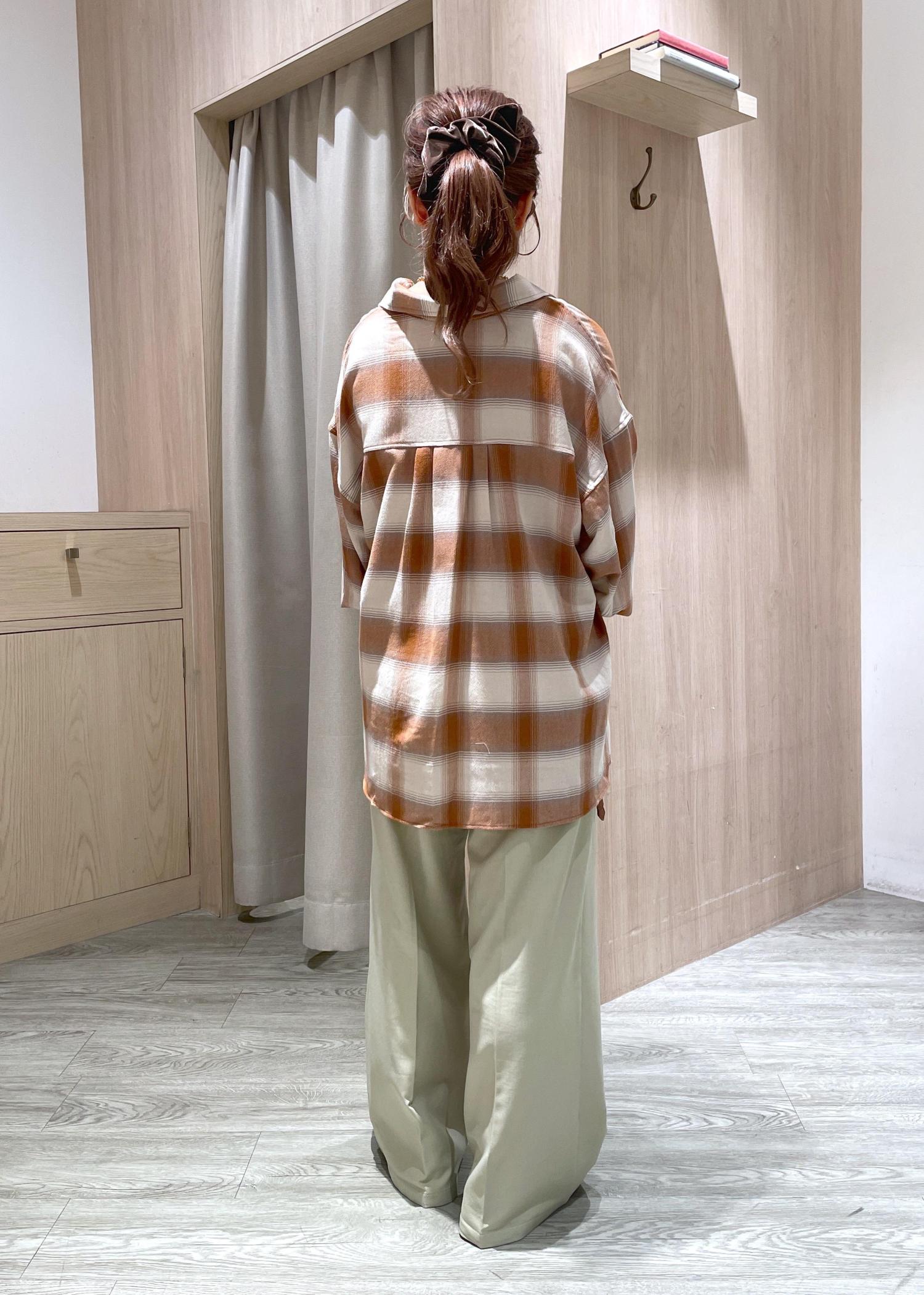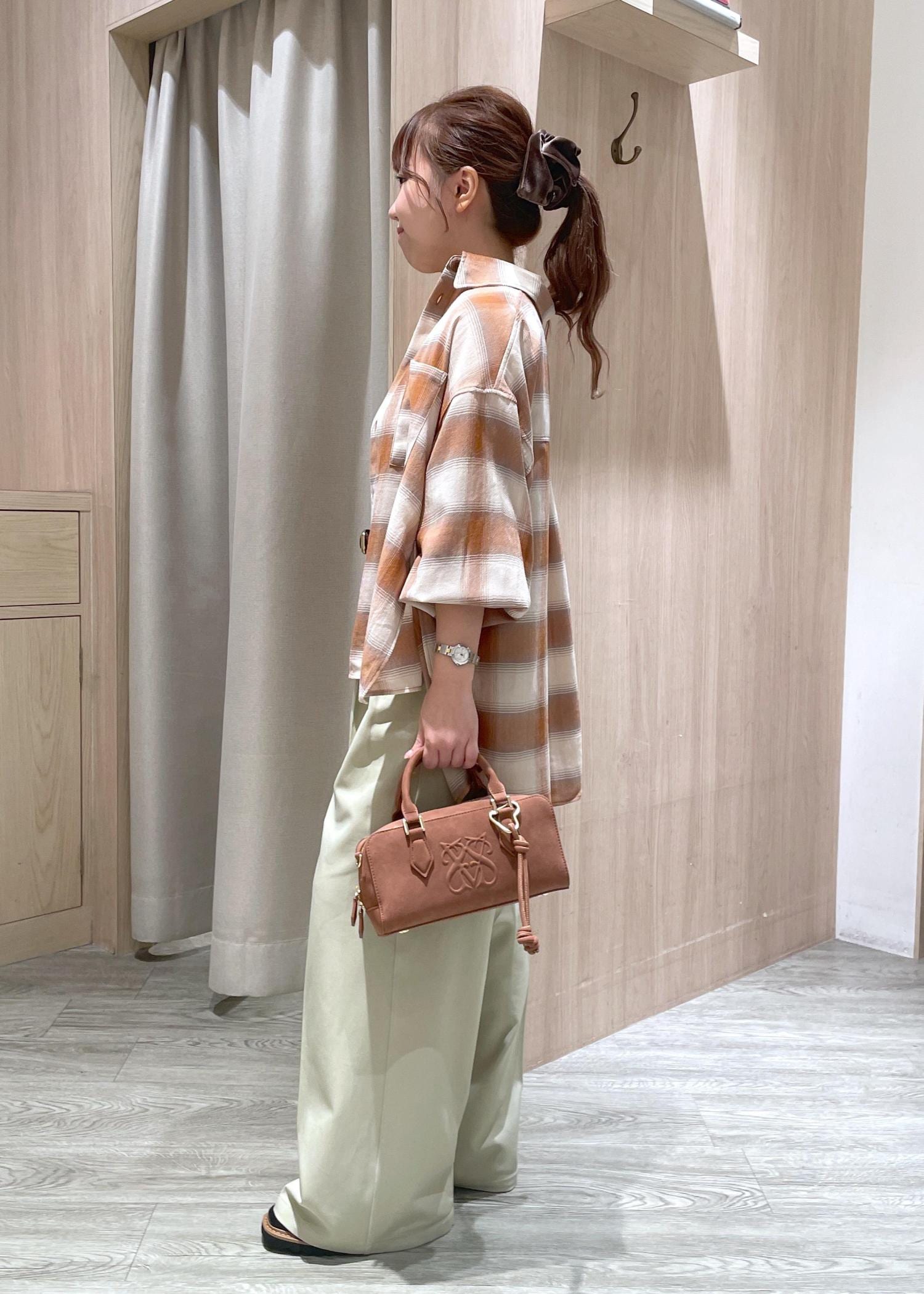 トレンドのオンブレチェックのシャツにワイドパンツを合わせたキレイめカジュアルコーデです♪