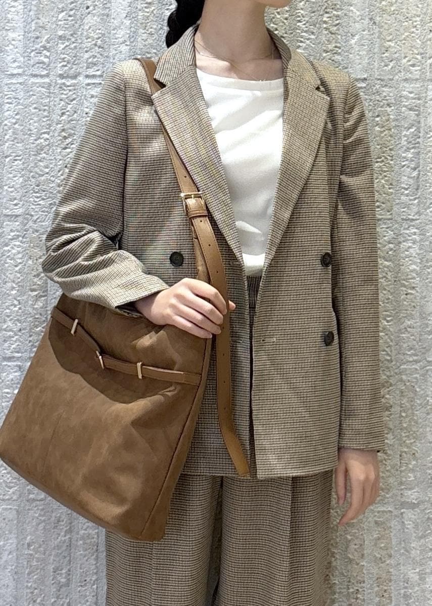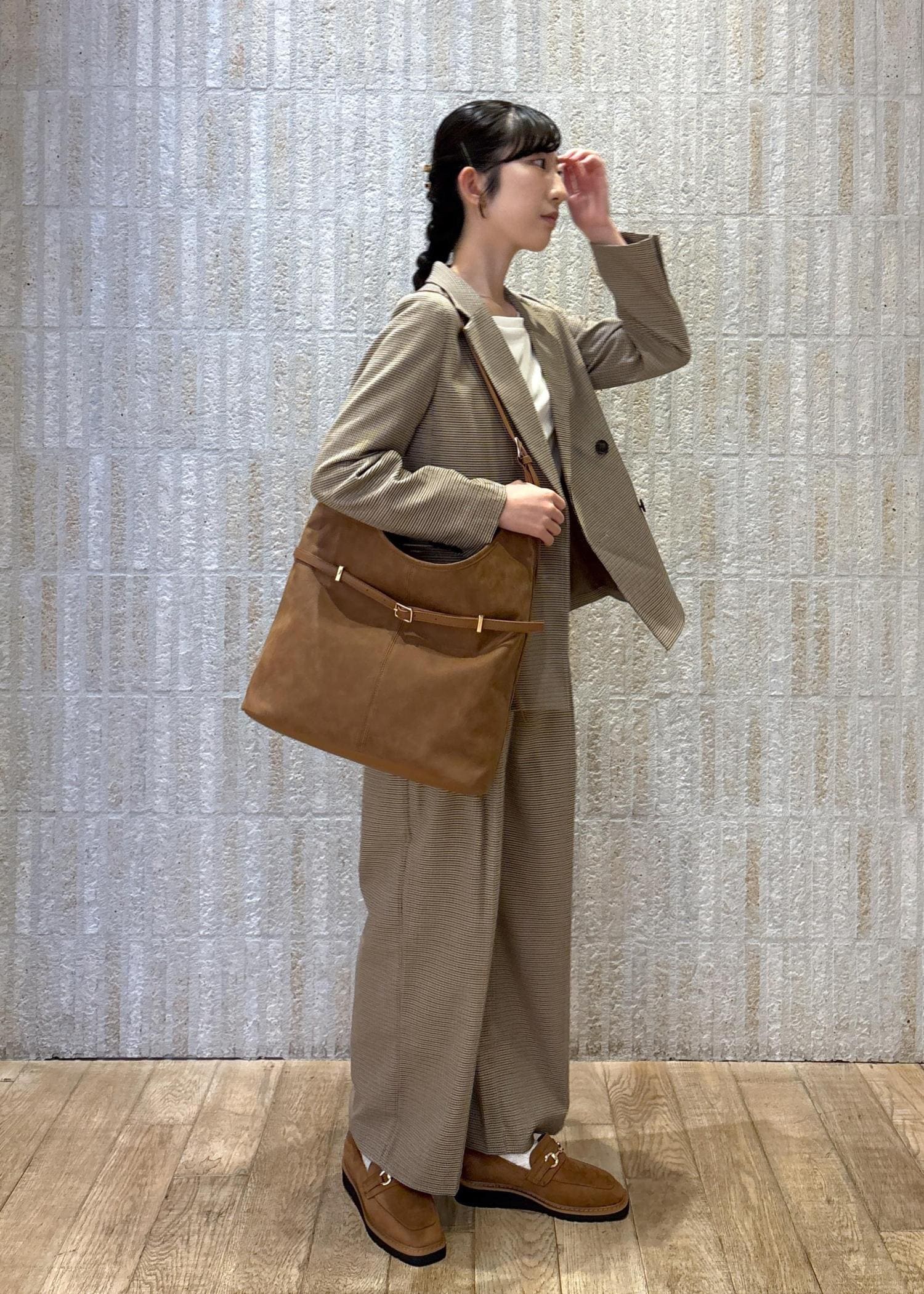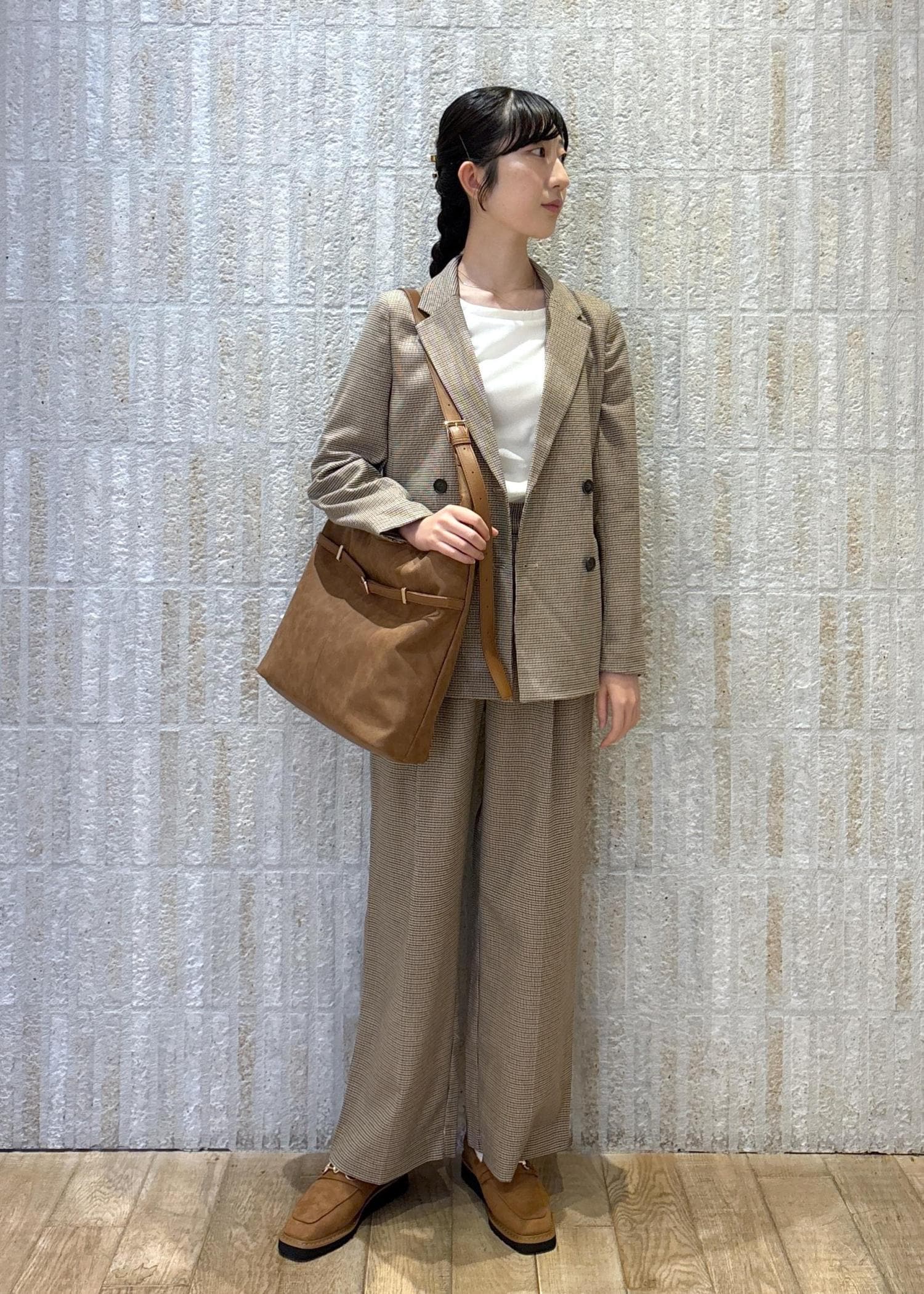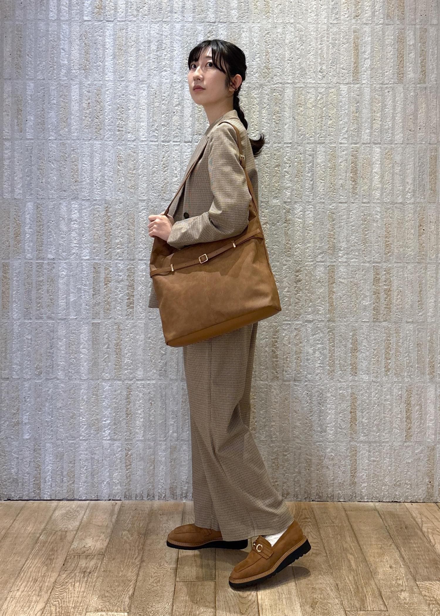 美easyシリーズのジャケットのパンツのセットアップに、スエードやベロアなどの秋冬を感じるアイテムを足した、秋コーデです!