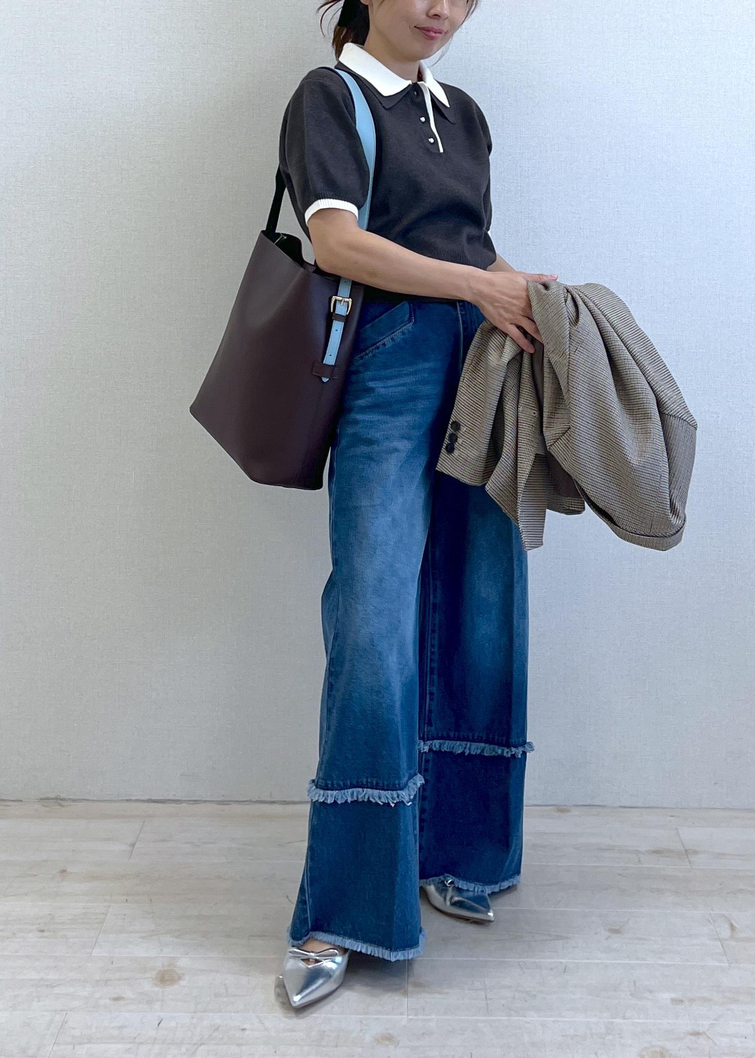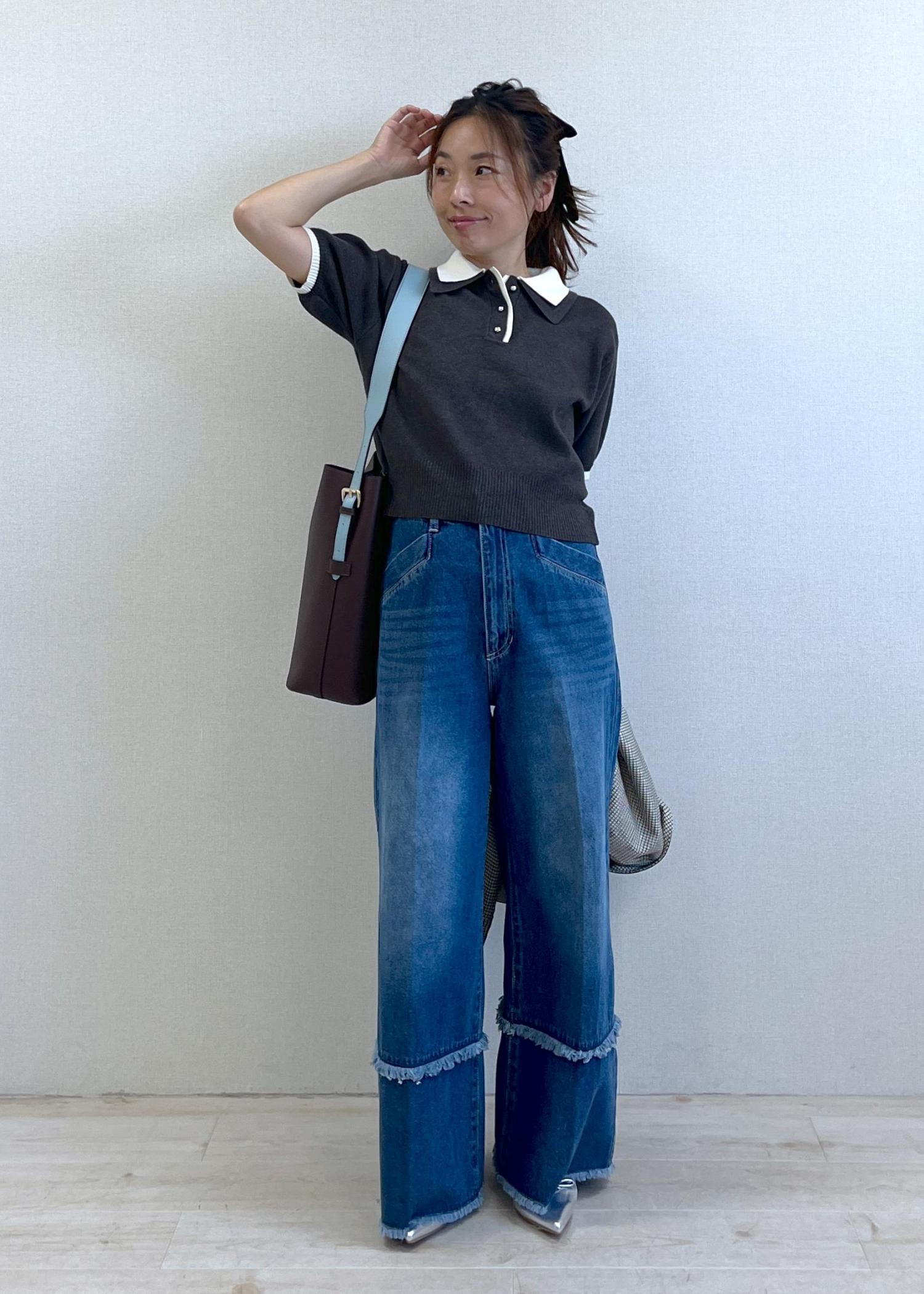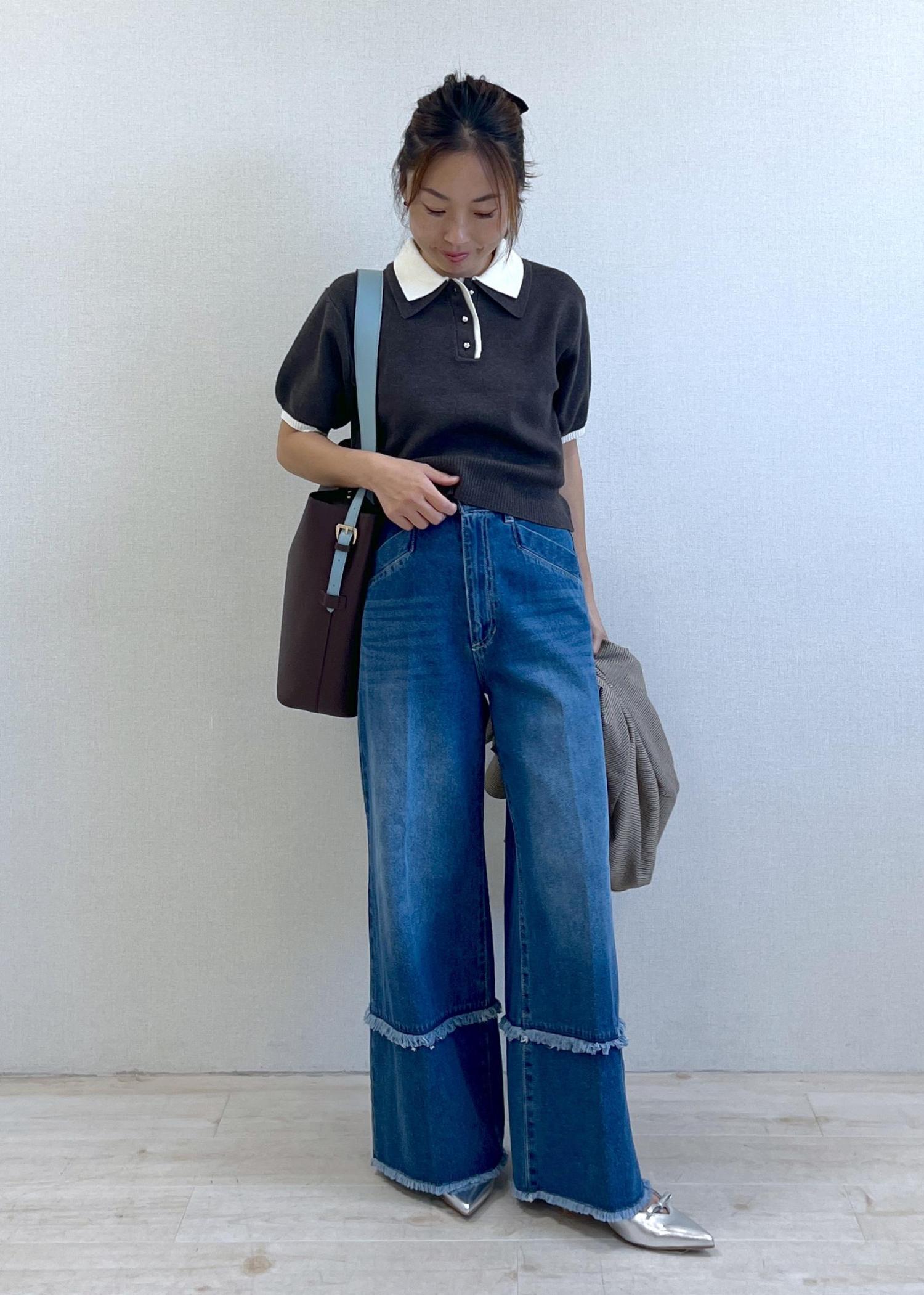 ダブル衿が目を惹くポロニットは、一枚で着映えする主役トップス。クラシカルな印象を残しつつ、デニムと合わせてデイリーに落とし込むことで、ほどよく力の抜けた大人のフレンチカジュアルに仕上がります。