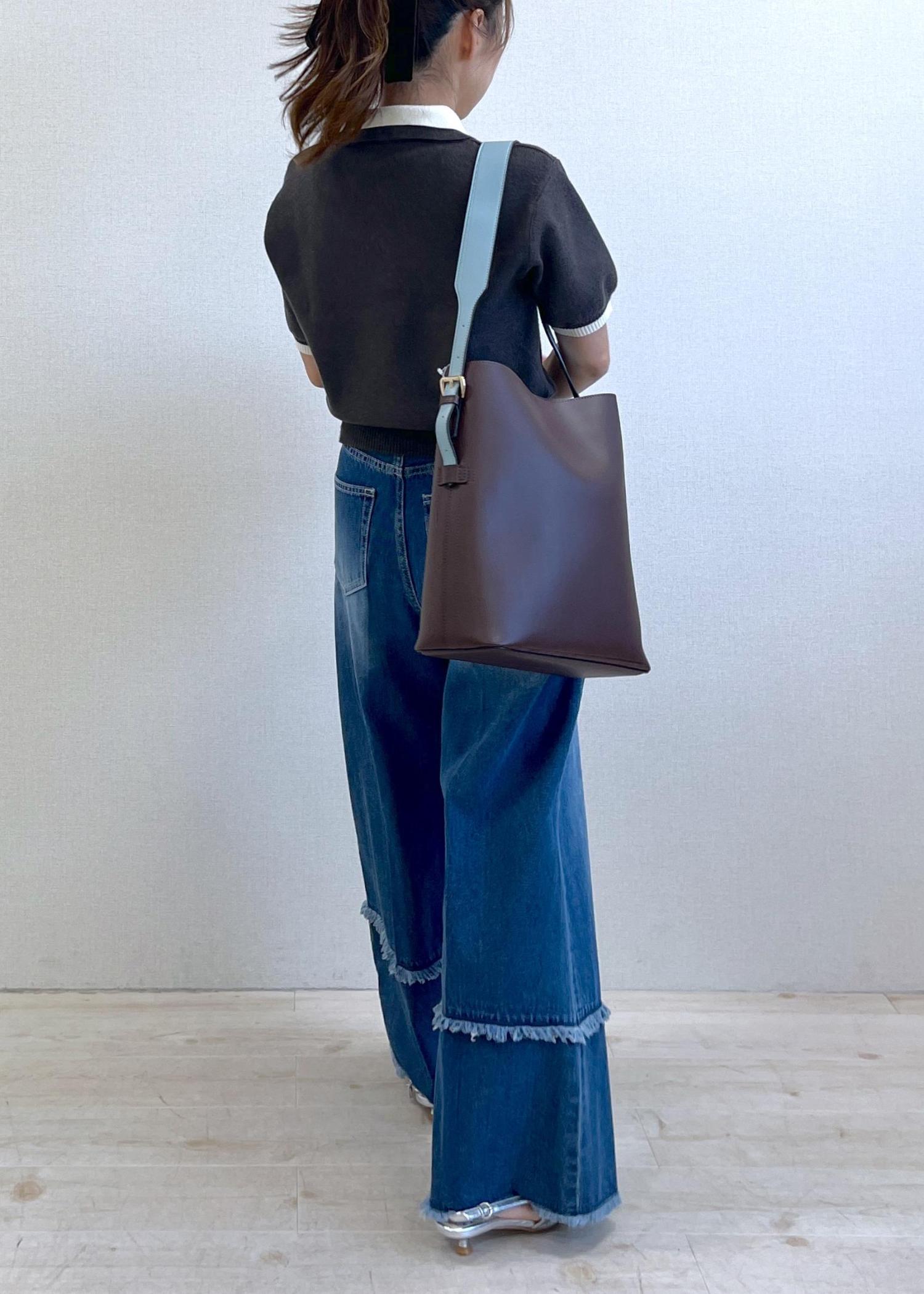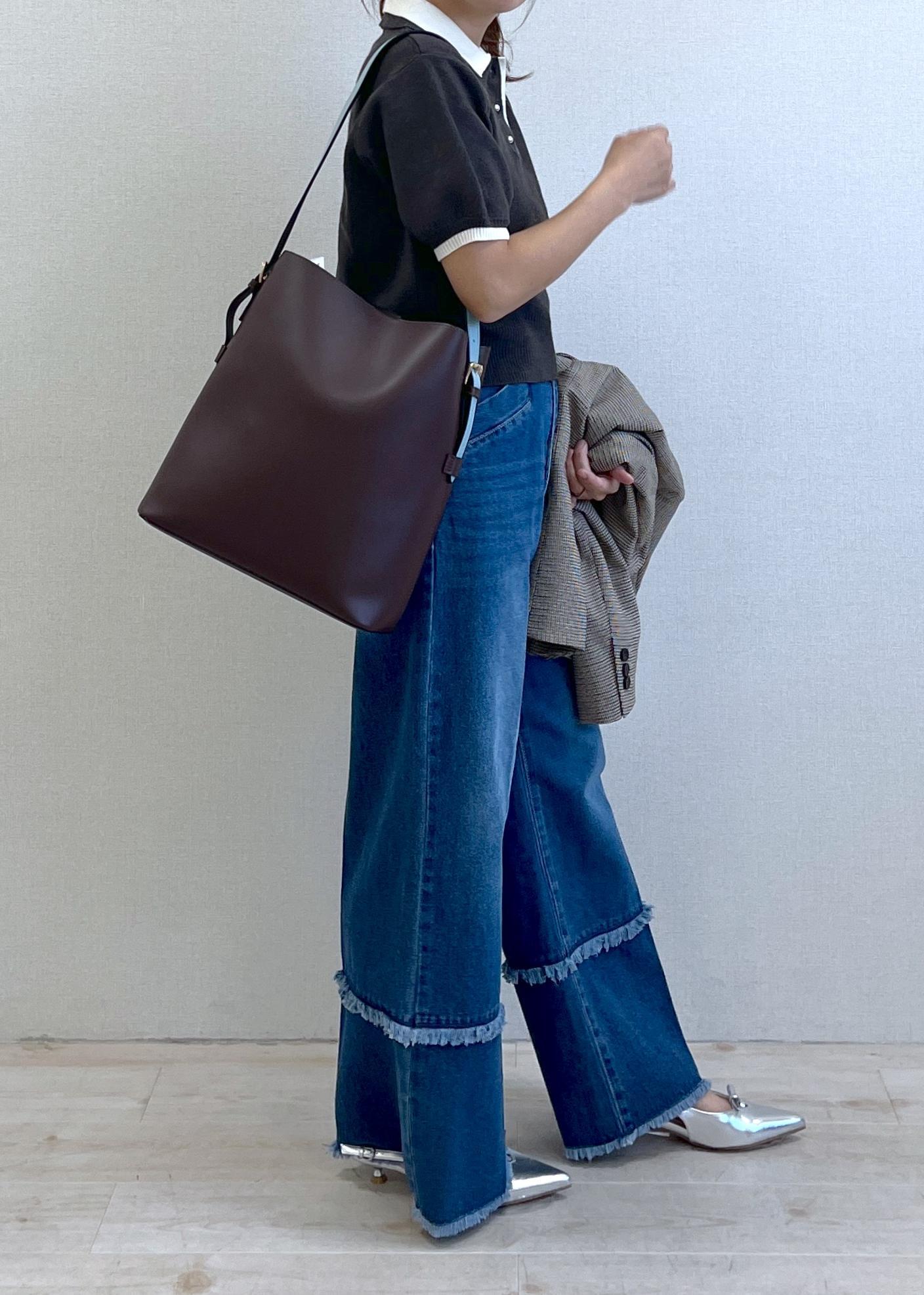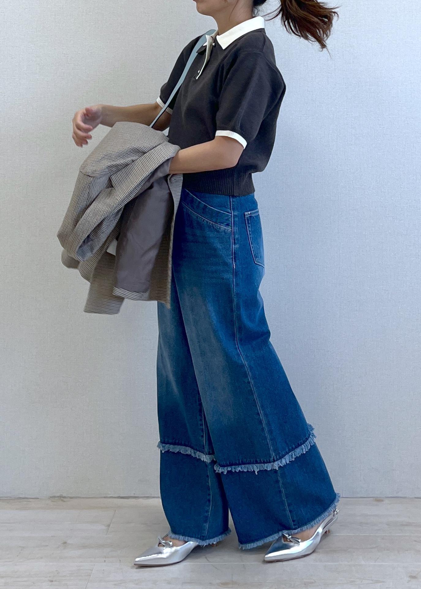 ダブル衿が目を惹くポロニットは、一枚で着映えする主役トップス。クラシカルな印象を残しつつ、デニムと合わせてデイリーに落とし込むことで、ほどよく力の抜けた大人のフレンチカジュアルに仕上がります。