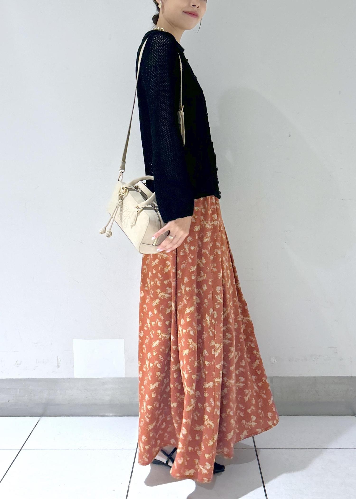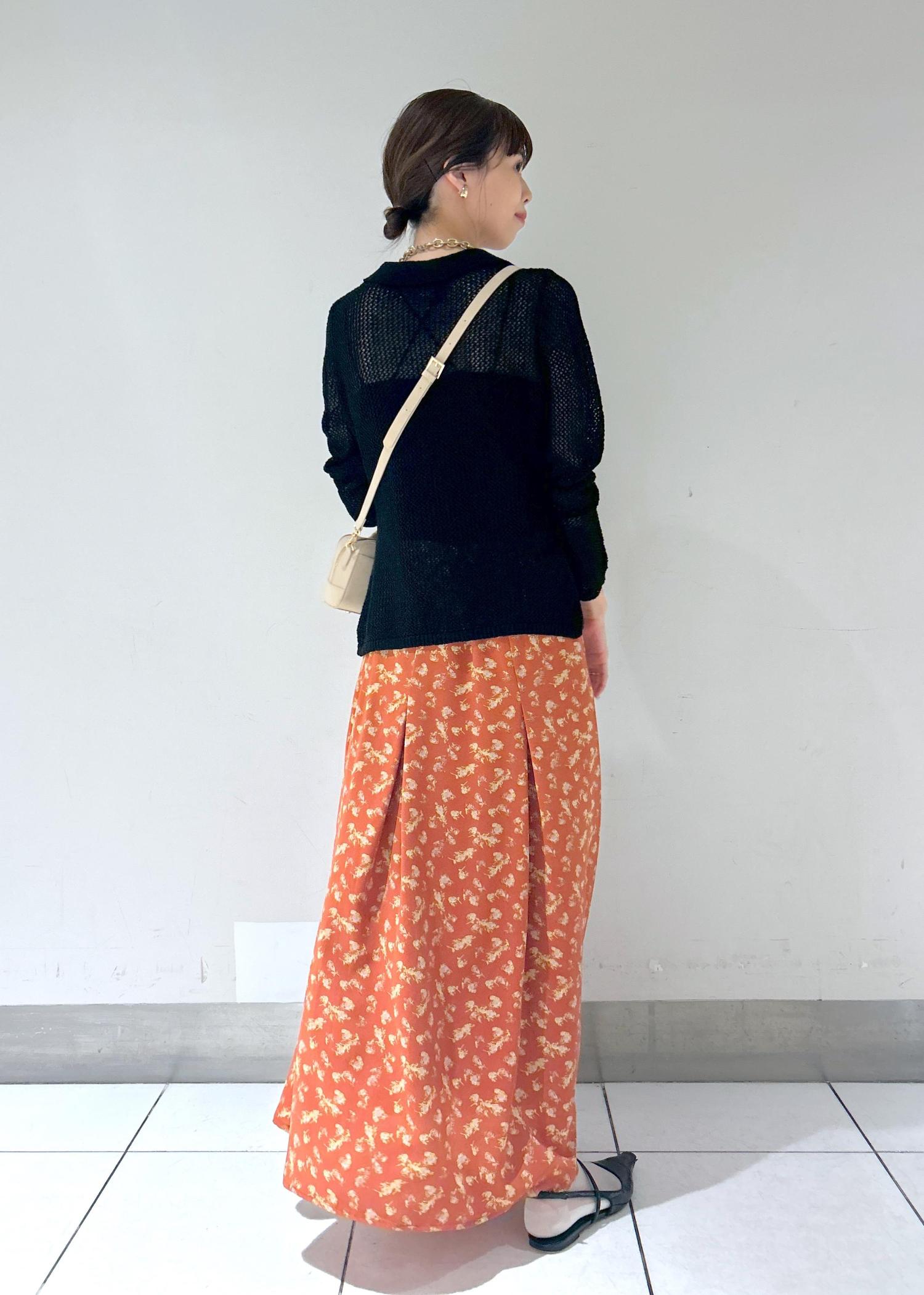 柄のスカートを合わせた女っぽスタイル。
