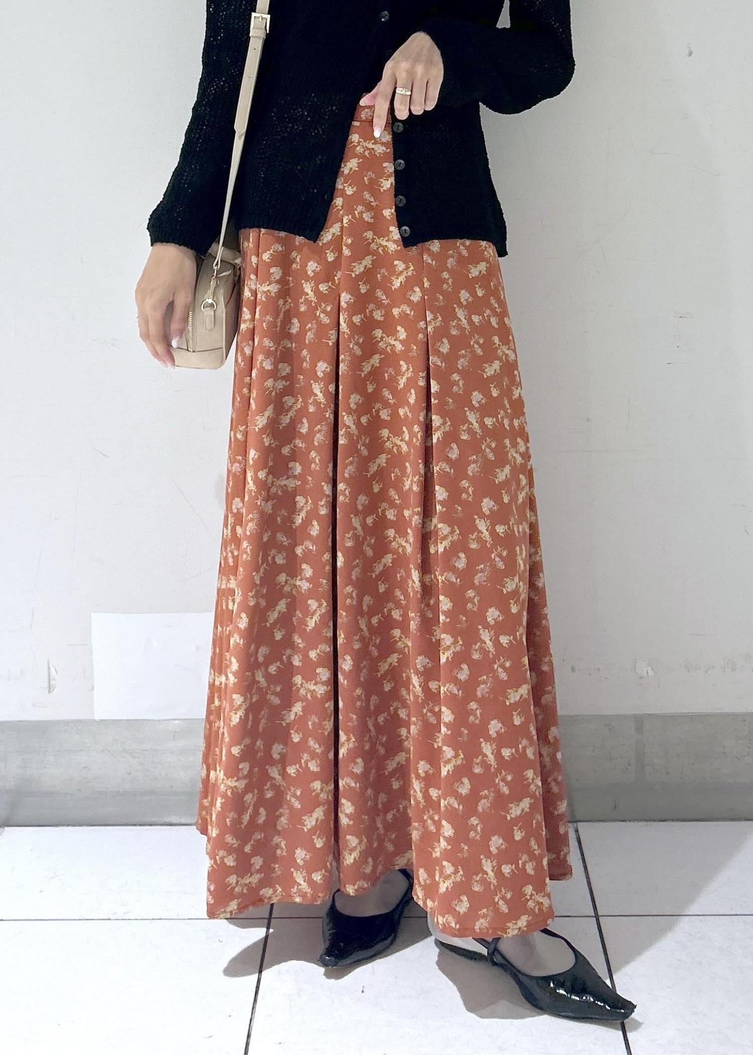 VIS【WEB限定】アソート柄セミフレアロングスカートレンガ系 / F¥3,295レビュー身長164cmで足首が見えるくらいの丈感。