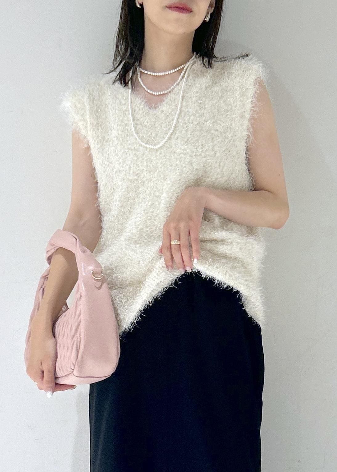9月に入りそろそろ秋服が着たくなりますが、暑い日は続くので、、フェザーやパール、靴下など小物や素材で秋らしさを出しました☺︎