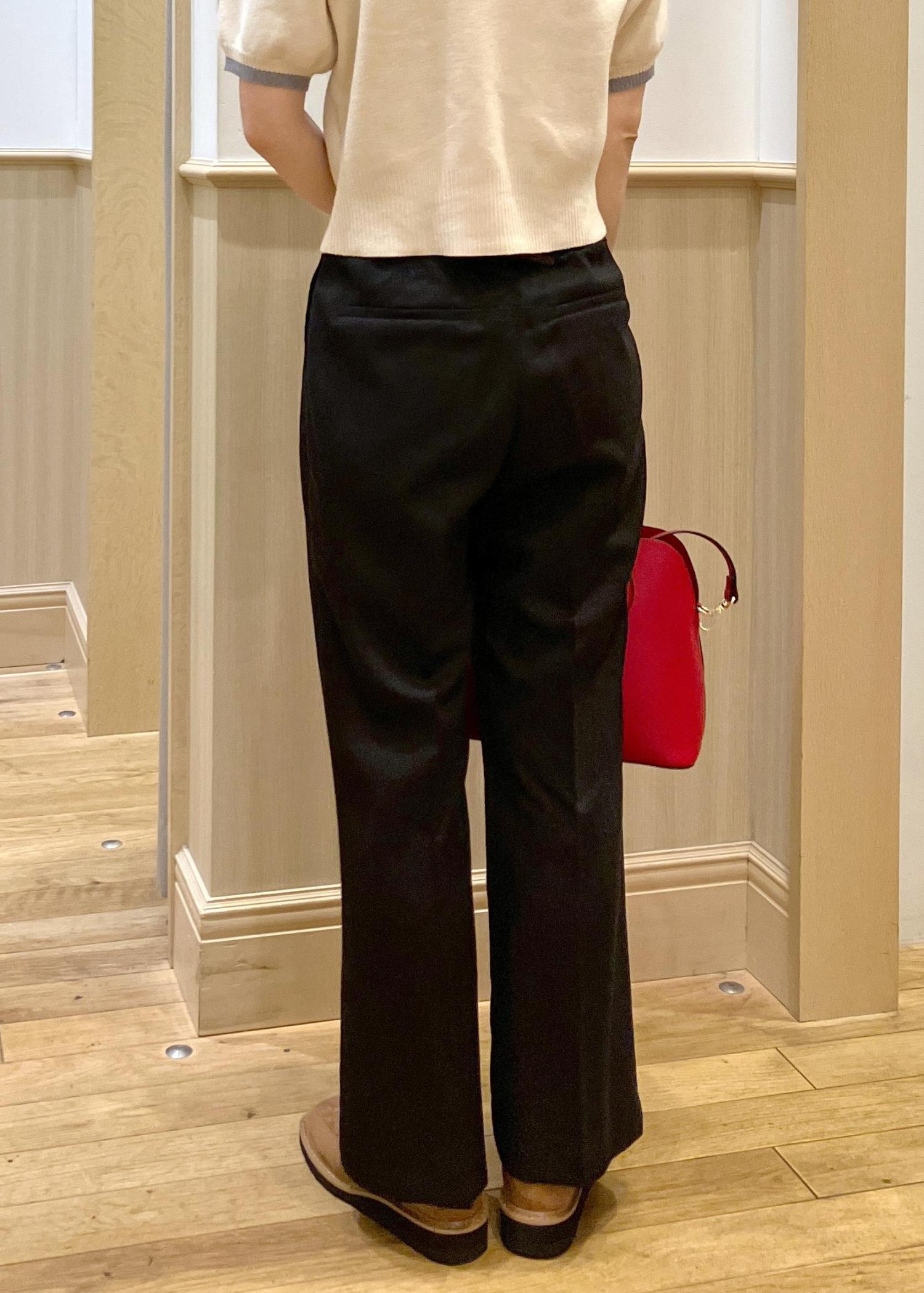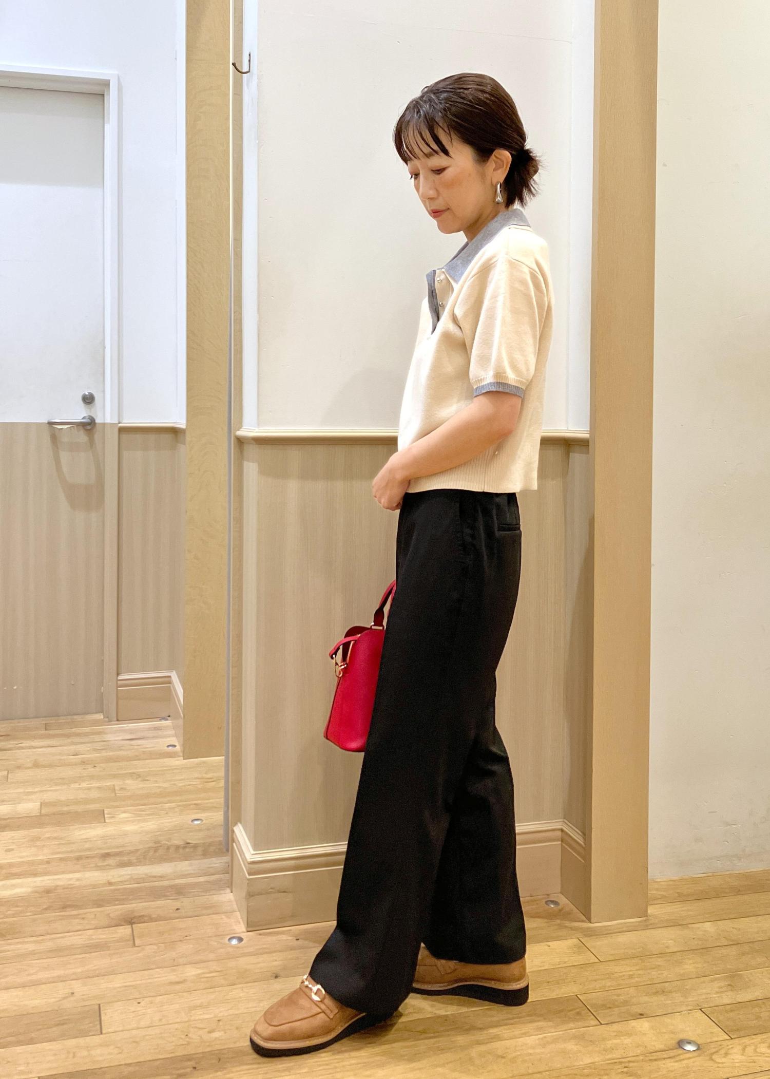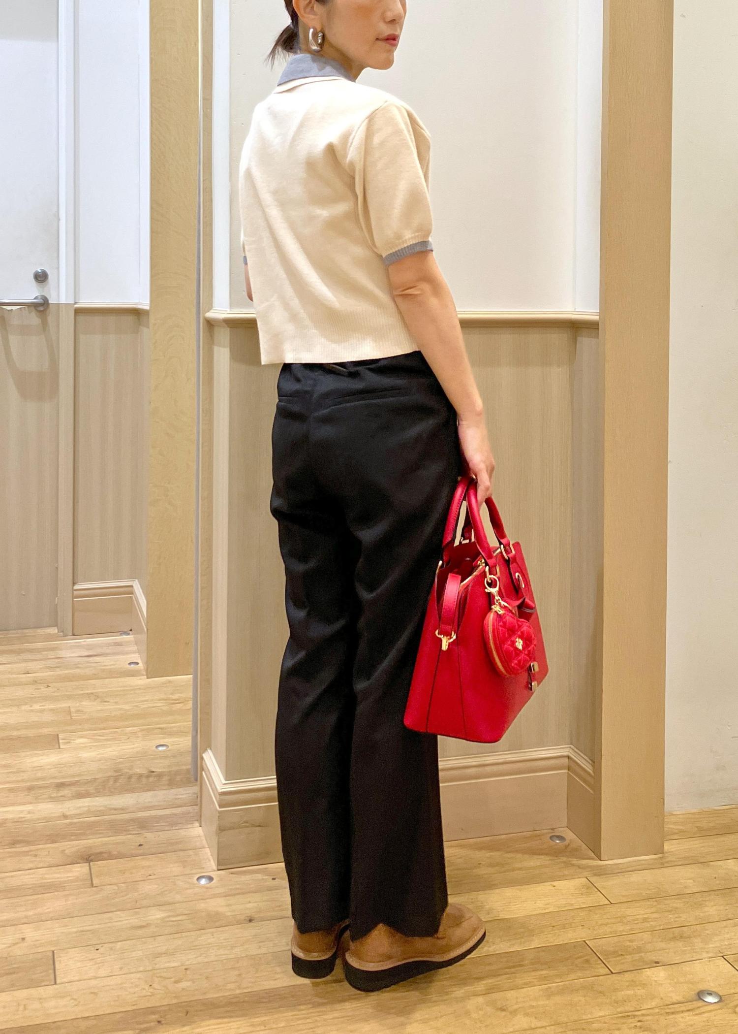 SNSで大人気のポロトップスをハンサムにブラックのフレアパンツで合わせてみました。