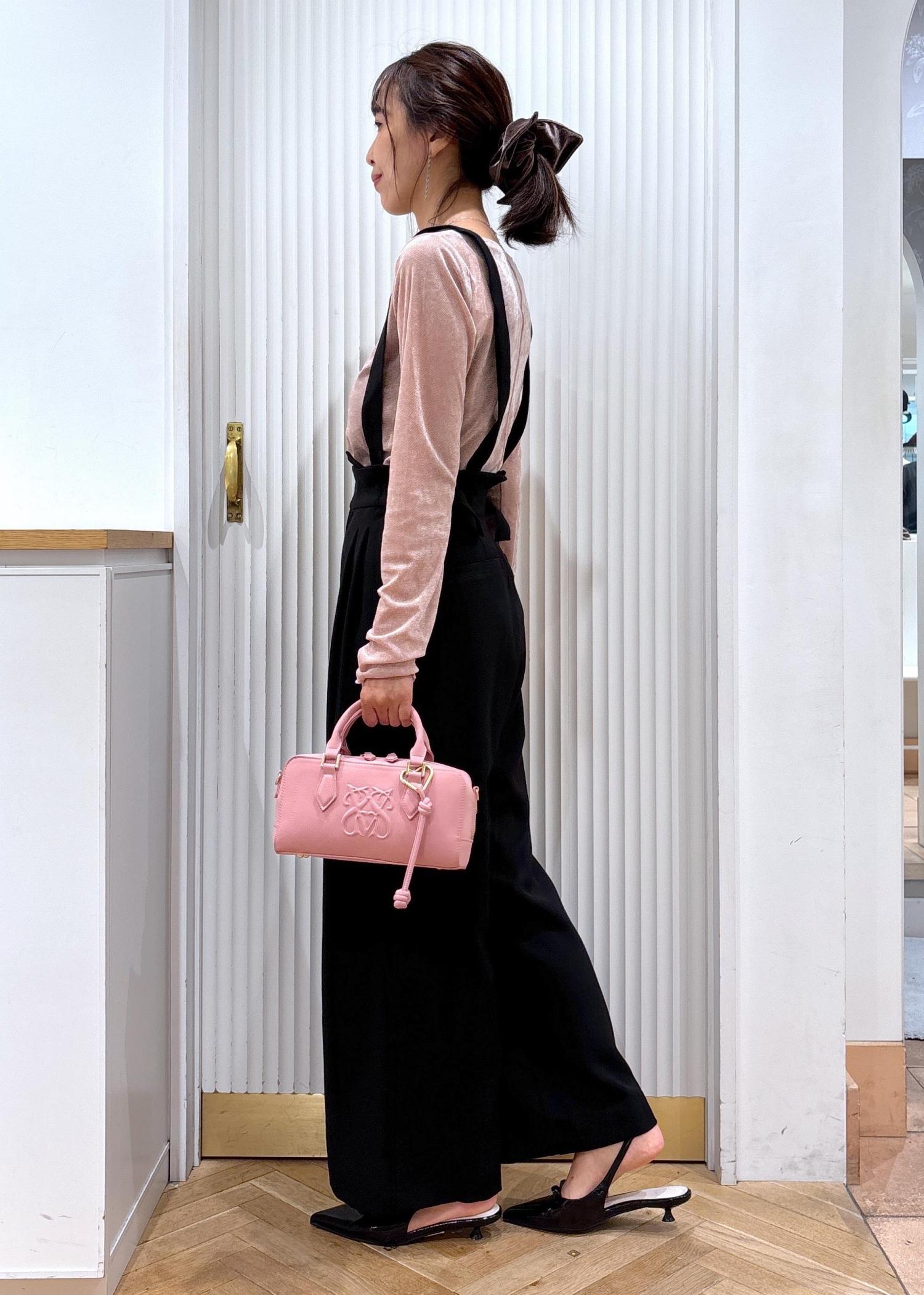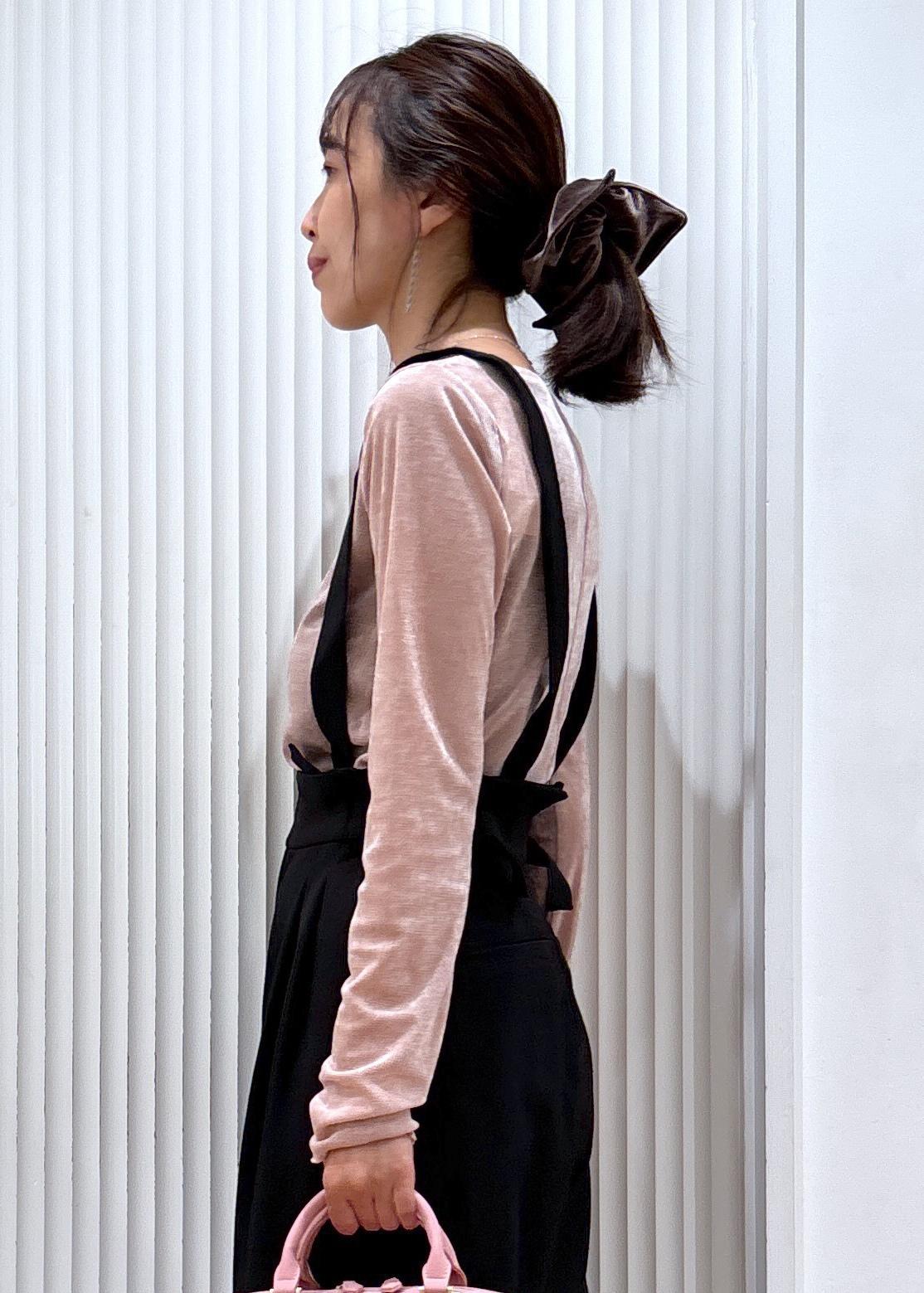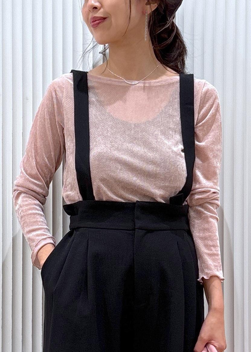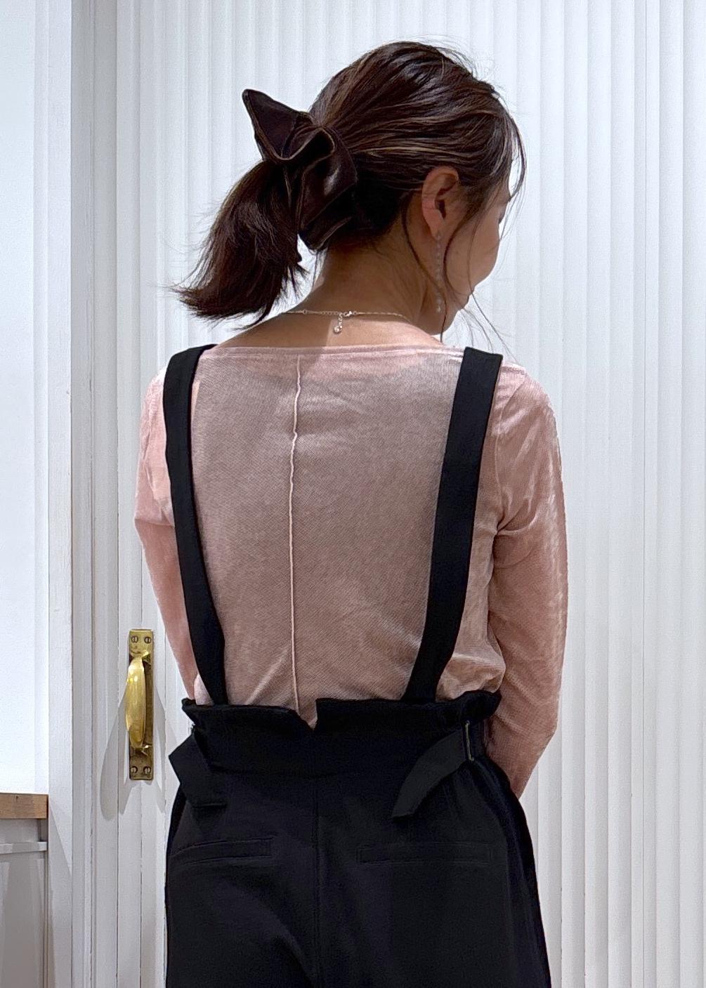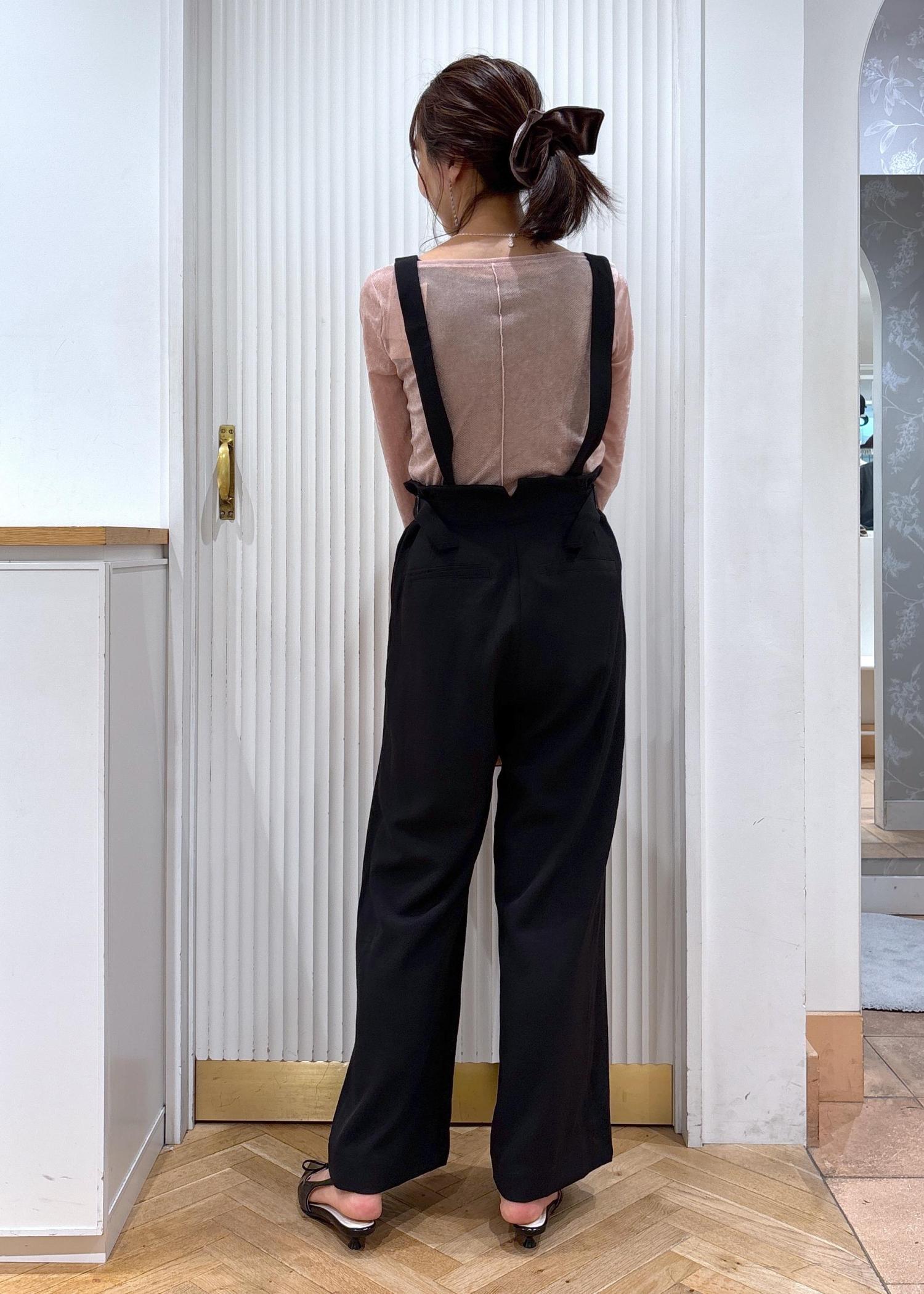 ピンクのベロアトップスにサスペンダーパンツを合わせた大人カジュアルスタイリングです。