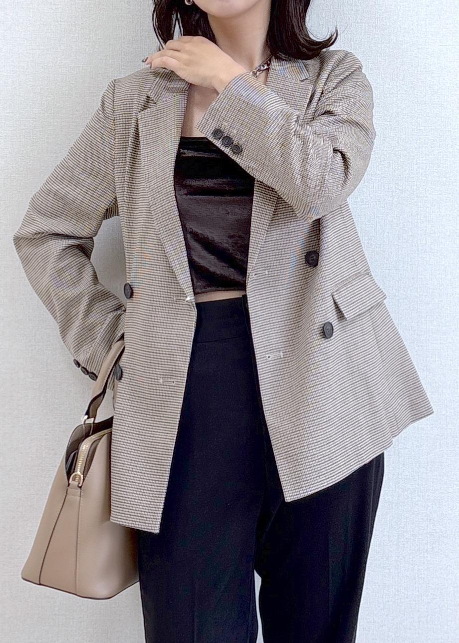 ジャケットとセットで使えるパンツを合わせるとよりカチッと締まった印象に仕上がりますが、私はスタイルアップ効果と少しのカジュアル見えを狙ってフレアパンツをチョイスしました!