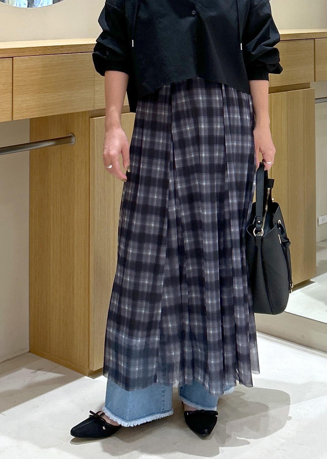 VIS【洗える】チュールプリントチェックスカートブラック系 / F¥4,612レビュー151cm、ウエストジャストで着用して足首が少し見える長さでした。