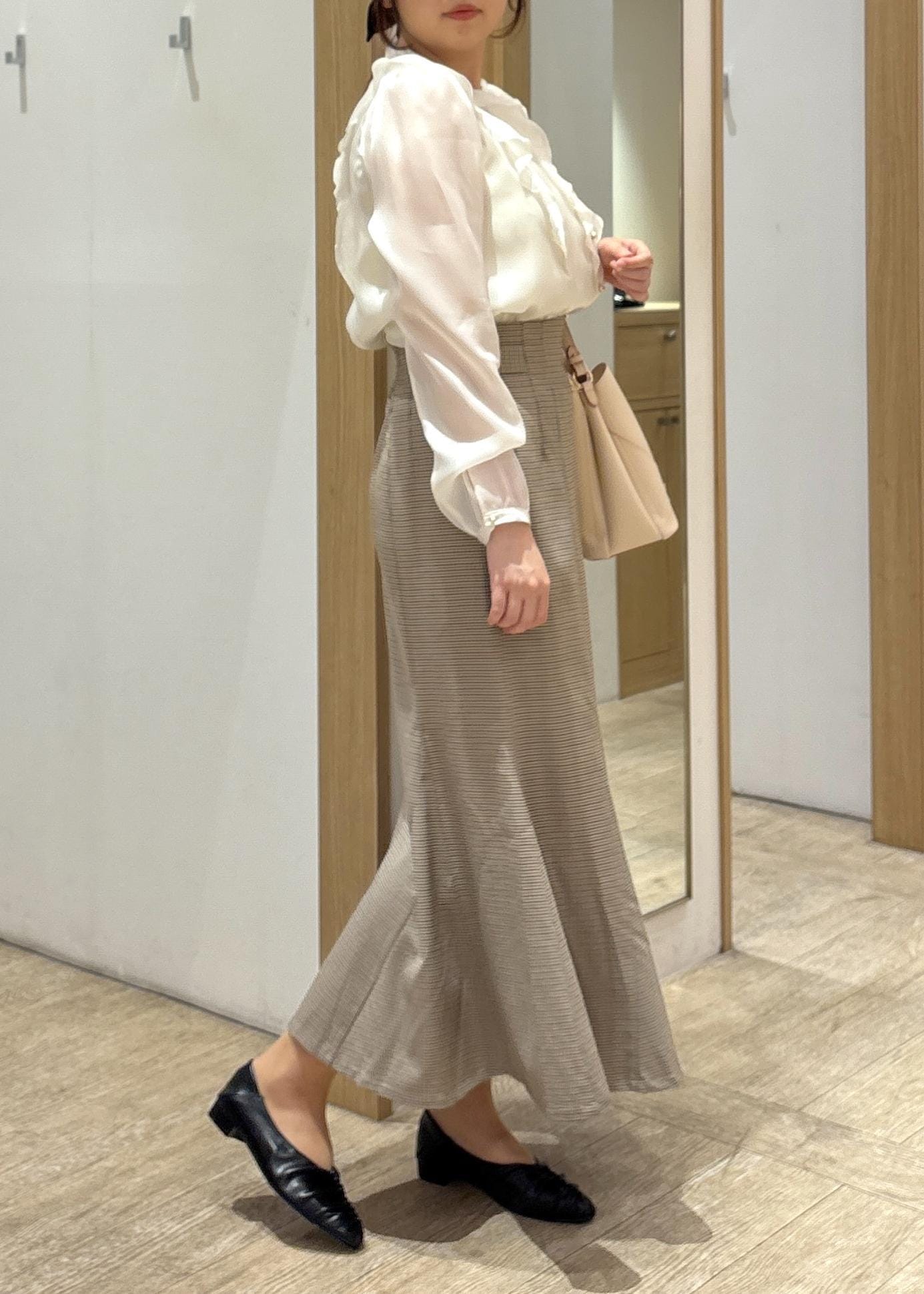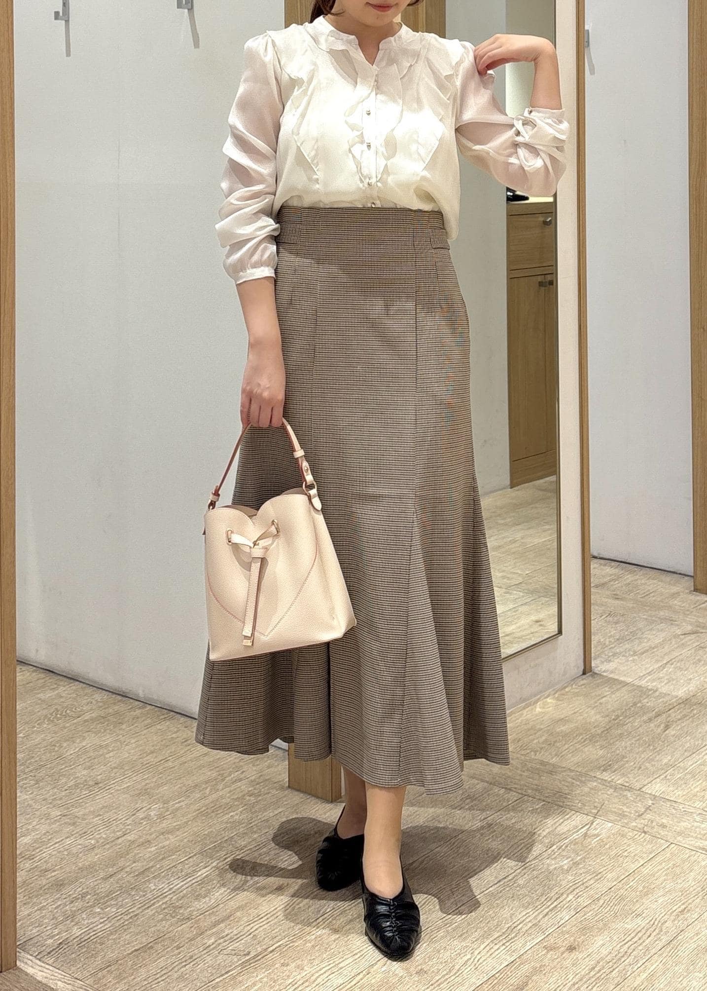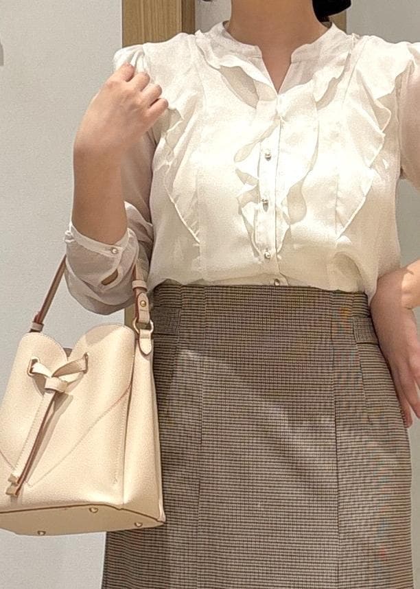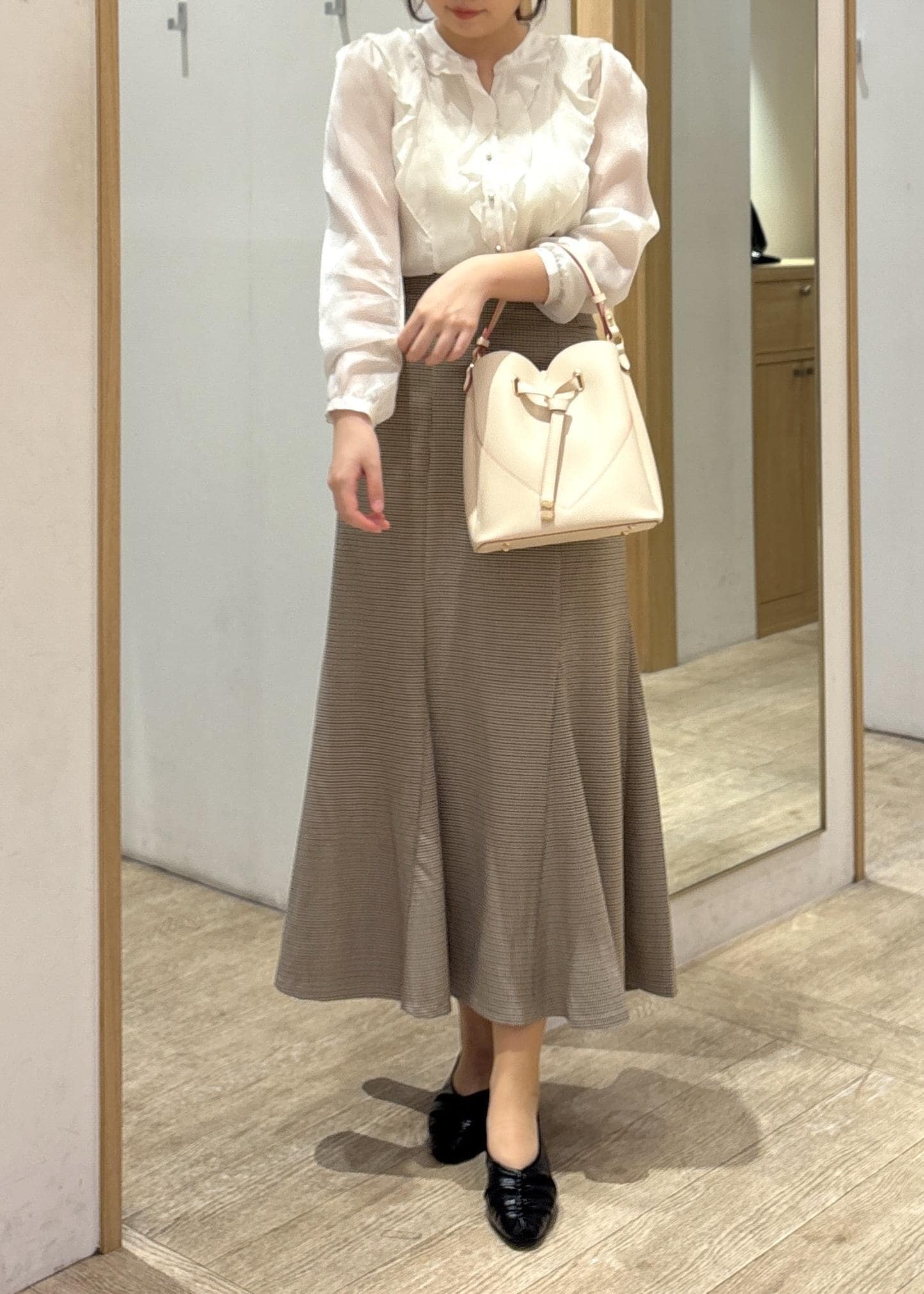 オフィスにもデートにも使いやすい雰囲気で、バッグとブラウスの白系トーンが顔周りを明るく見せてくれます。