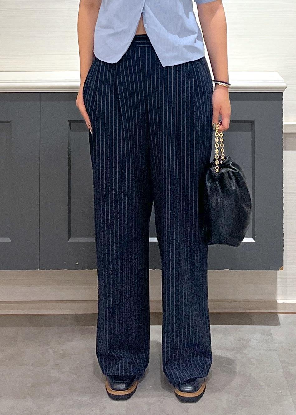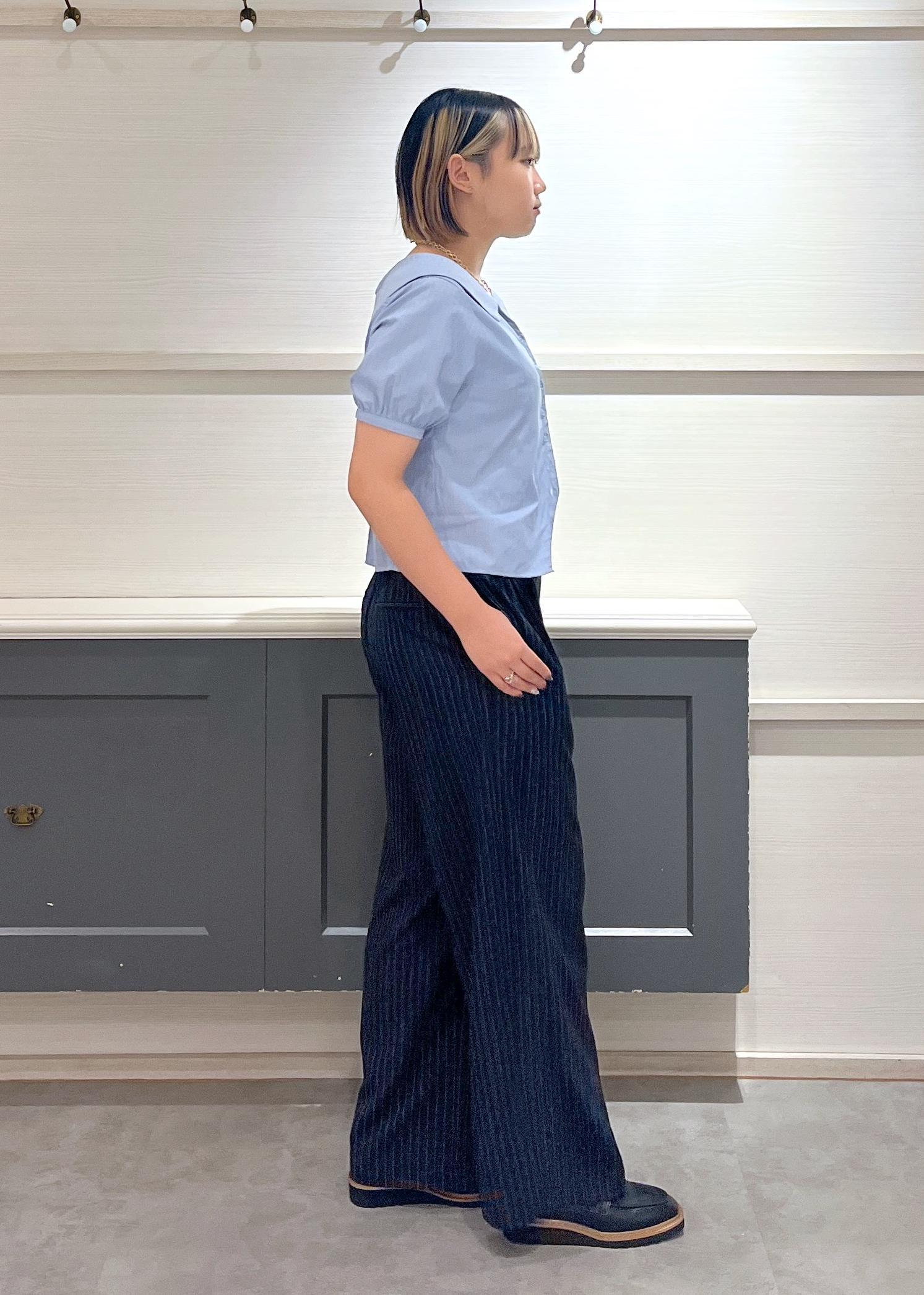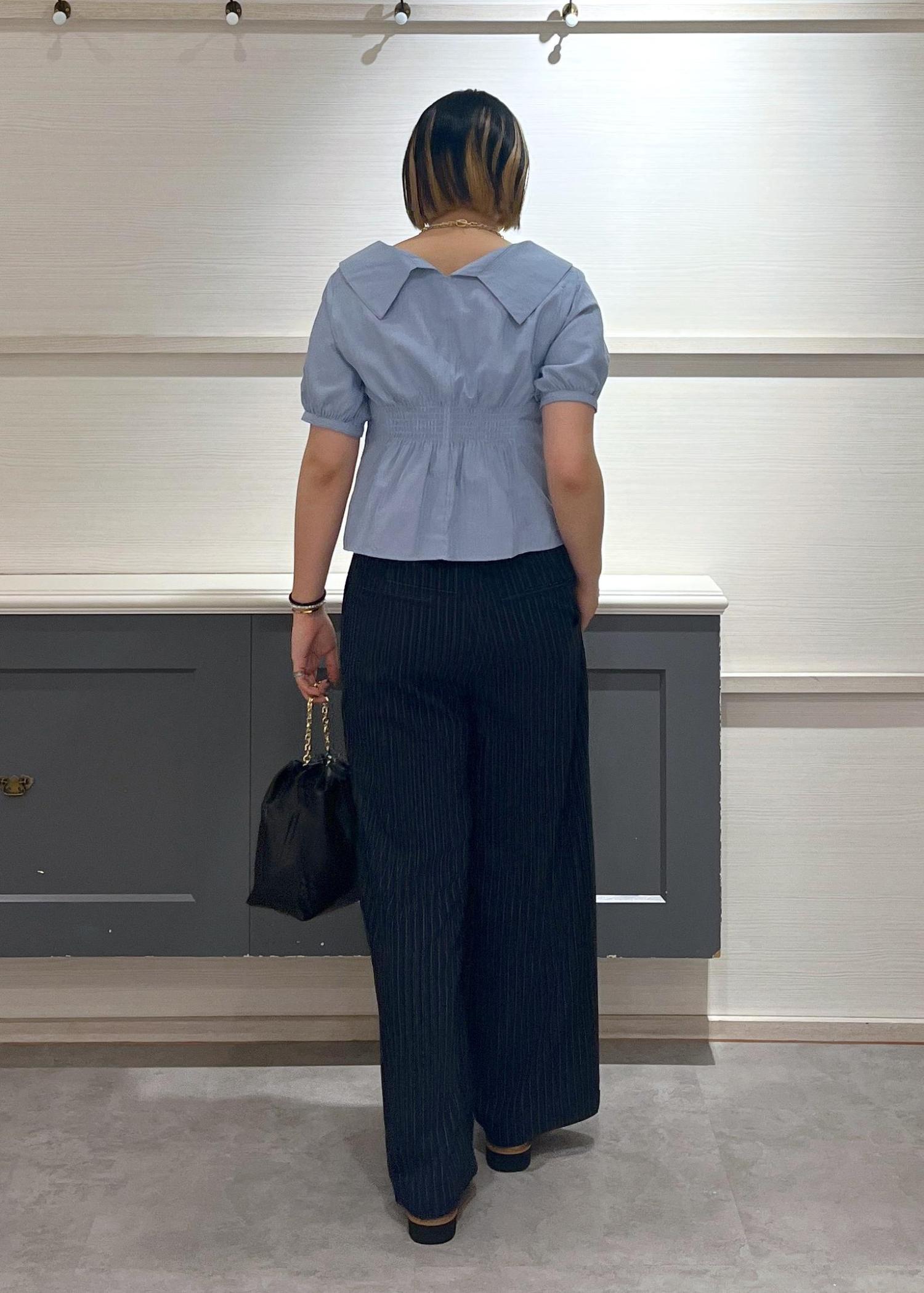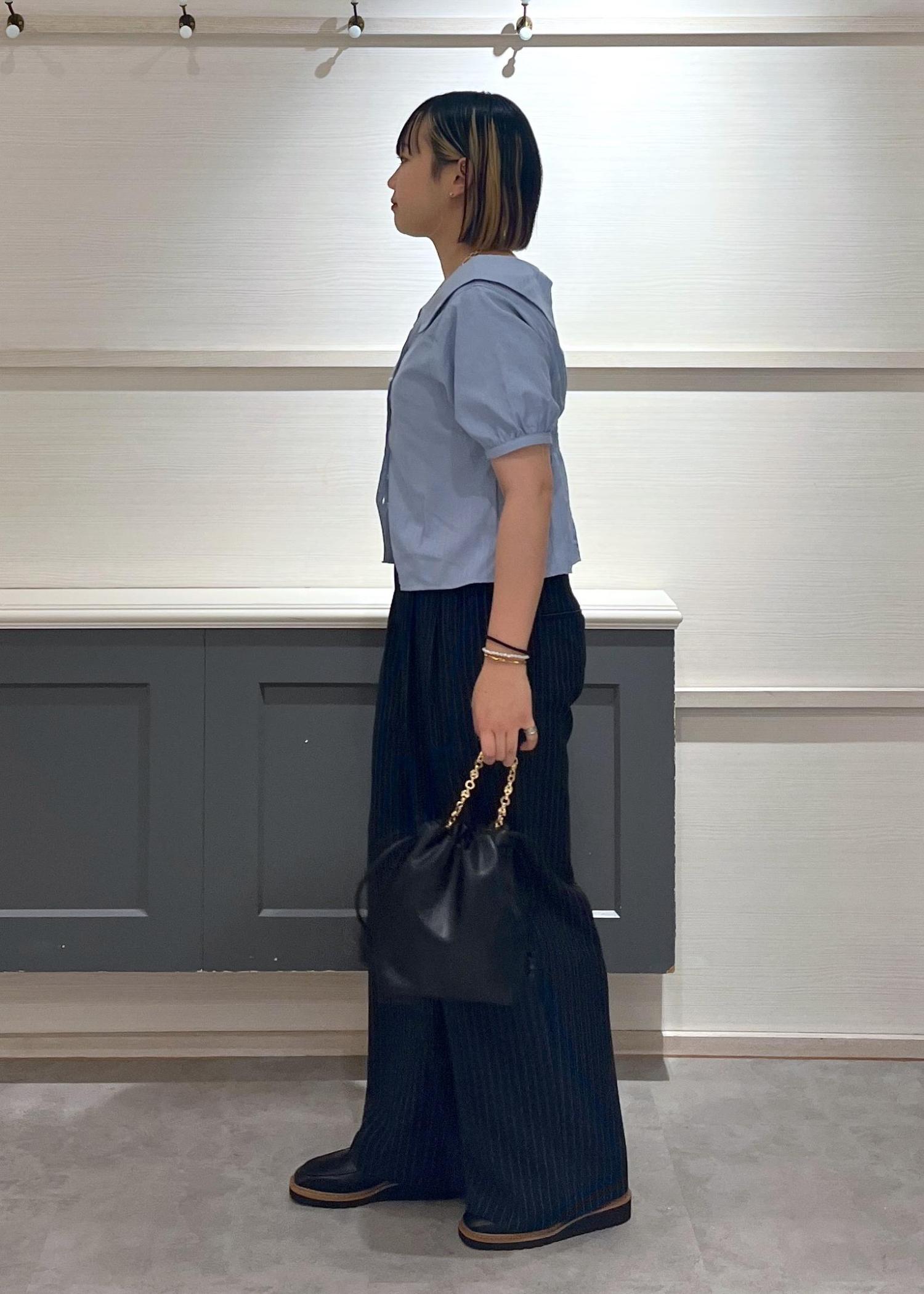 爽やかなブルーシャツ×ネイビーのワイドパンツで