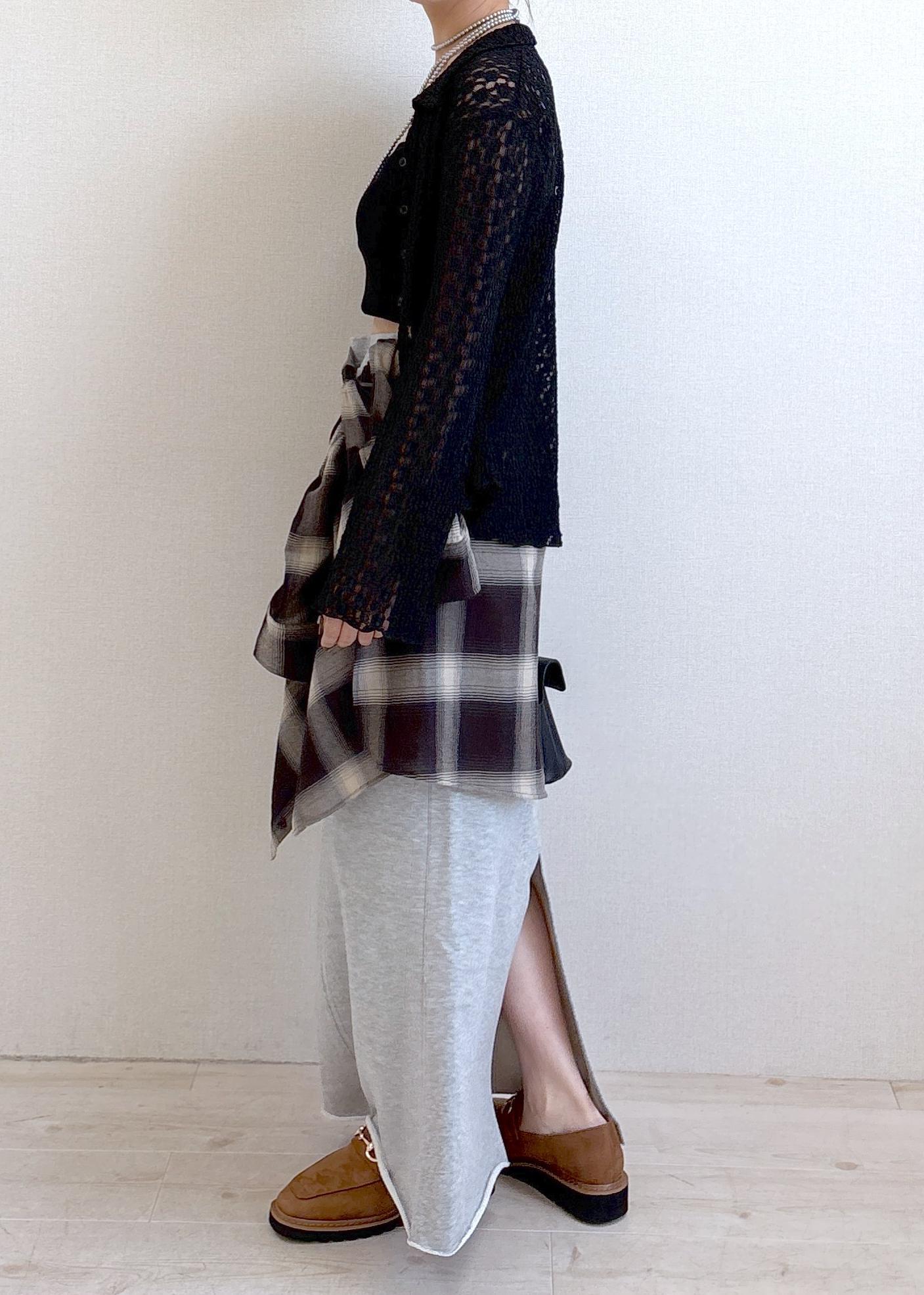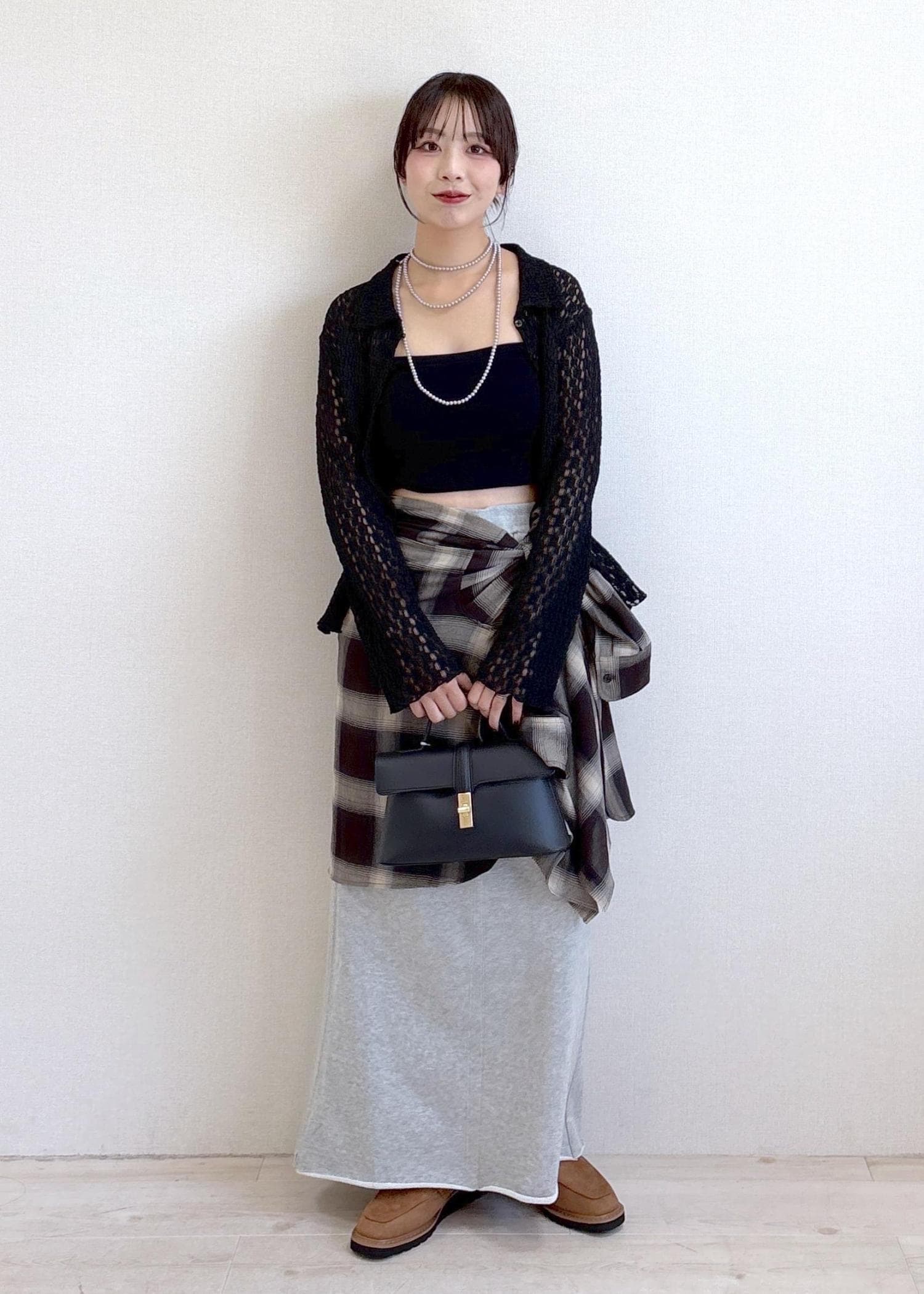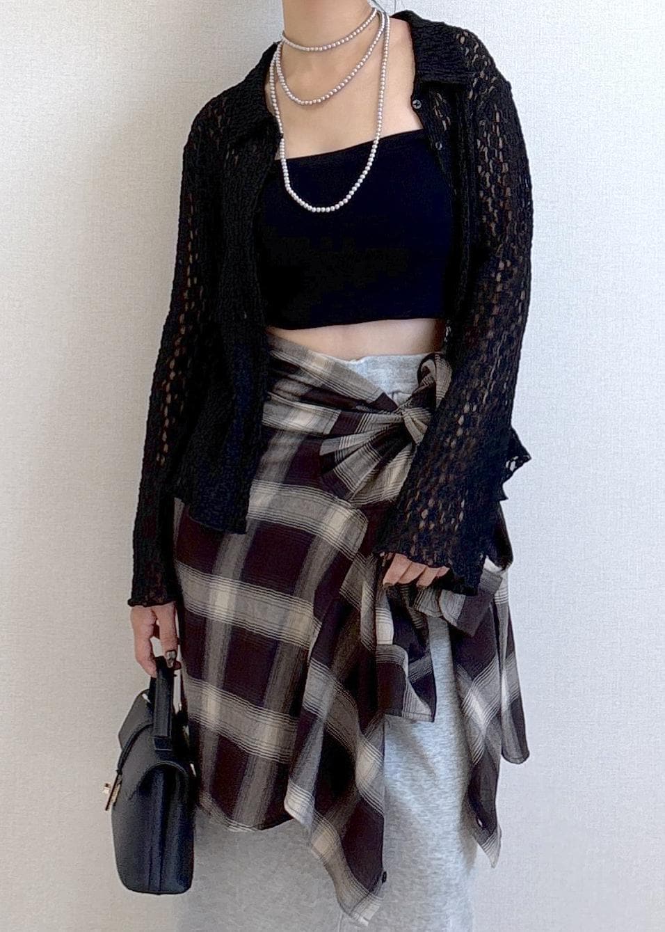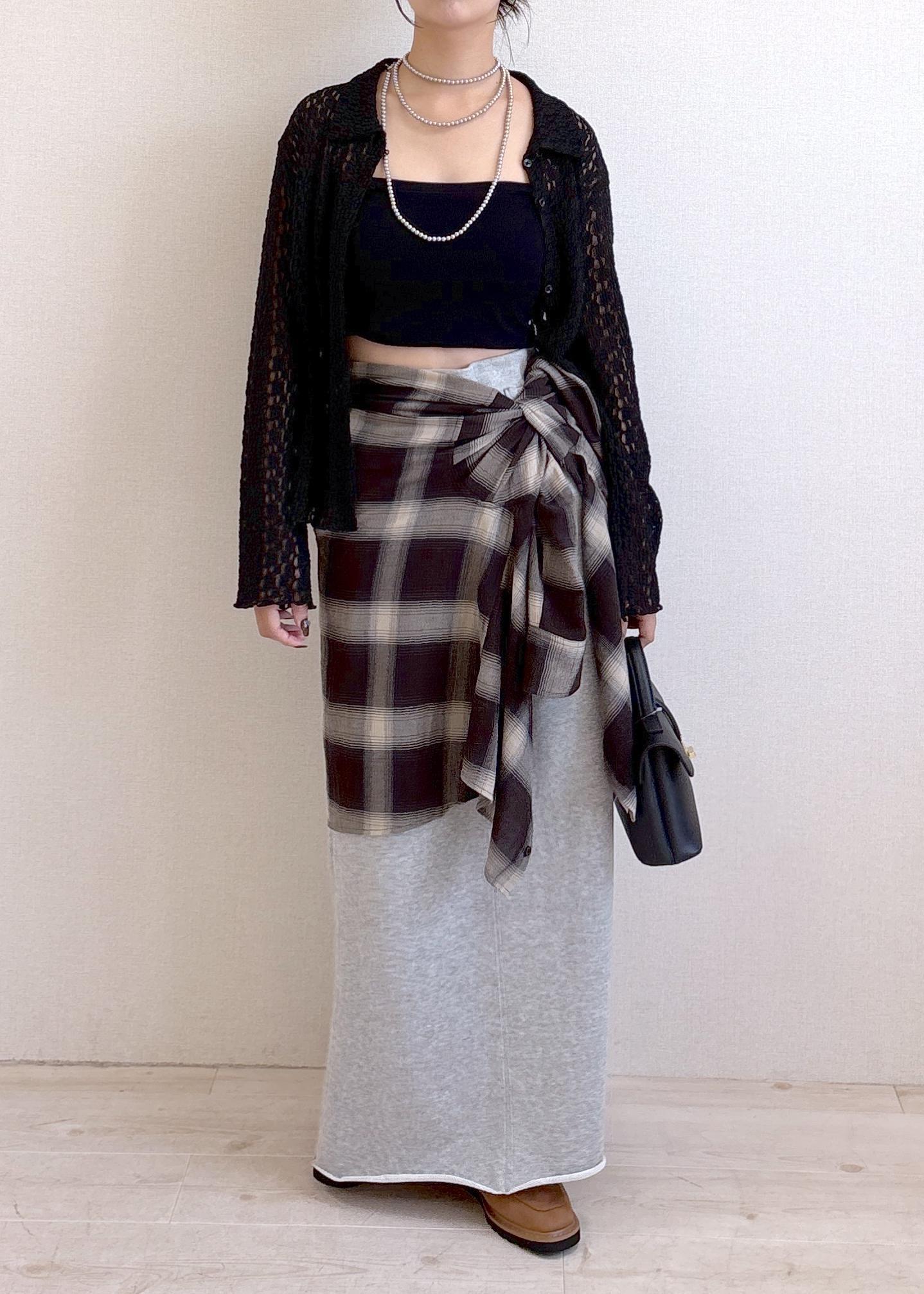 シンプルなスカートに腰巻き!ひと昔流行った巻き方ではなく、結び目をサイドに持ってきてアシンメトリーな見え方にすることで今っぽさもプラスできます◎簡単なアレンジなのでぜひ真似してみてください♡
