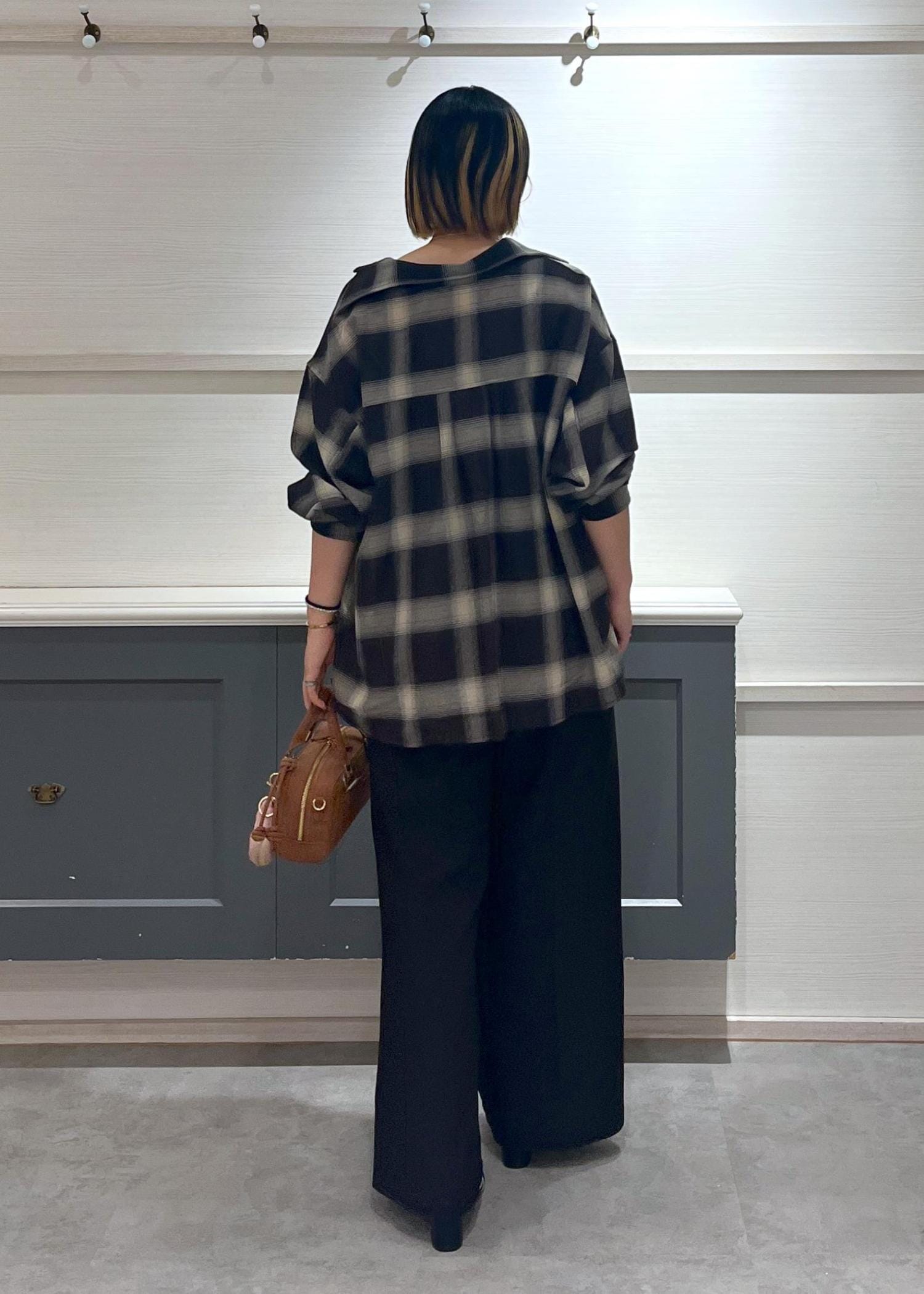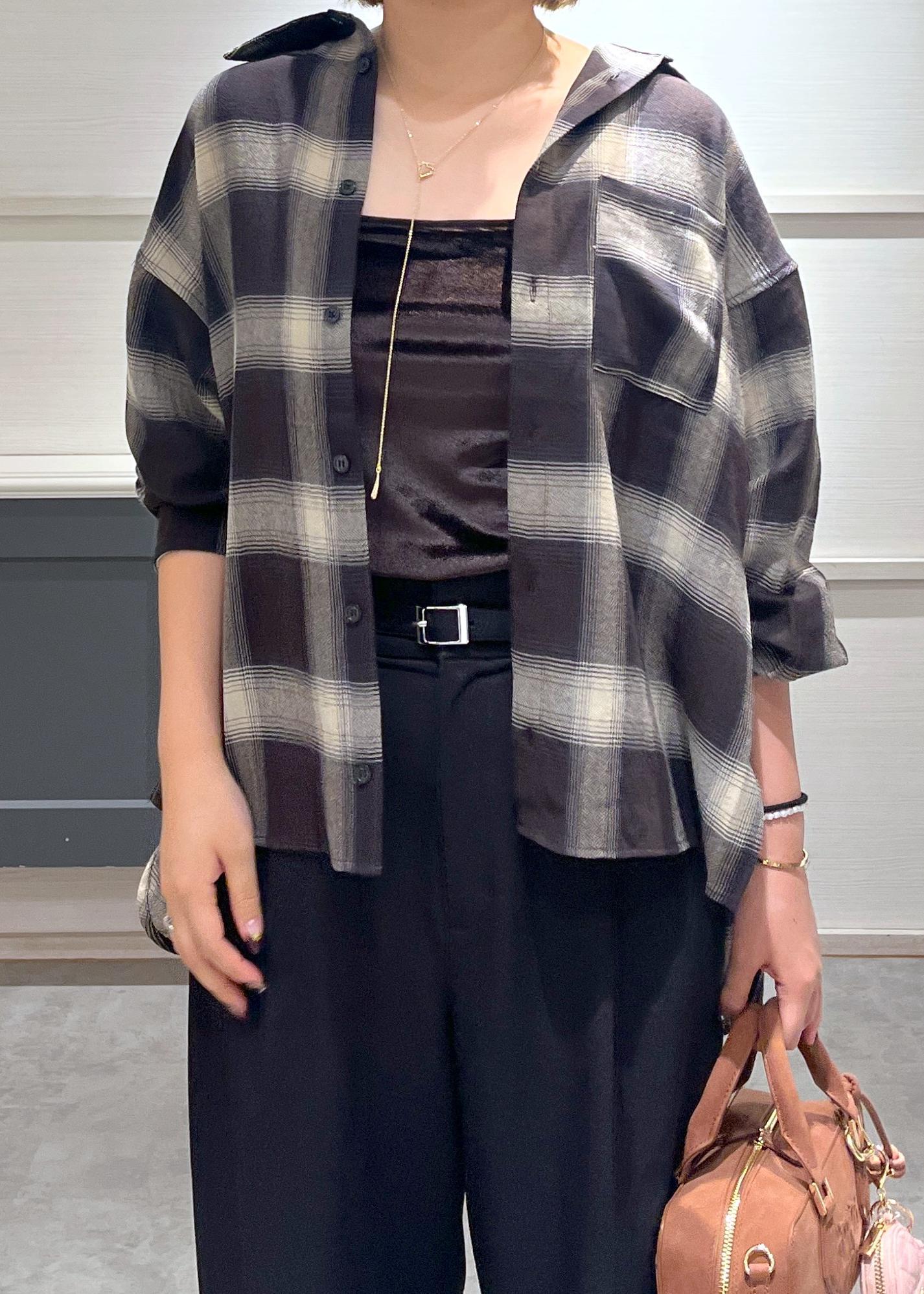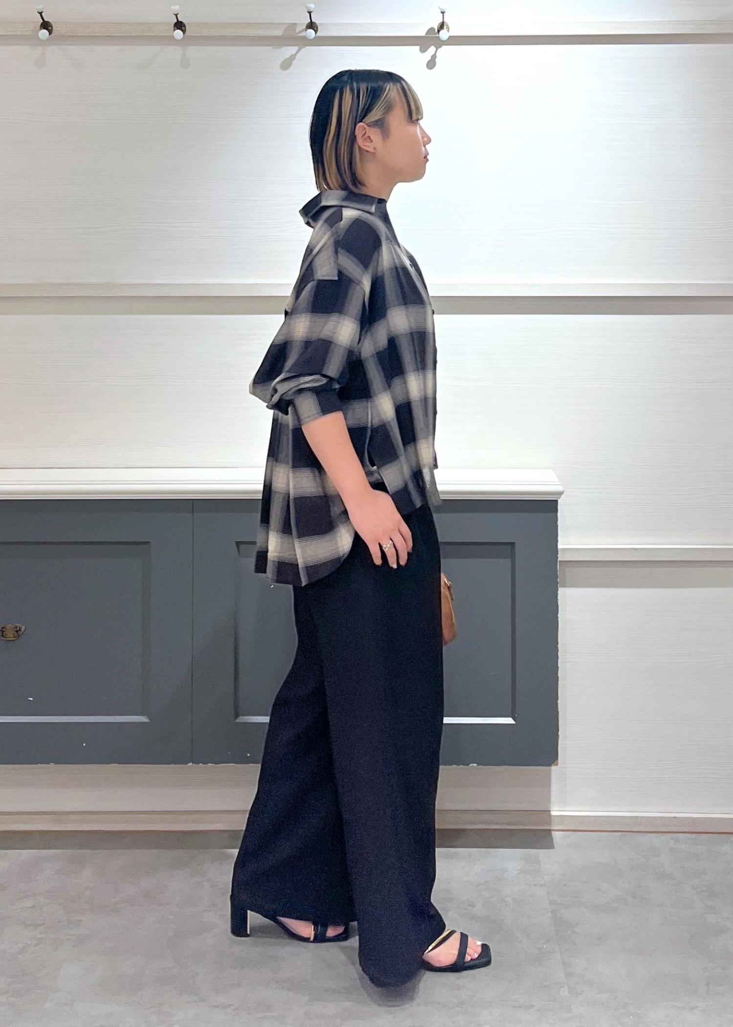 チェックシャツ×ワイドパンツ