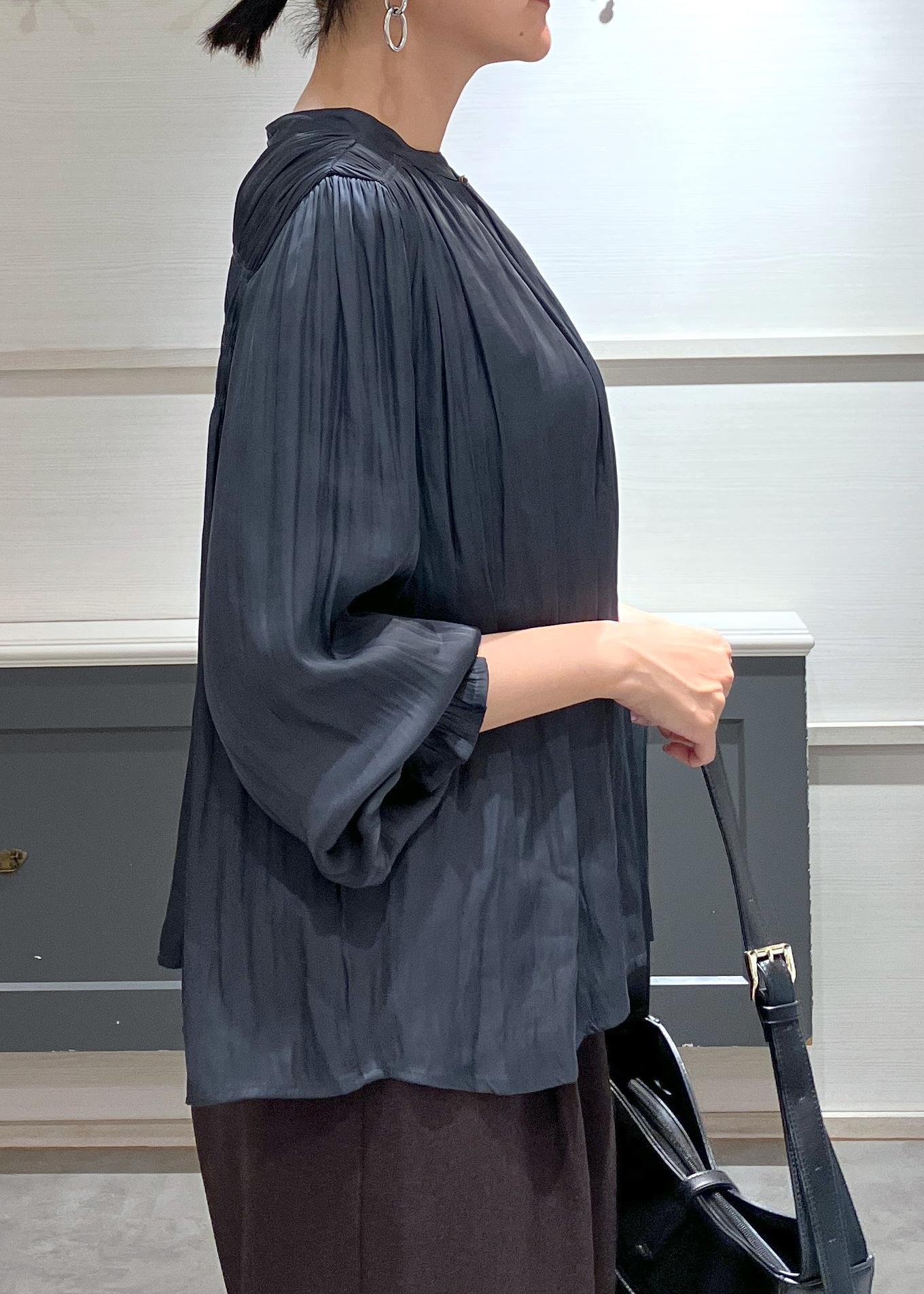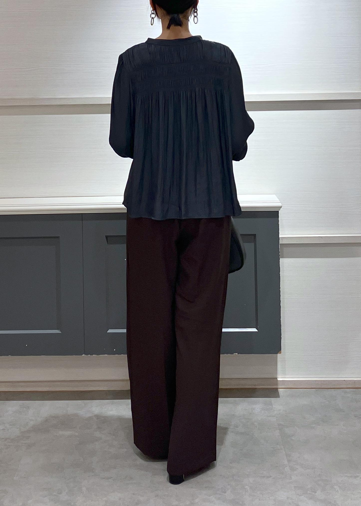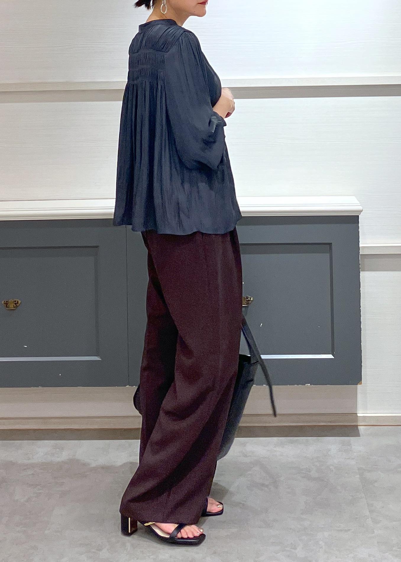 デザインに特徴のあるシャーリングブラウスはインしたくなる所をあえてインせずアウトでゆるっと着てみました♩