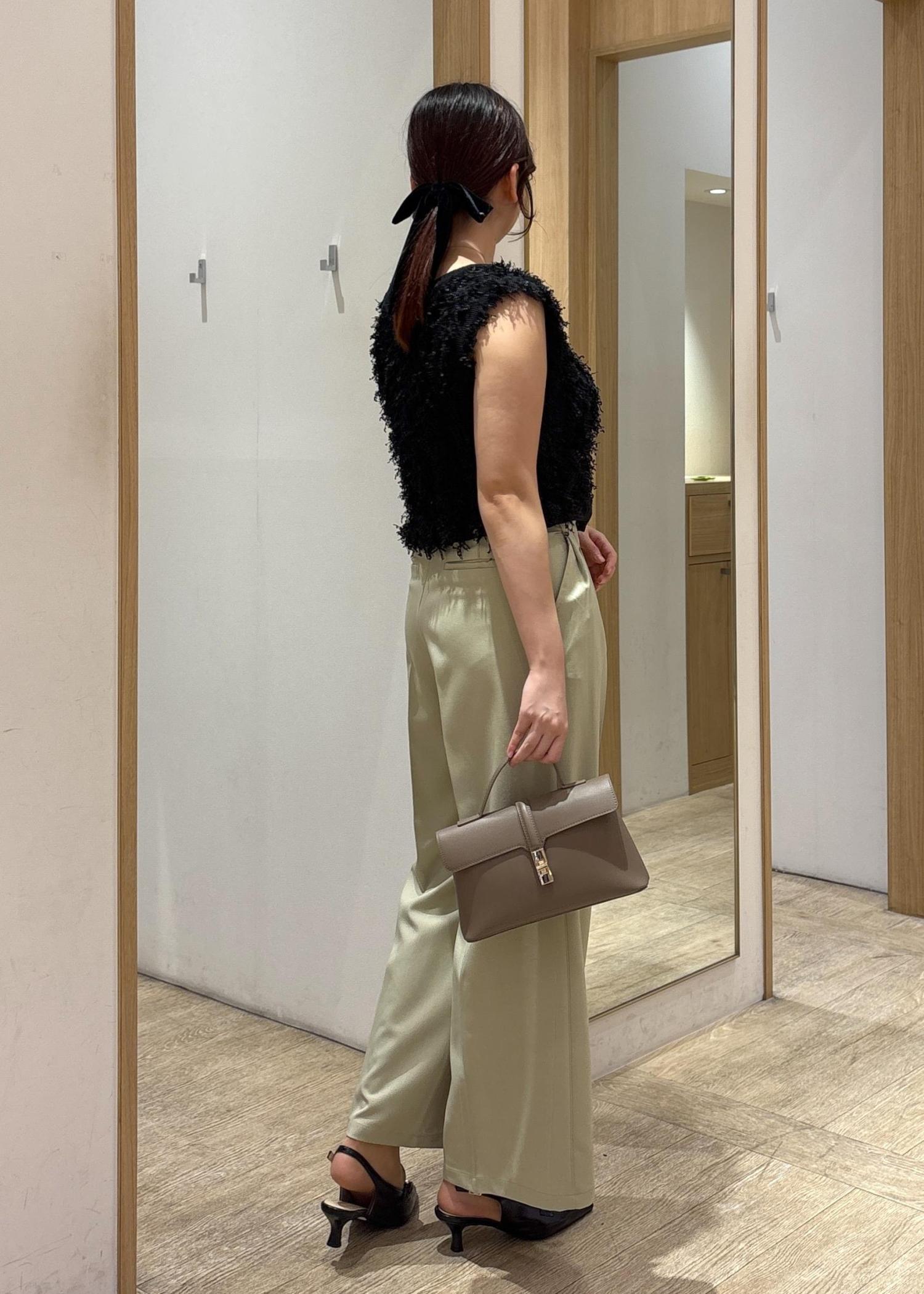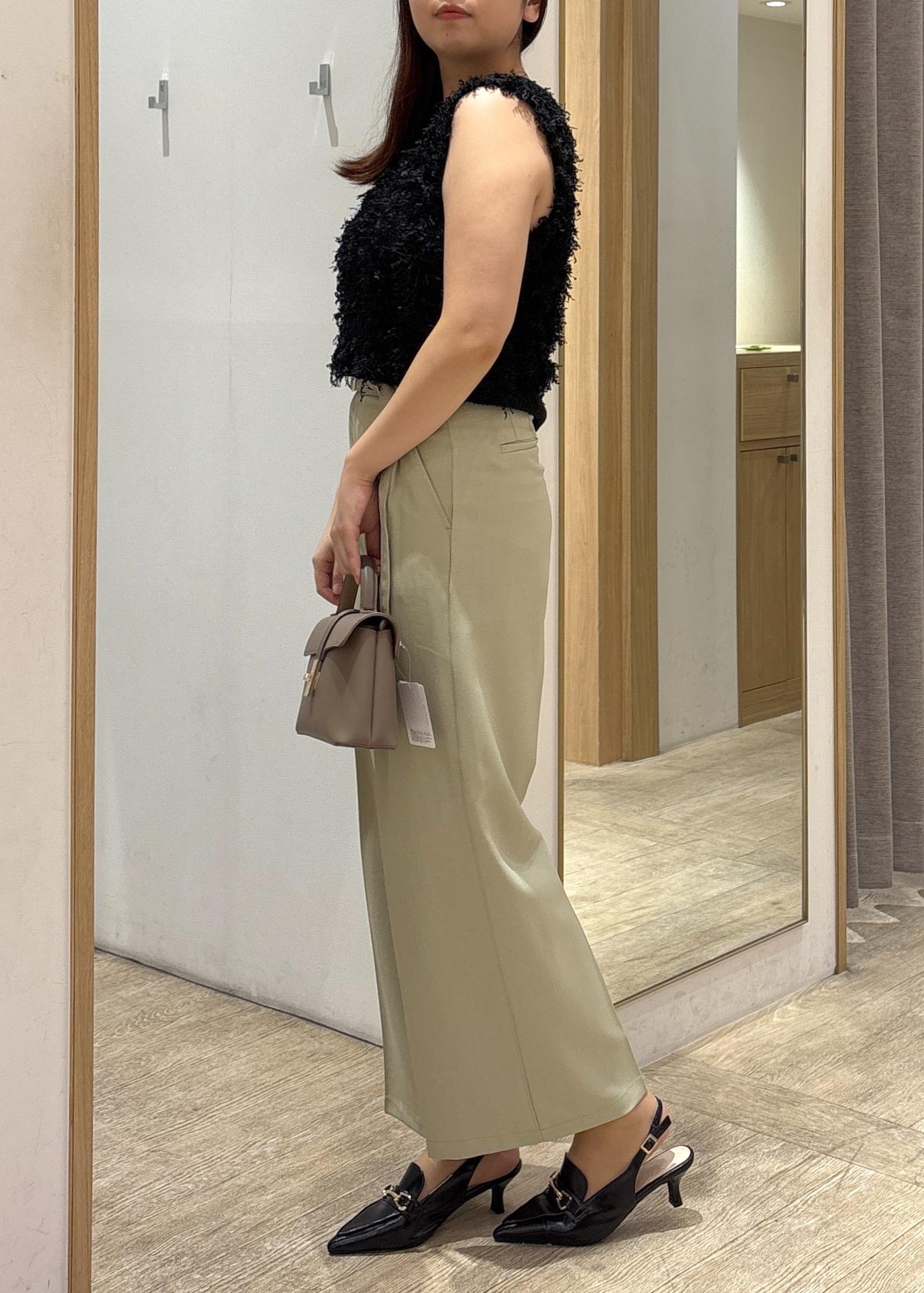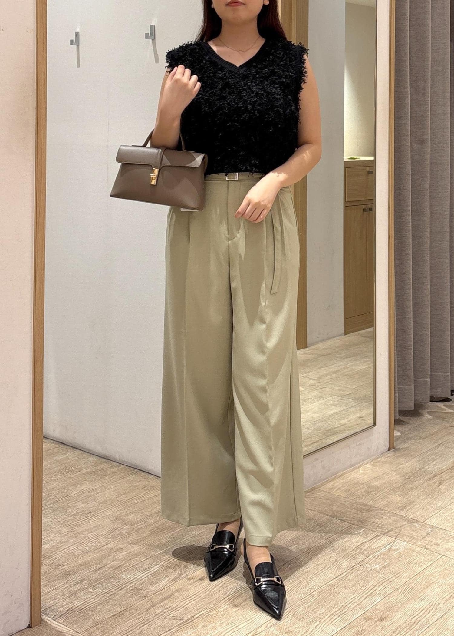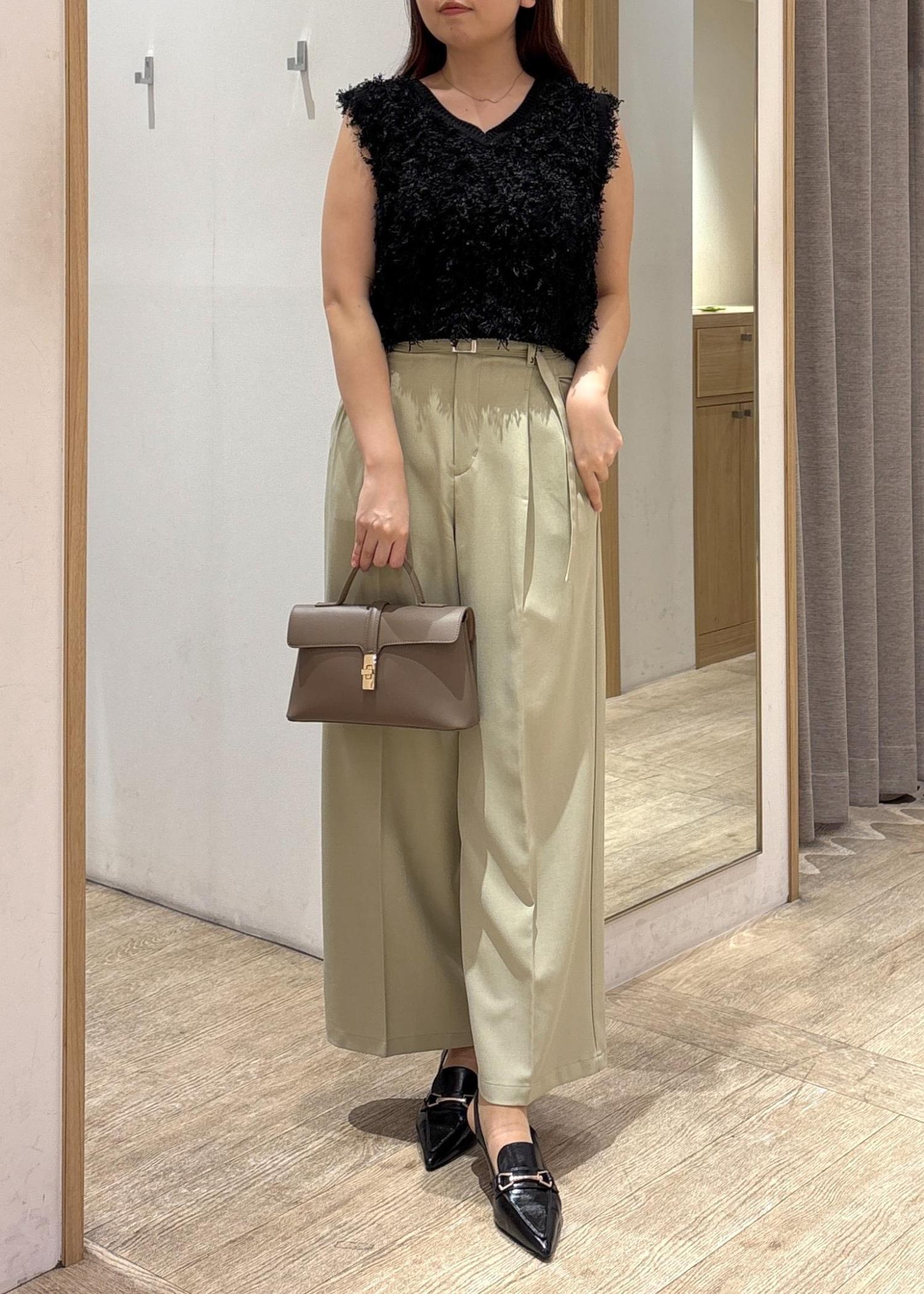 ベルト金具がアクセントになり、パンツスタイルに都会的なムードを加えます。 -