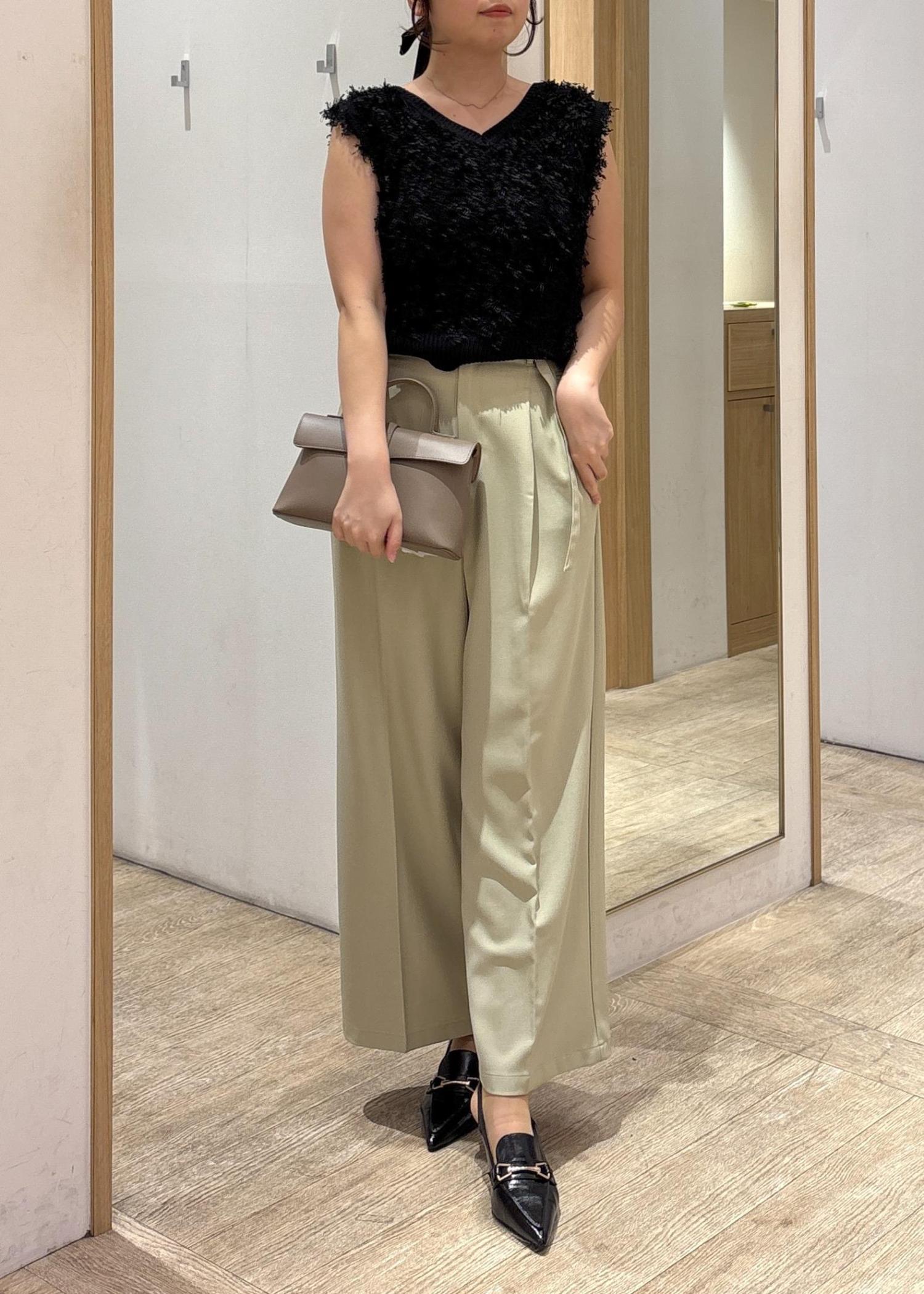 黒の存在感あるトップスと、ライトグリーンのワイドパンツを合わせたモード寄りのきれいめコーデ。