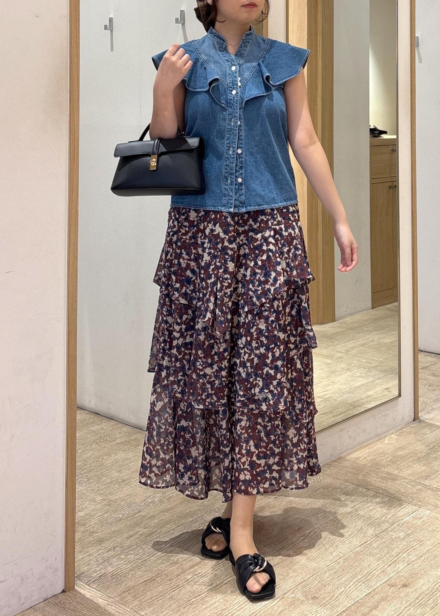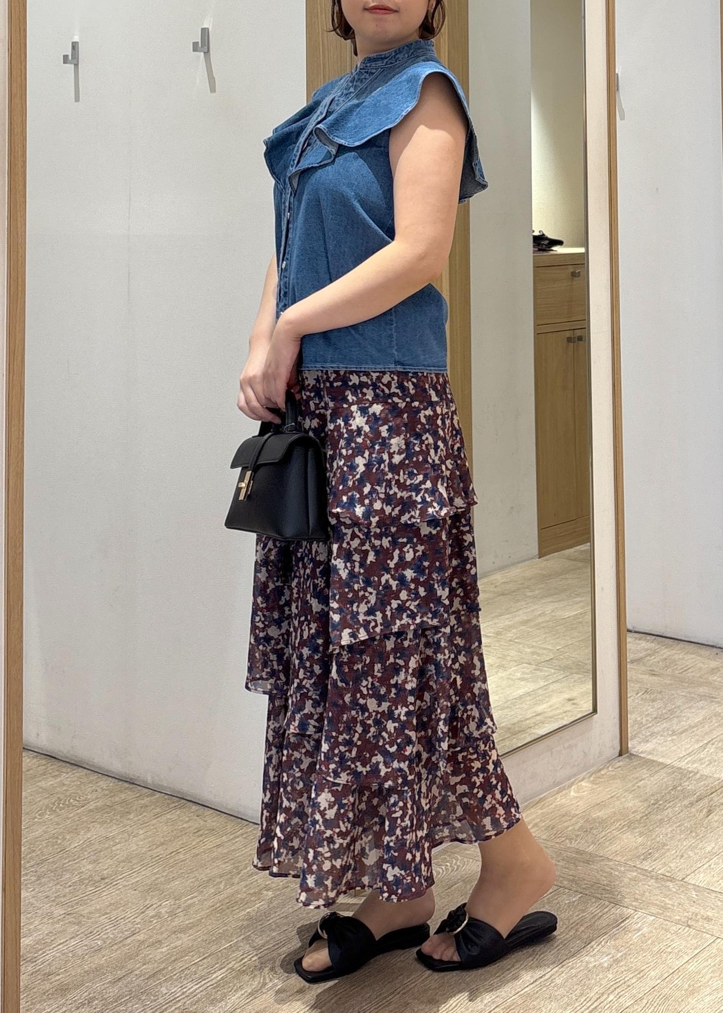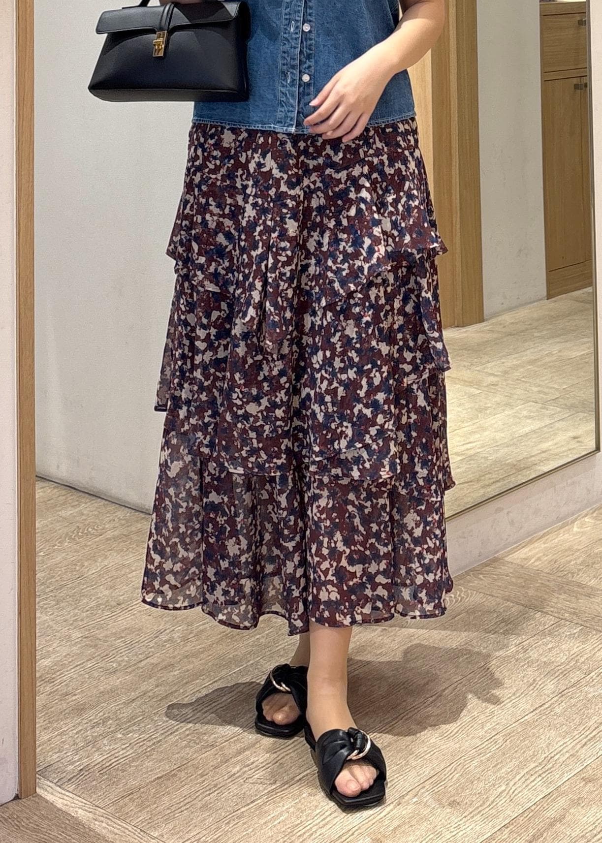 ボトムは、ふんわり重なるティアードデザインが、動くたびに軽やかで華やか。甘さのあるデザインだけど、落ち着いたカラーなので大人可愛くまとまります。