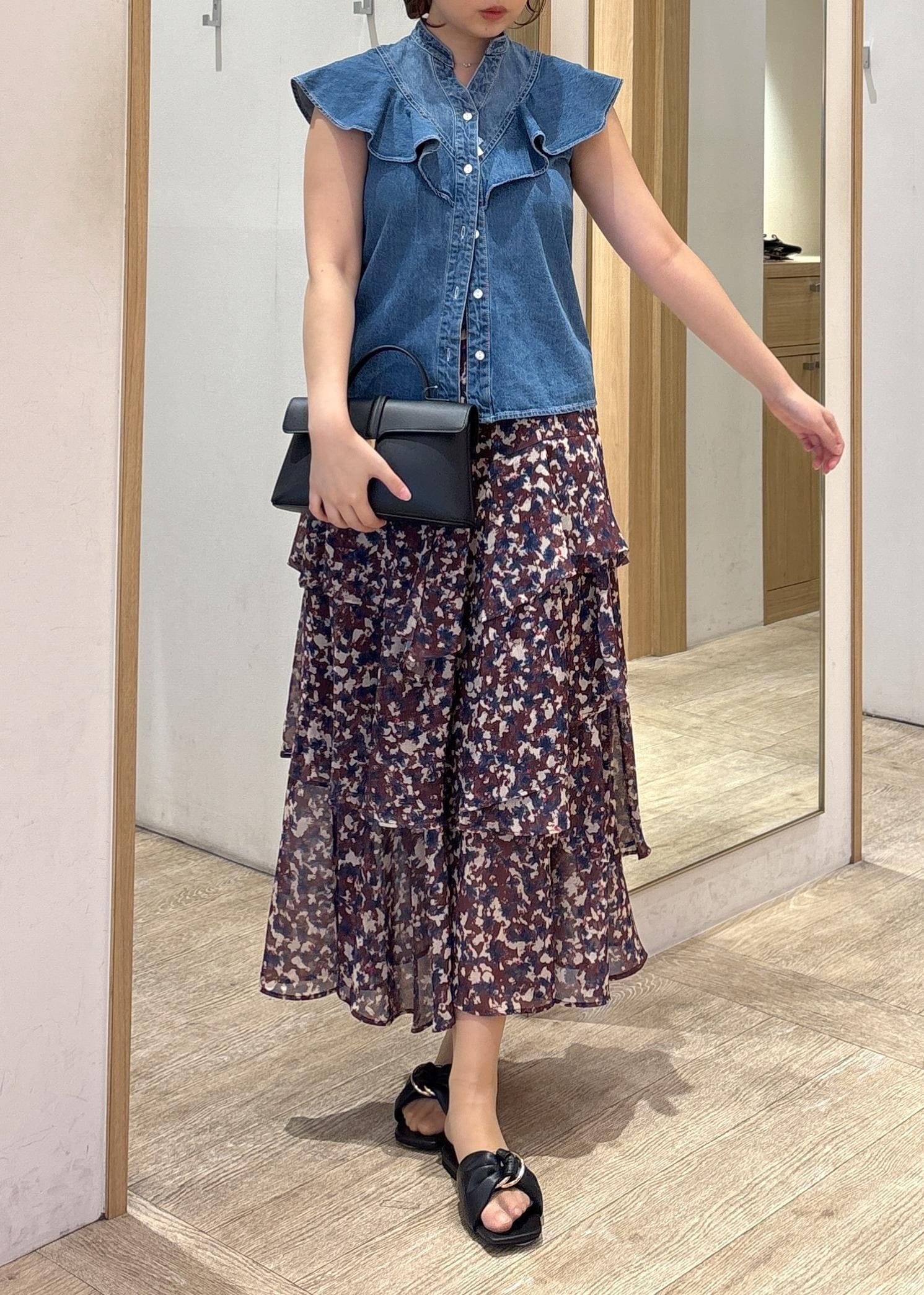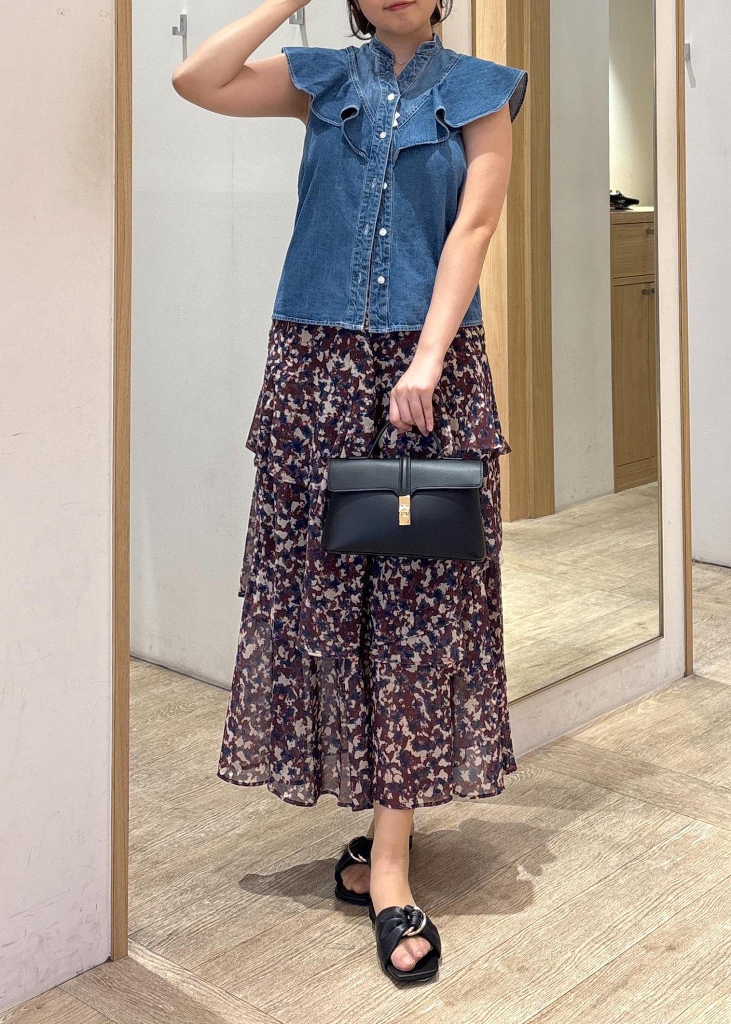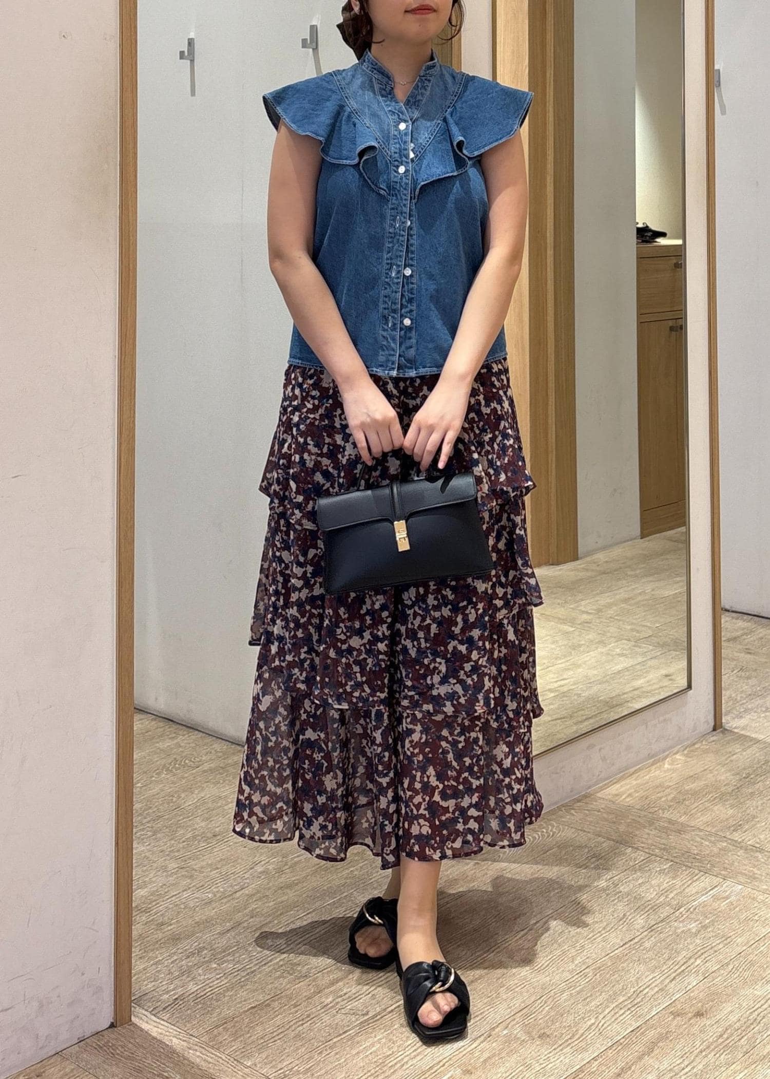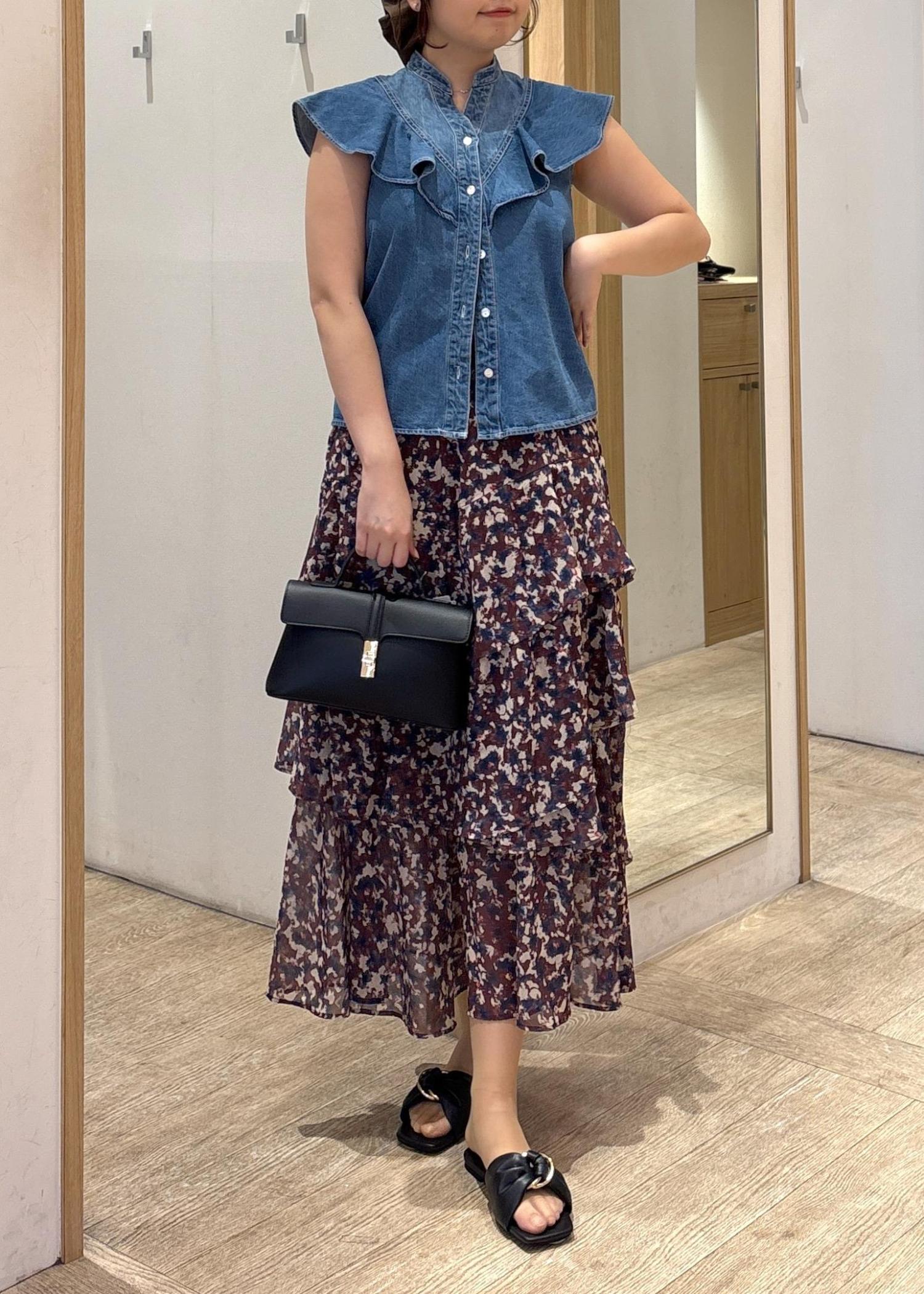 ボトムは、ふんわり重なるティアードデザインが、動くたびに軽やかで華やか。甘さのあるデザインだけど、落ち着いたカラーなので大人可愛くまとまります。