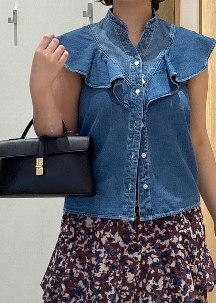 程よいハリ感で上半身に立体感を出し、骨格ストレートでも厚みを拾わずすっきり。デニムのカジュアルさとフリルの甘さが好バランス。 -