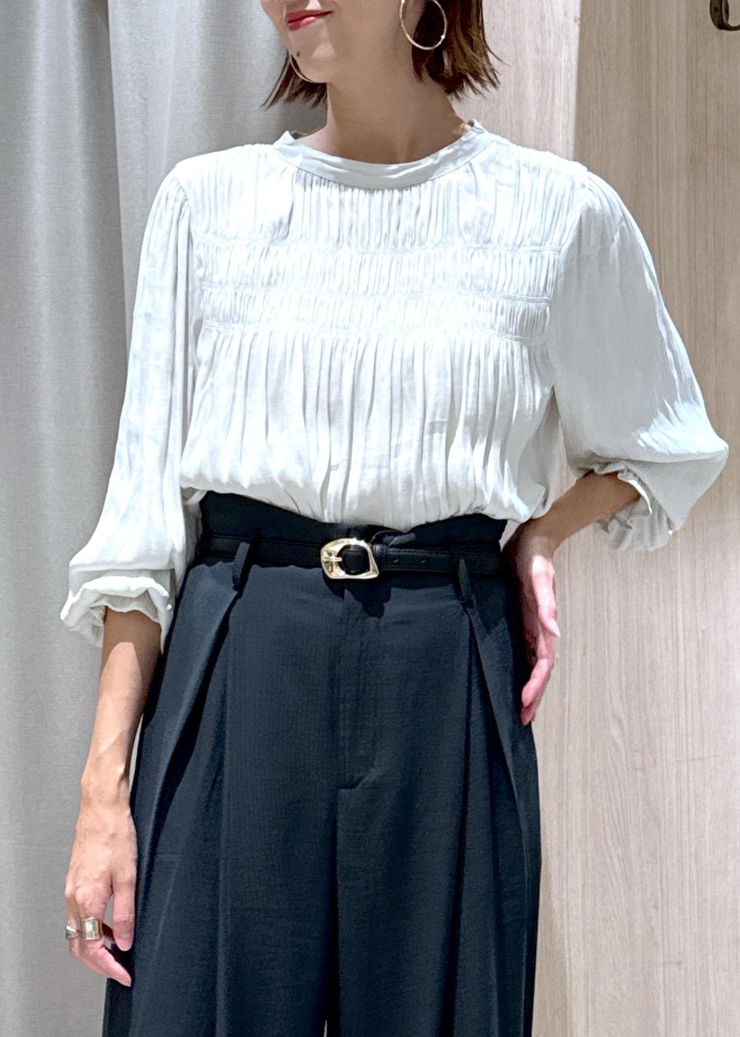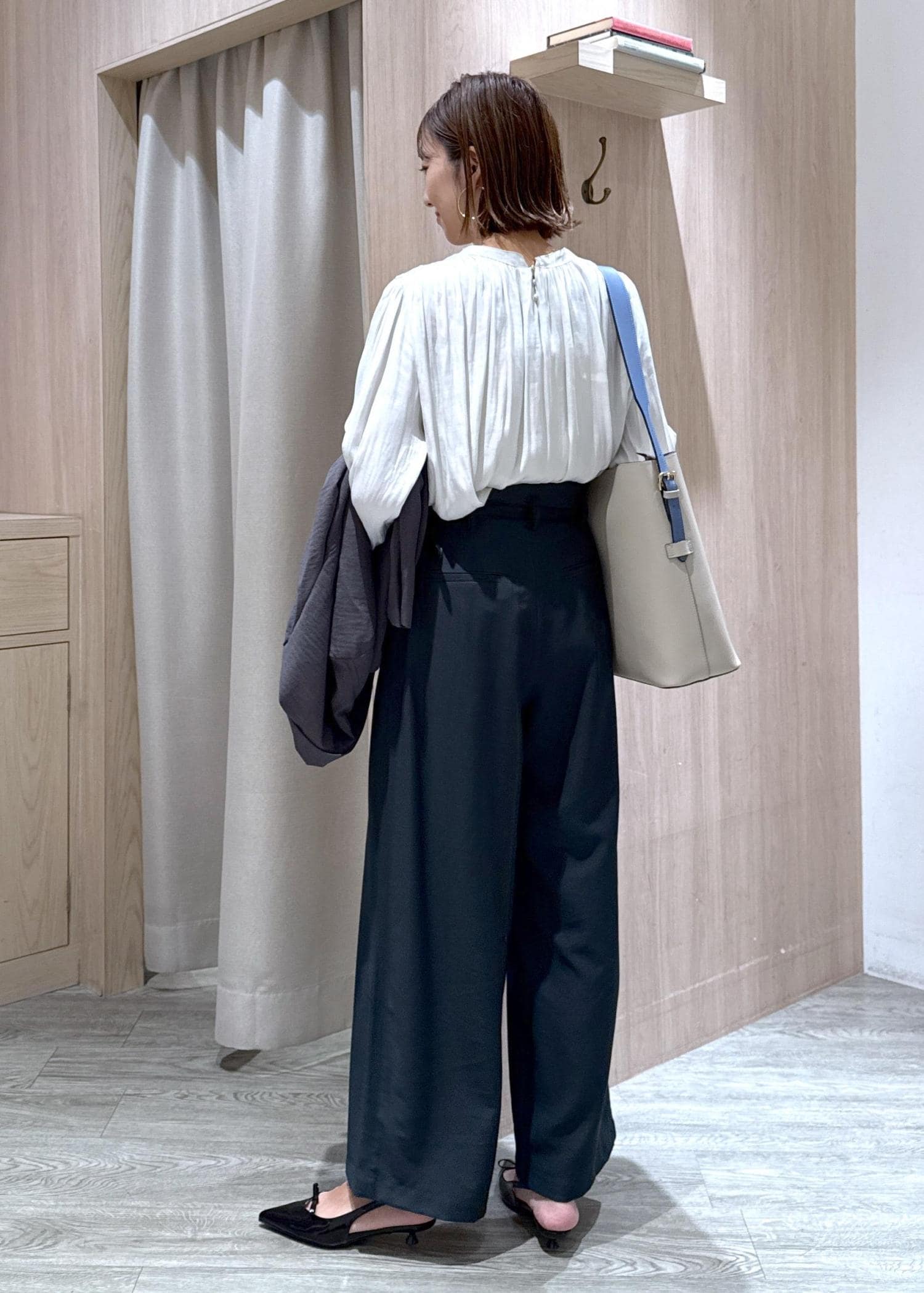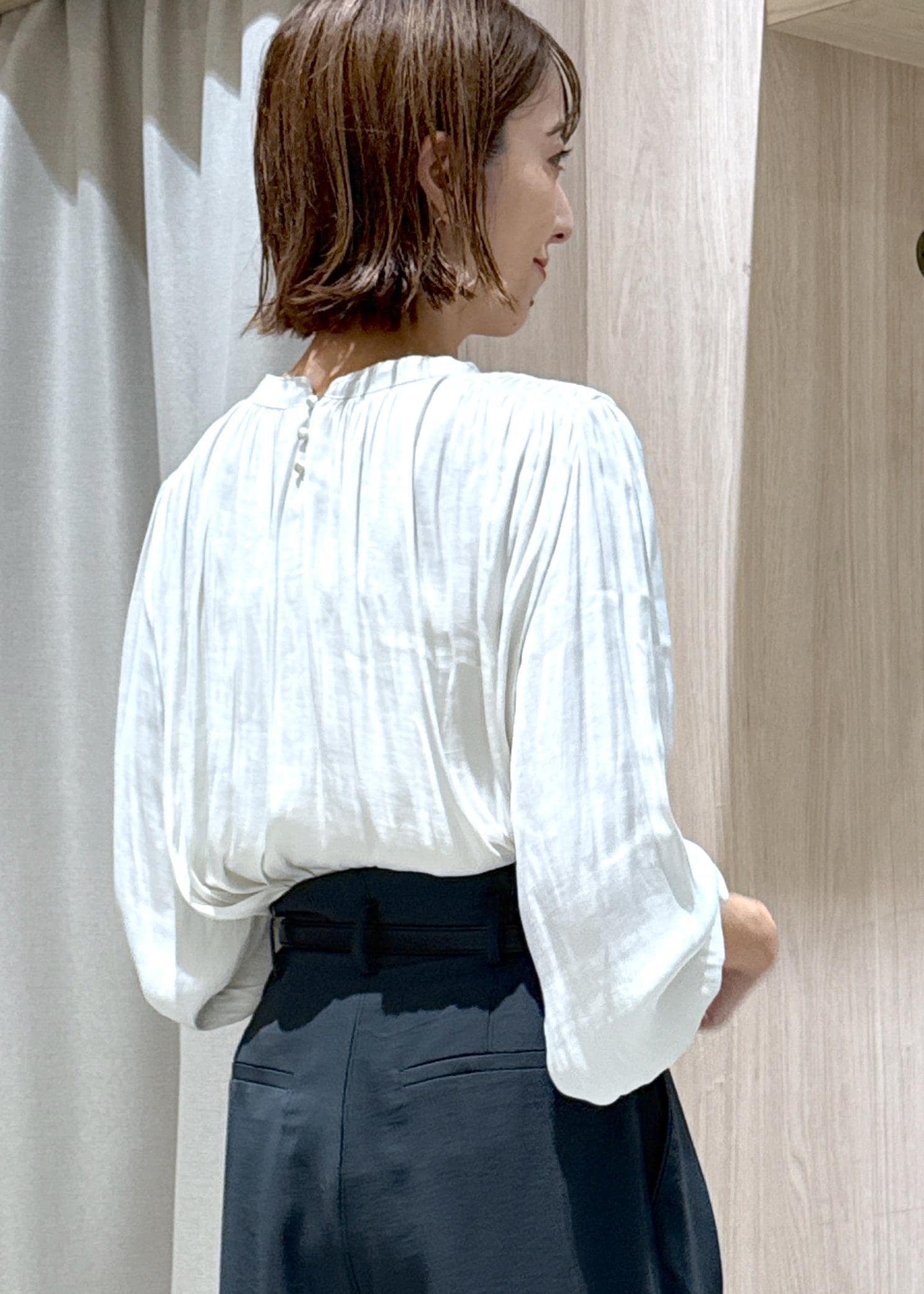 袖口がシャーリングになっていて手首で止まってくれるので、オフィスでも使いやすいです◎ -