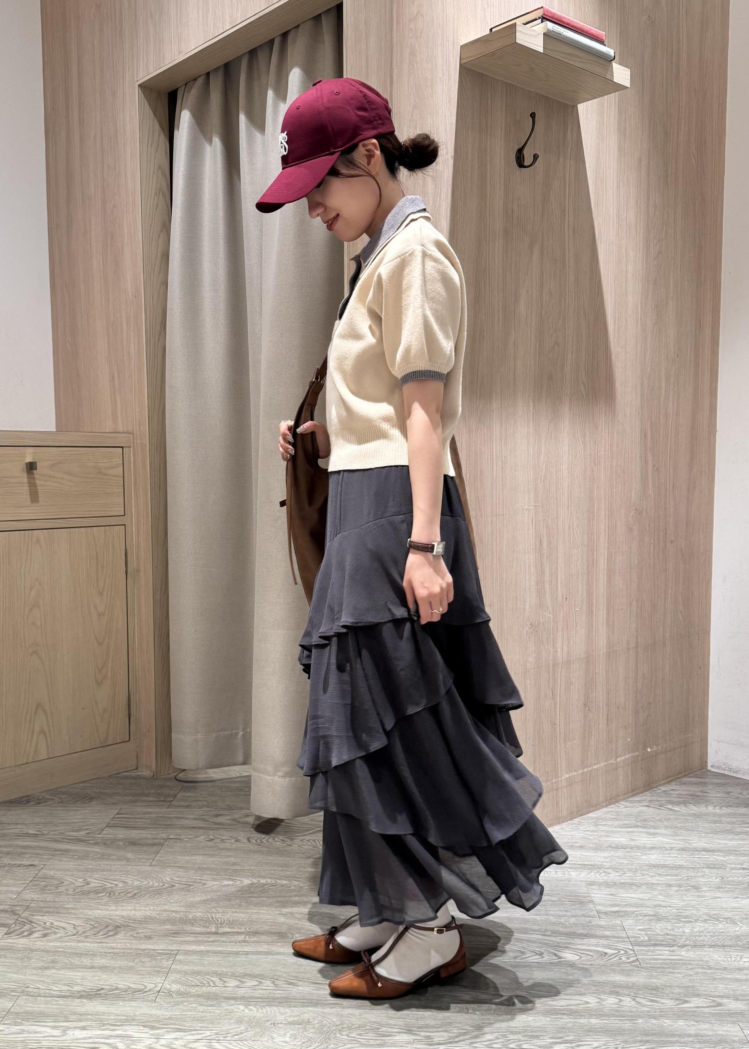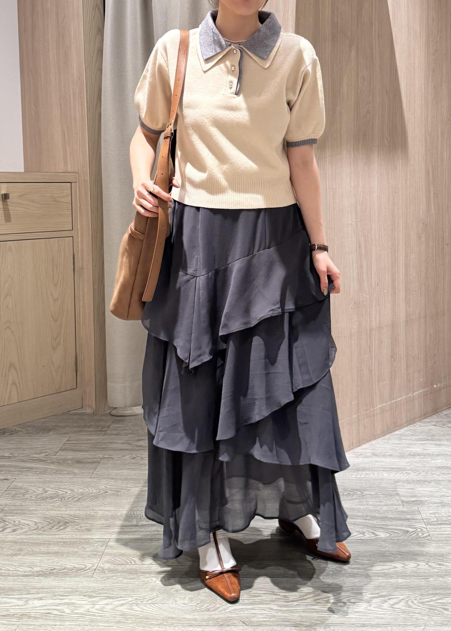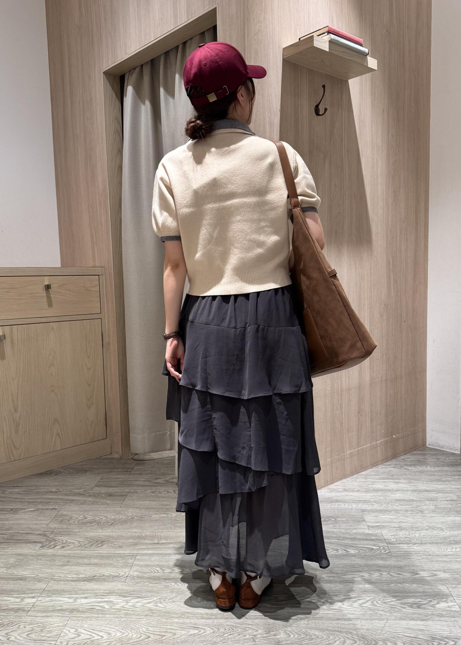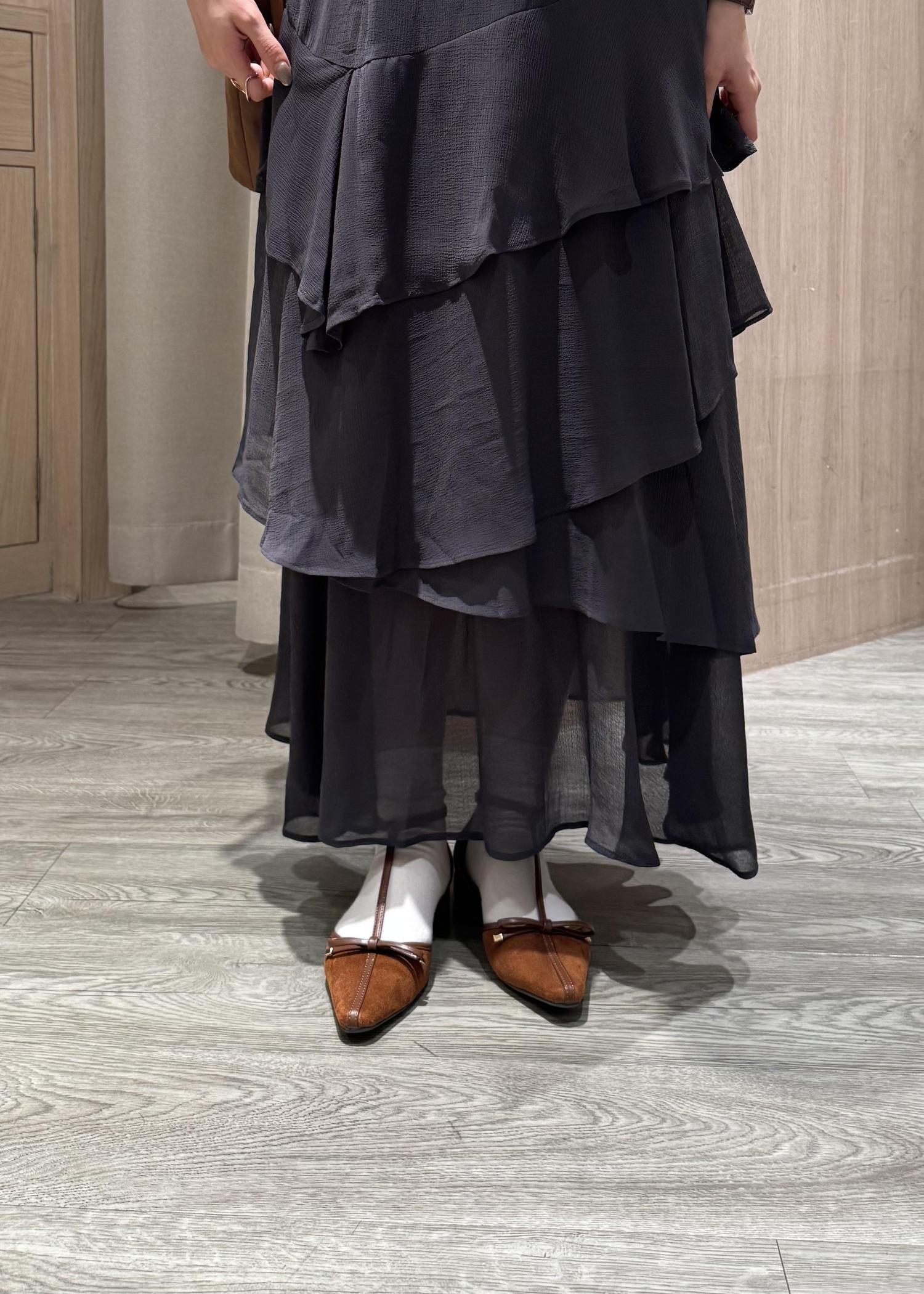 くるぶしが見えないくらいの丈感でした!何層にも重なっていますが、そこまでのボリューム感はないので、骨盤が大きい骨格ウェーブの方も広がりすぎずに着用いただけます! -