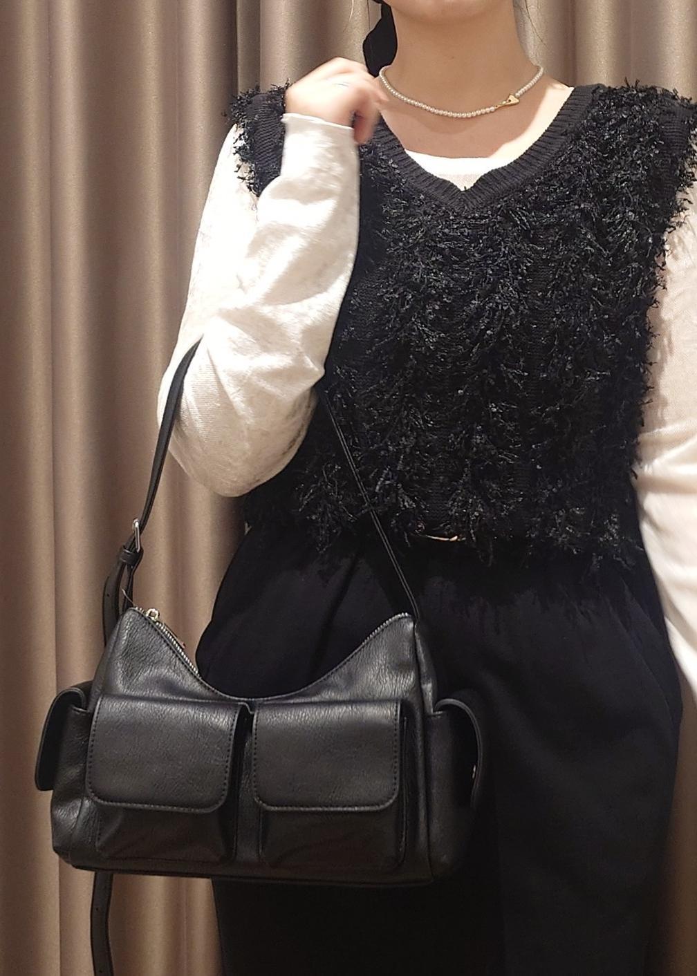 フロントとサイドのポケットも大きめで、三つ折財布が入るくらいのサイズ感です。 -