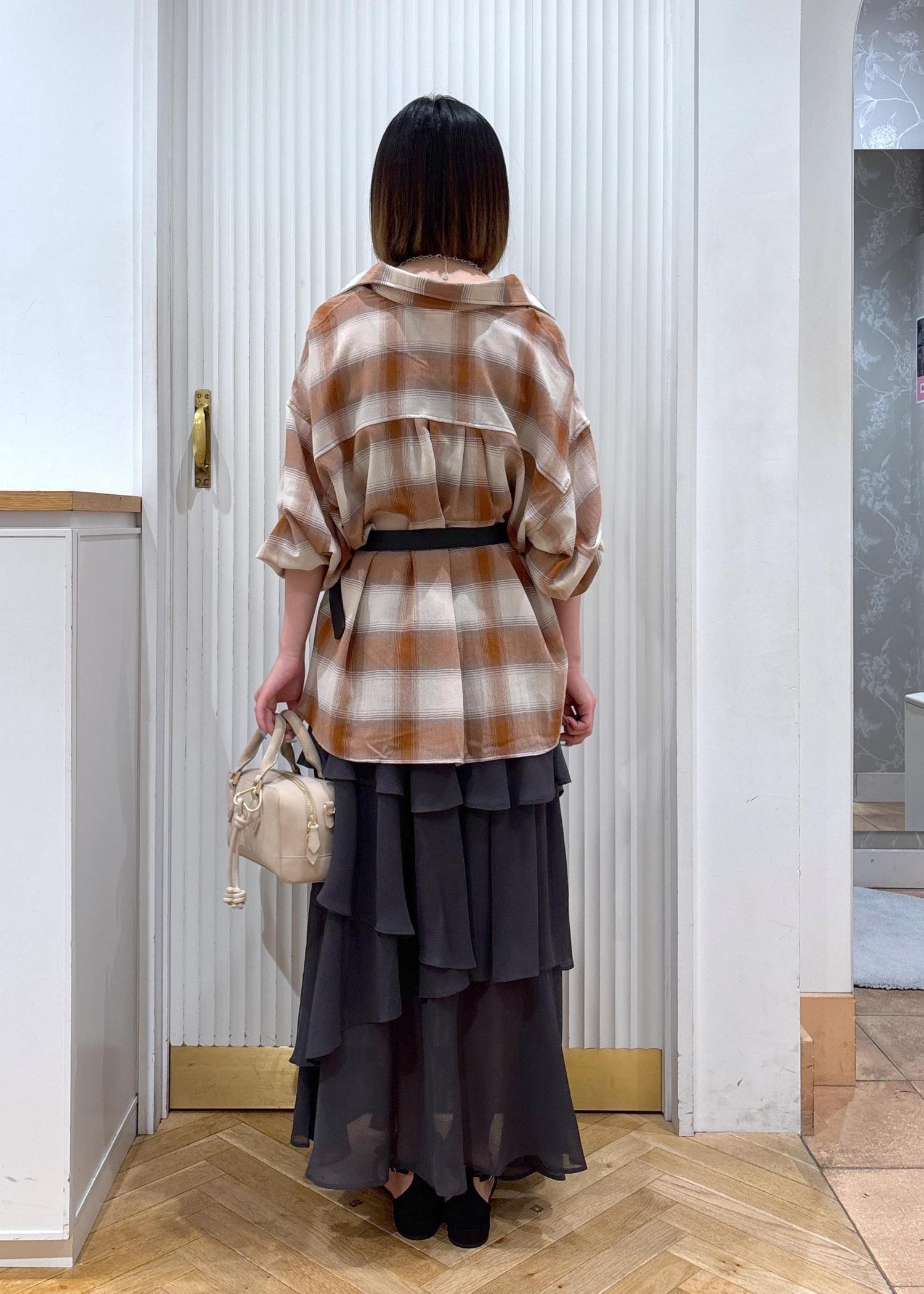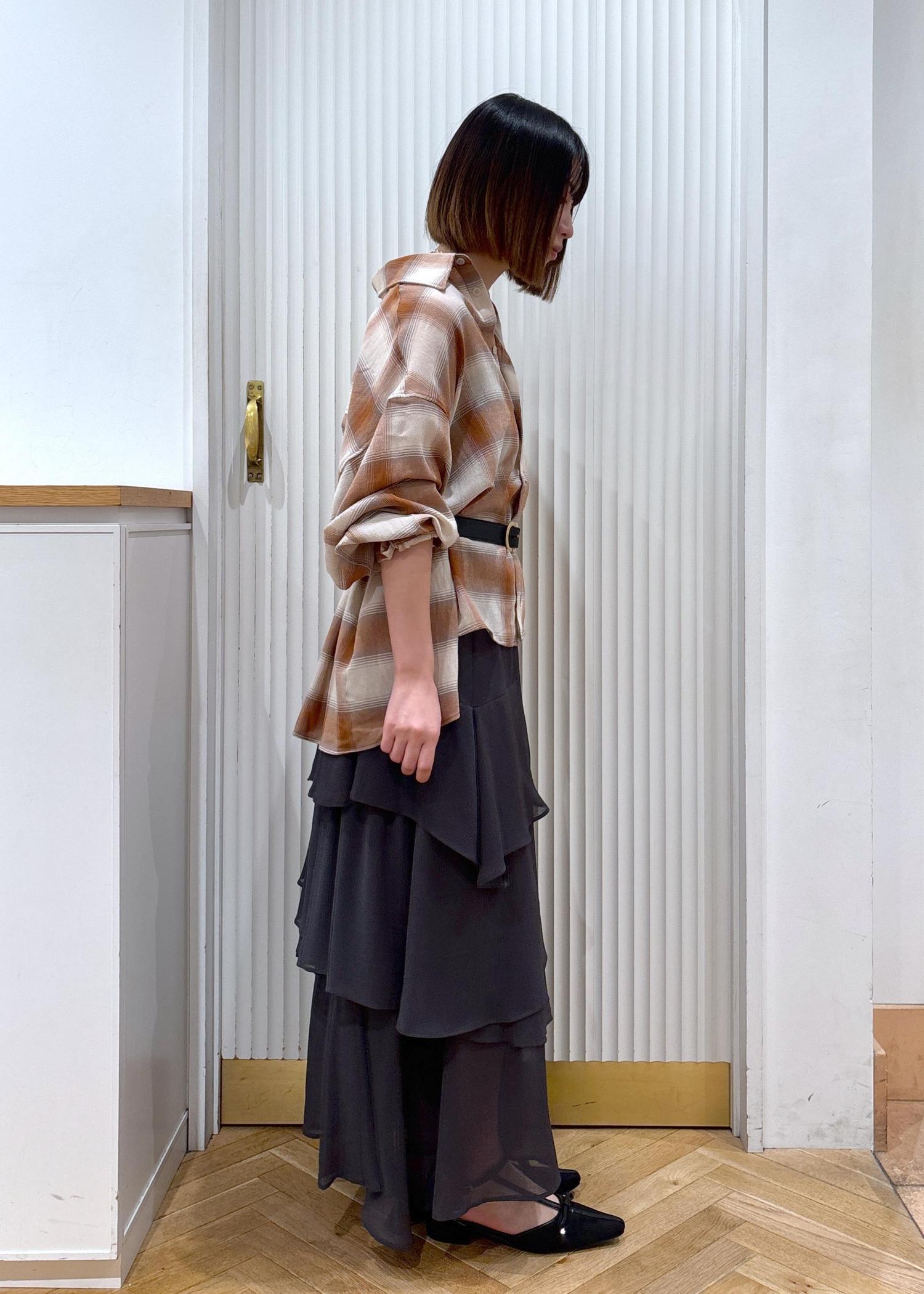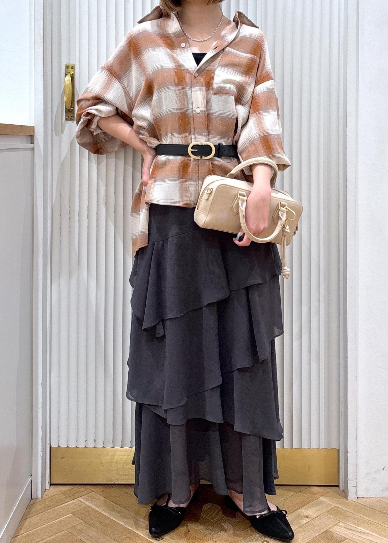 チェックのシャツとティアードスカートを合わせた甘めカジュアルコーデです!シャツをインするのではなくベルトで締めることでウエストマークになりティアードスカートのフリル感もアップして見え可愛いです☺︎