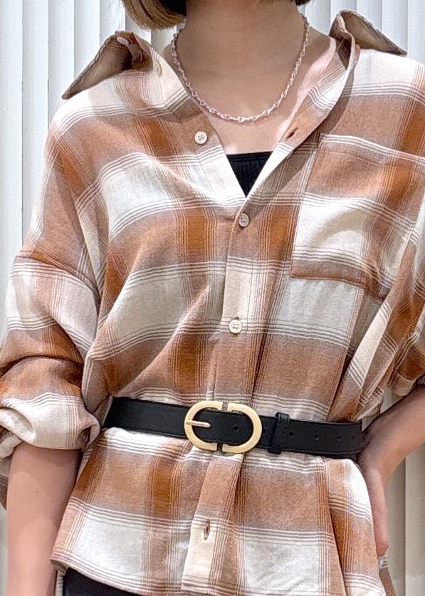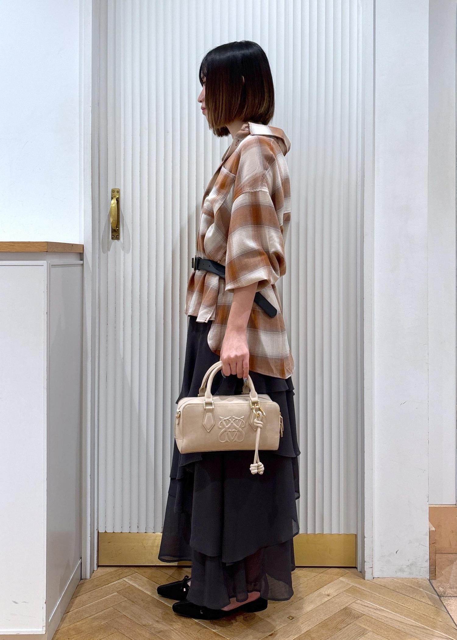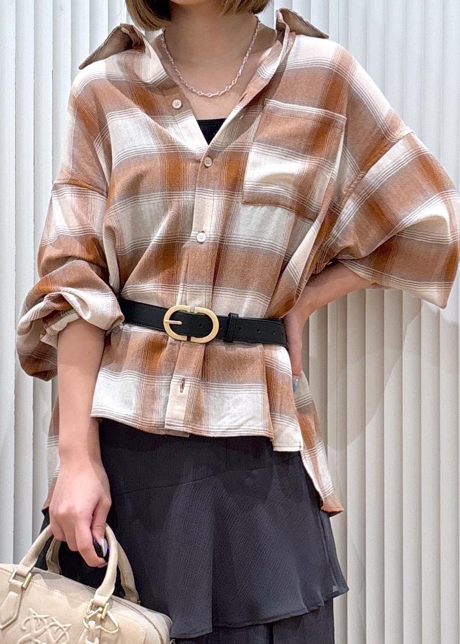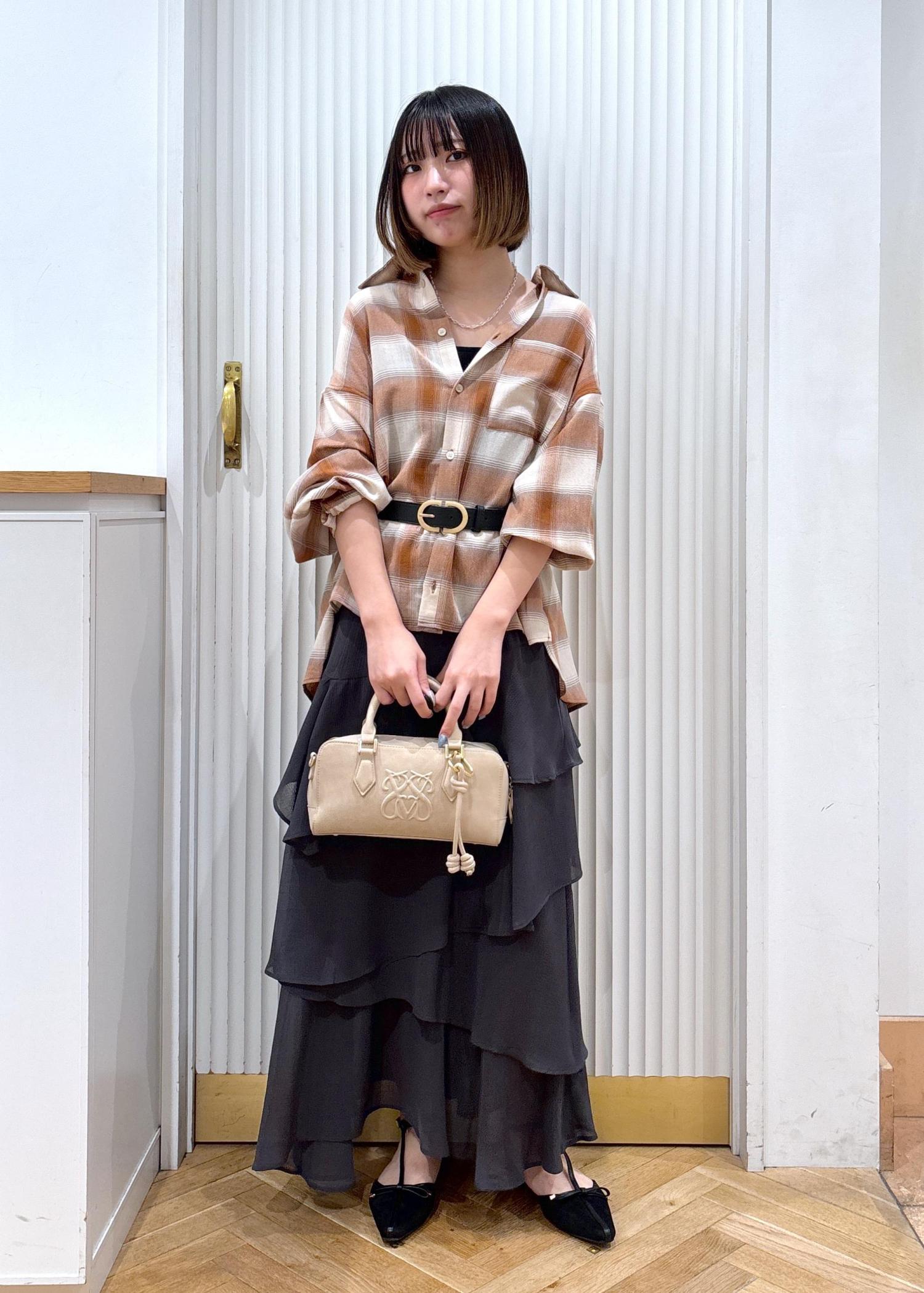 チェックのシャツとティアードスカートを合わせた甘めカジュアルコーデです!シャツをインするのではなくベルトで締めることでウエストマークになりティアードスカートのフリル感もアップして見え可愛いです☺︎