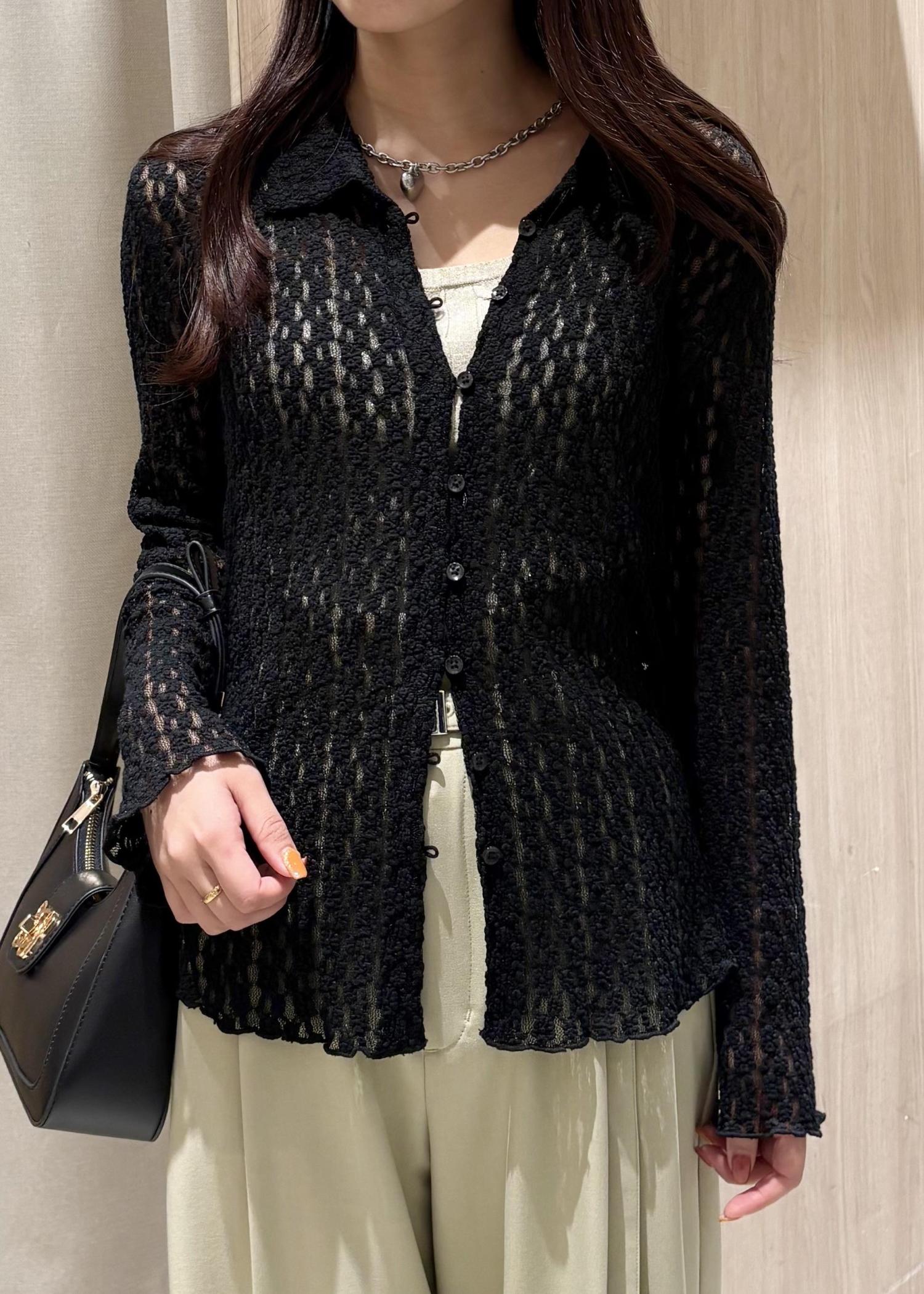 VISレースポロ襟カーディガンブラック / F¥3,842レビュー丈はお尻が隠れるくらいの長さでタイトめなお作りのため、上半身をスッキリと見せることができます。
