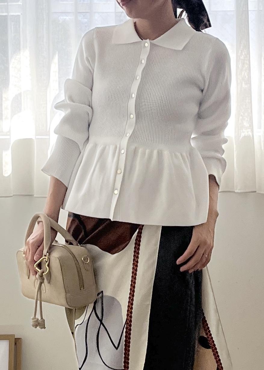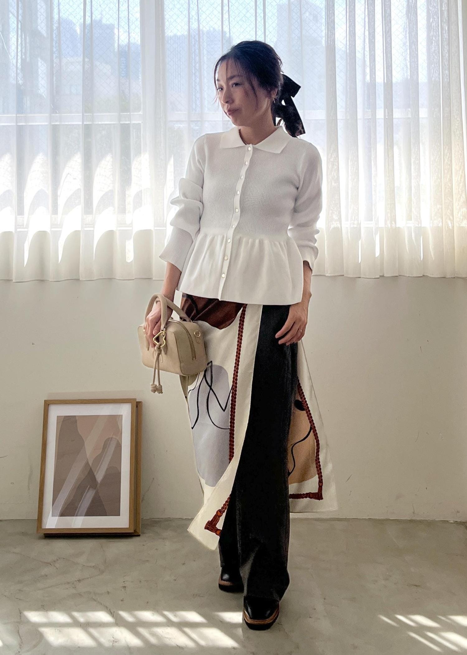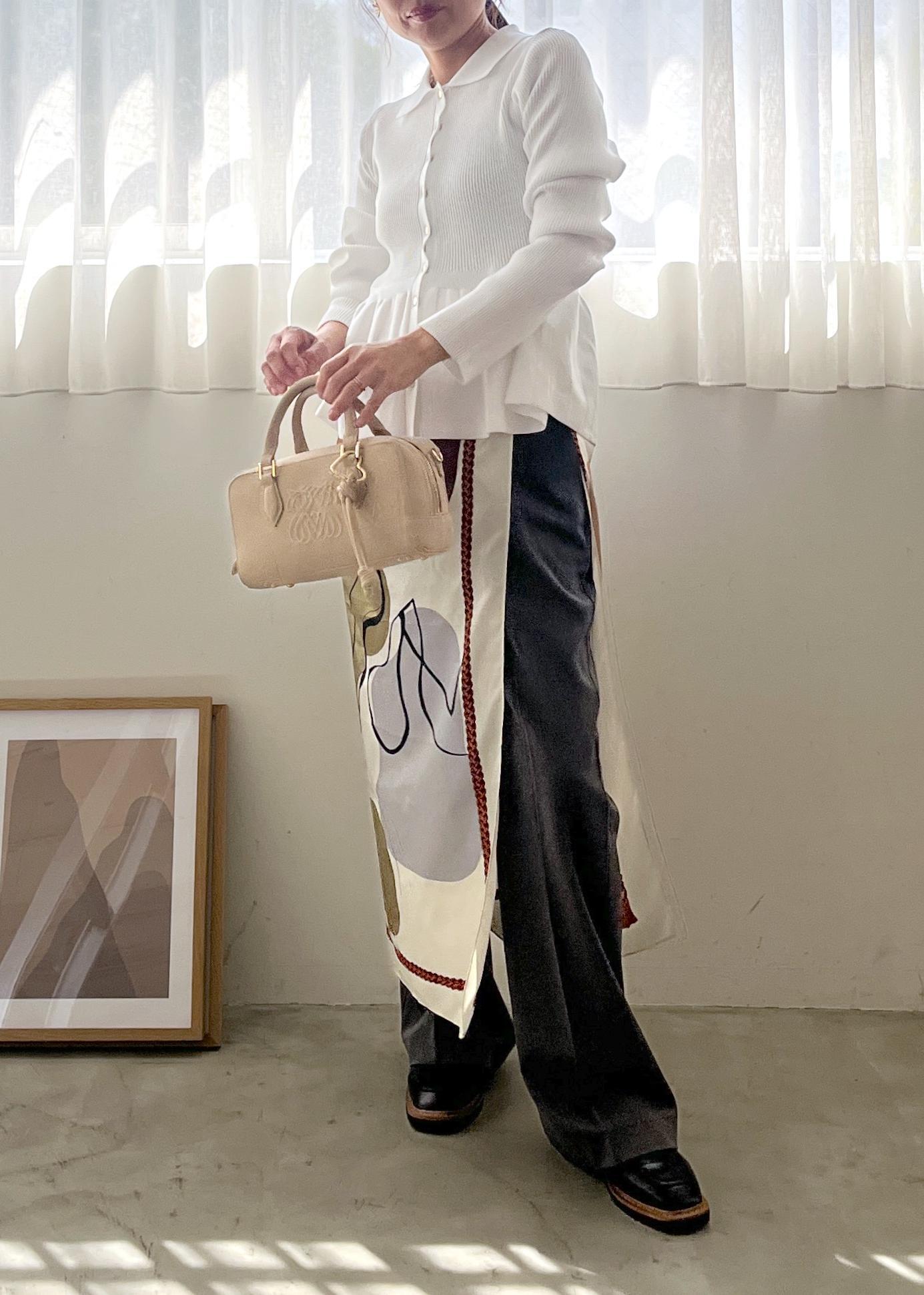 毎回大人気のペプラムカーデに、スカーフをプラスしたモードスタイル。