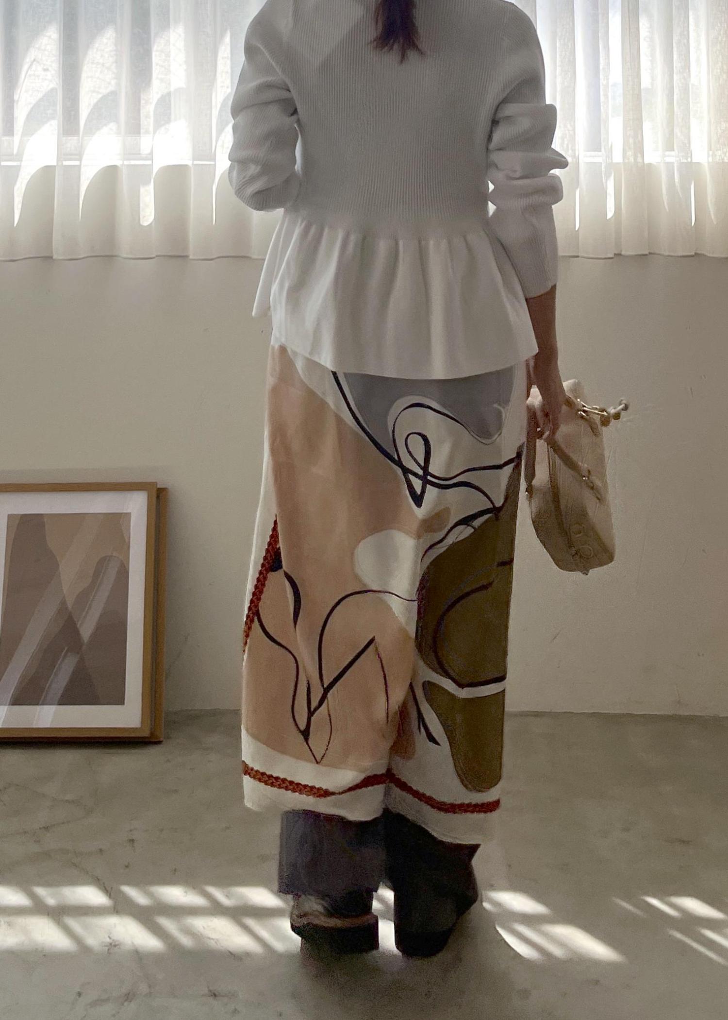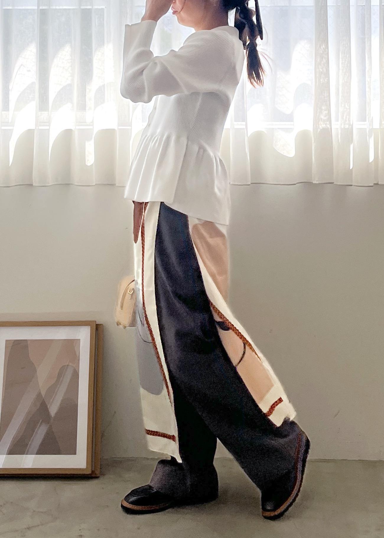 美easyパンツをミックスすることで、甘すぎず大人の余裕ある雰囲気に。