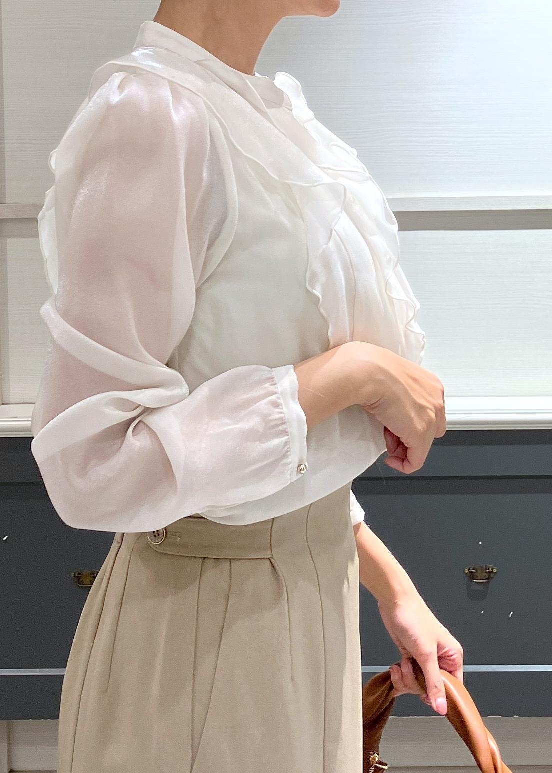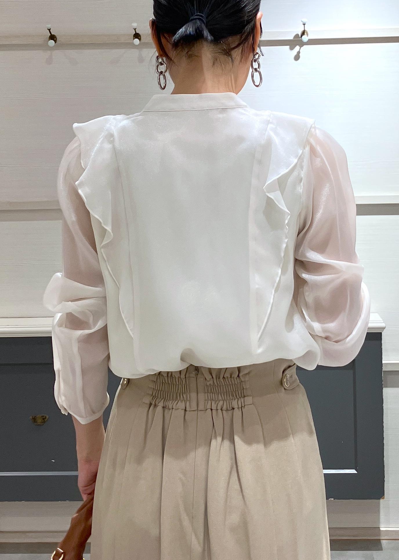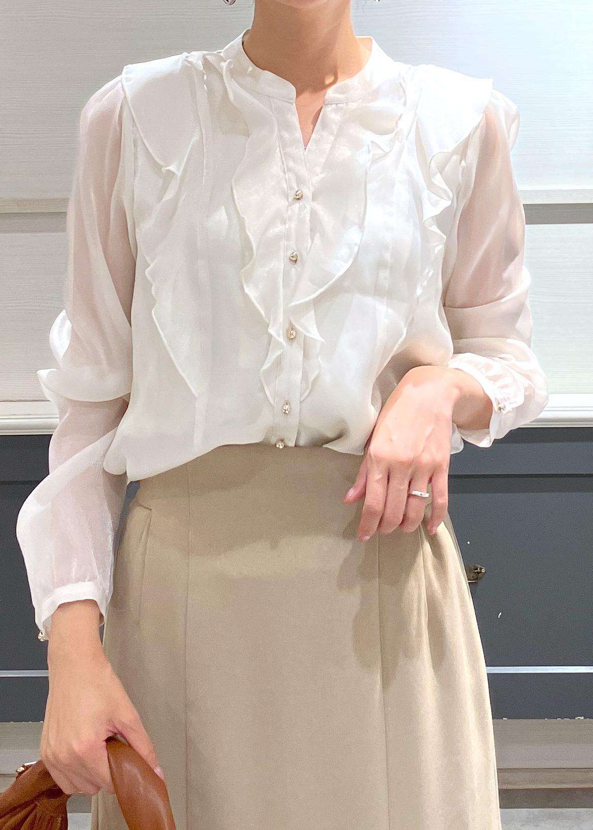 フェミニンな印象のフリルブラウスを優しいベージュカラーのスカートを合わせて柔らかいホワイトのワントーンコーデにしました♡