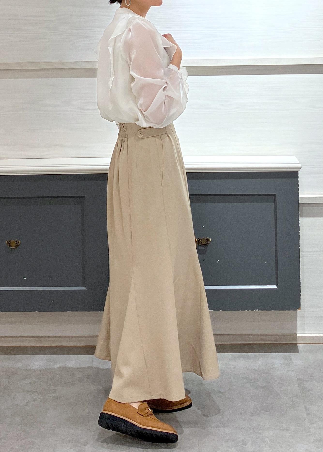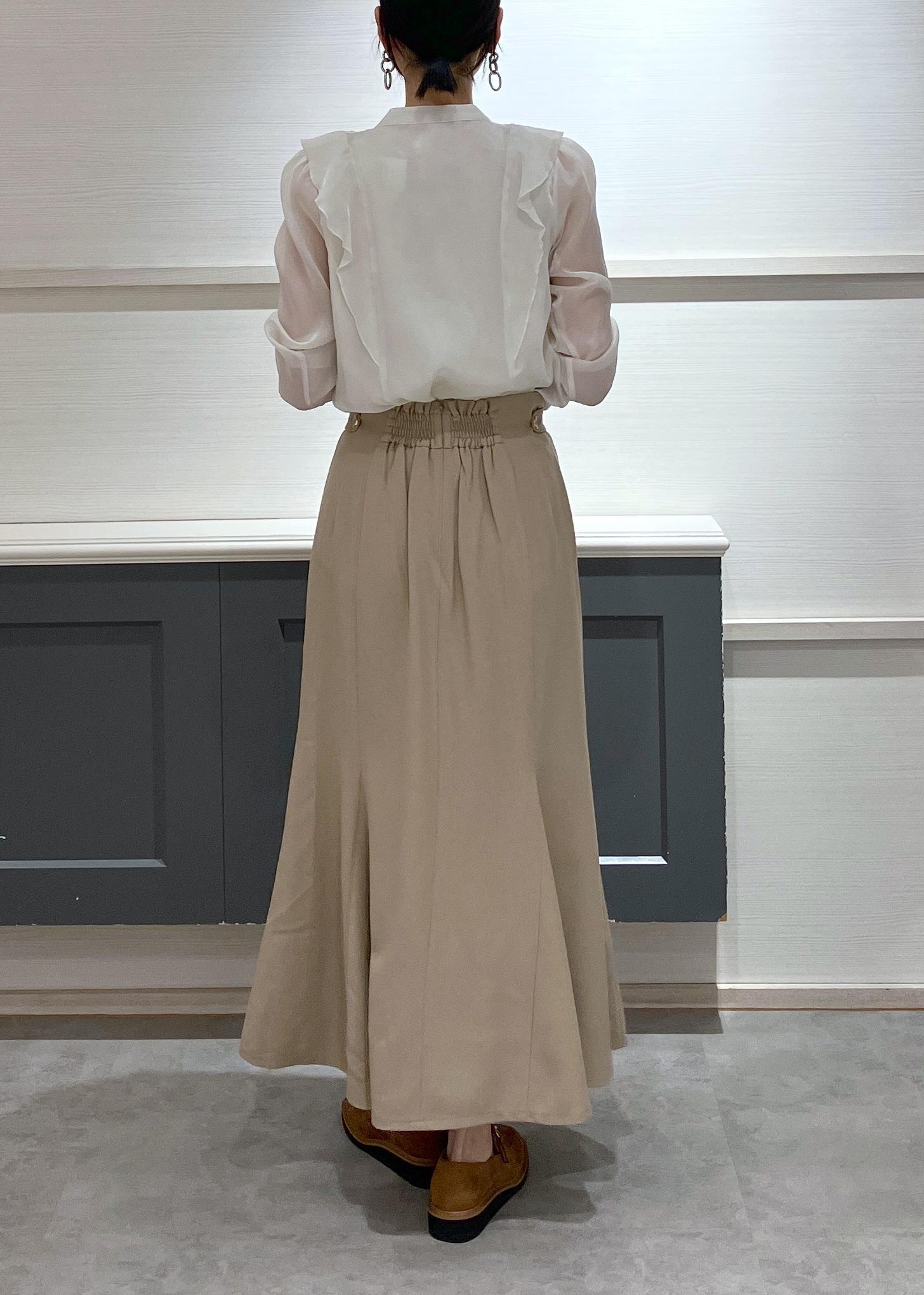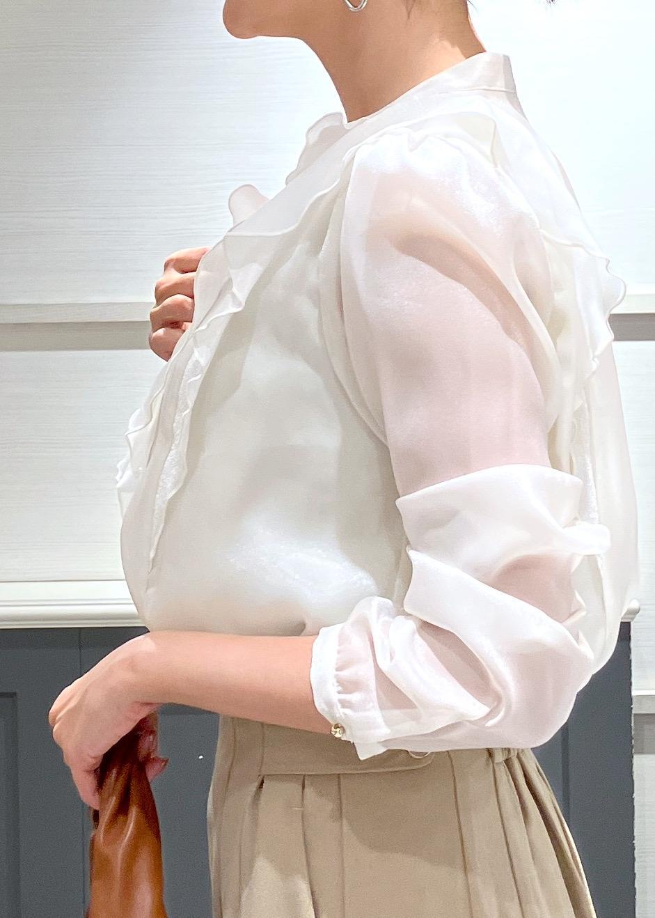 フェミニンな印象のフリルブラウスを優しいベージュカラーのスカートを合わせて柔らかいホワイトのワントーンコーデにしました♡