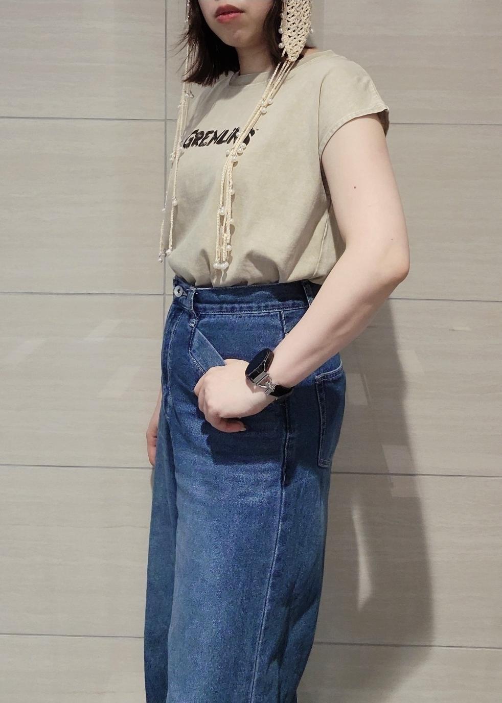 ゆったりとしたサイズ感で、伸長154cmで着用したところヒップまでしっかりと隠れるほどの着丈になりました。前後差があるデザインなので、前はもう少し短めです。 -