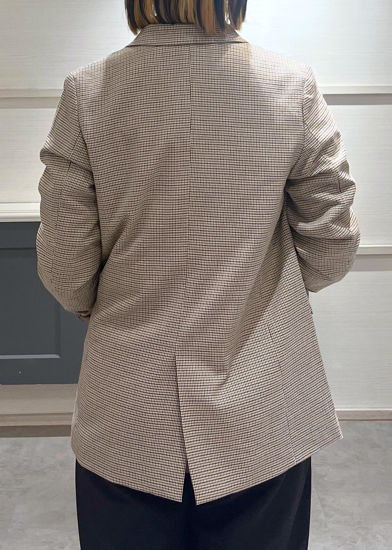 手に持ったチェック柄のジャケットを羽織れば、