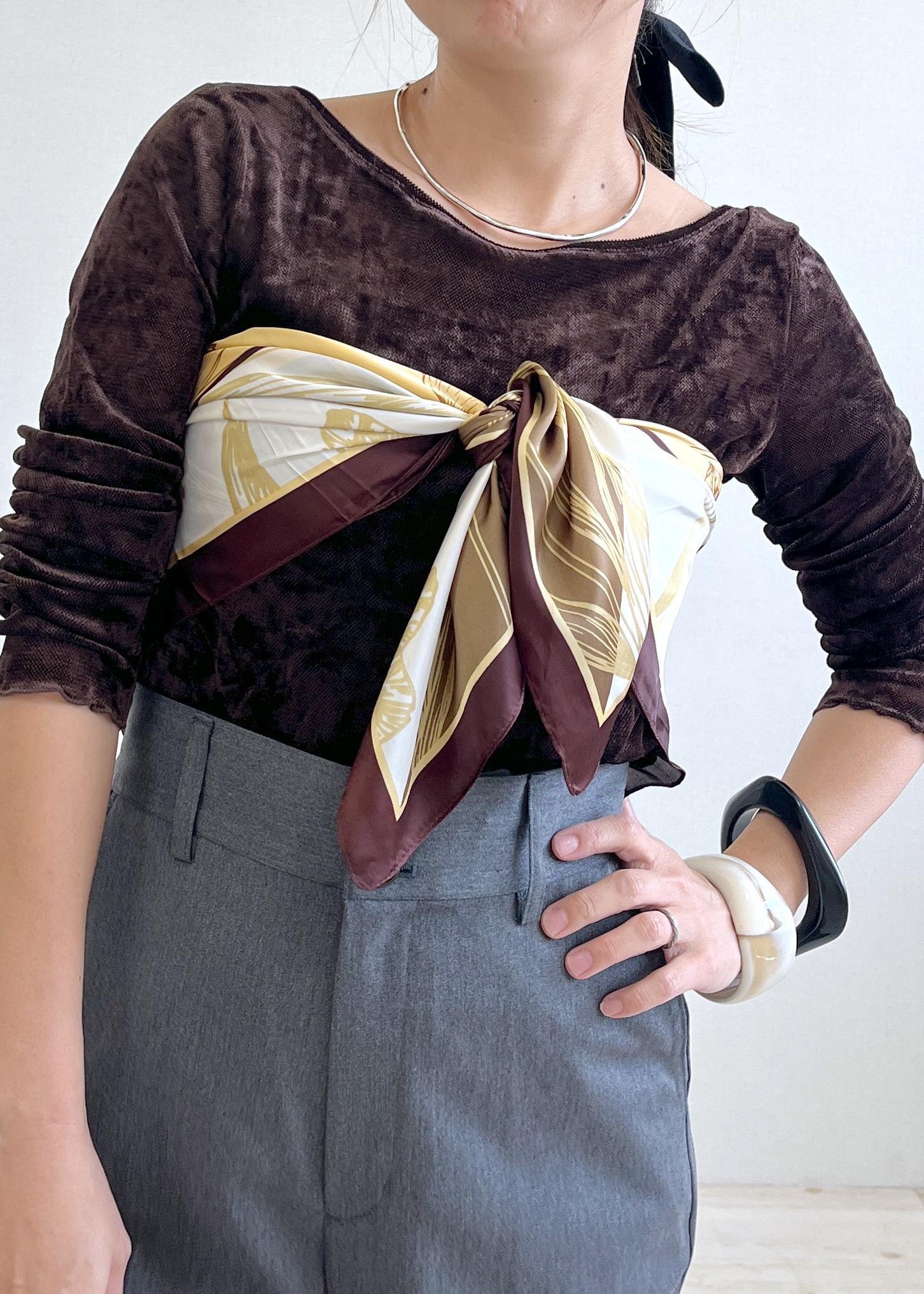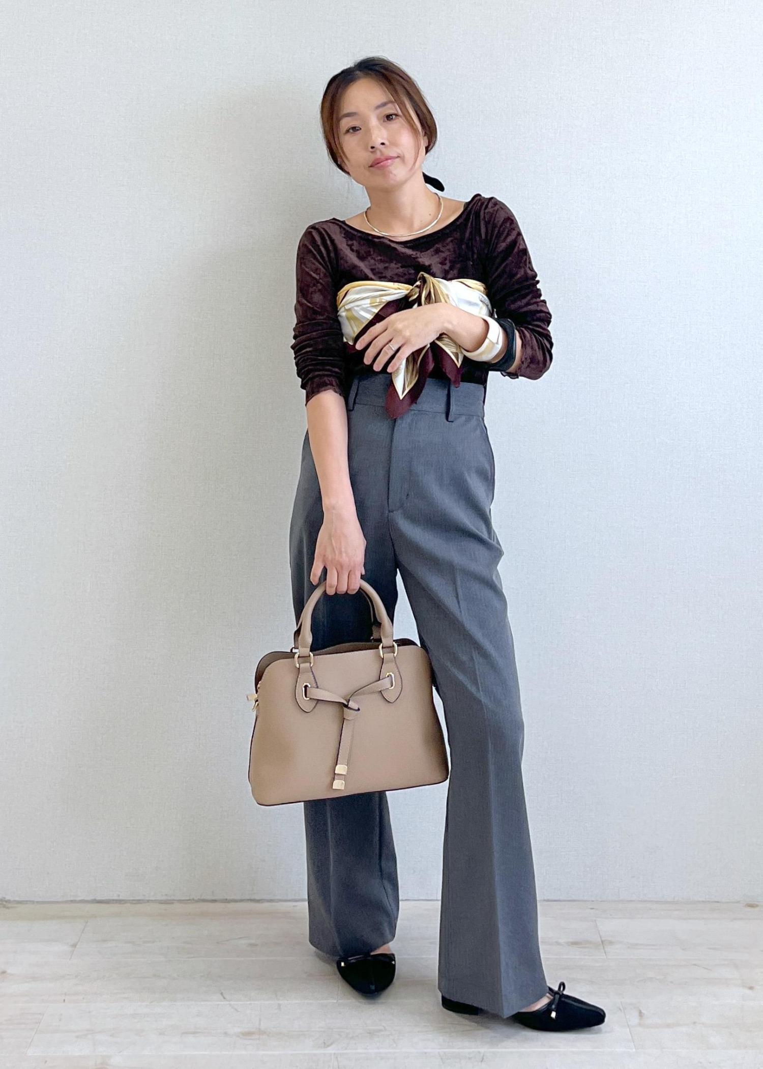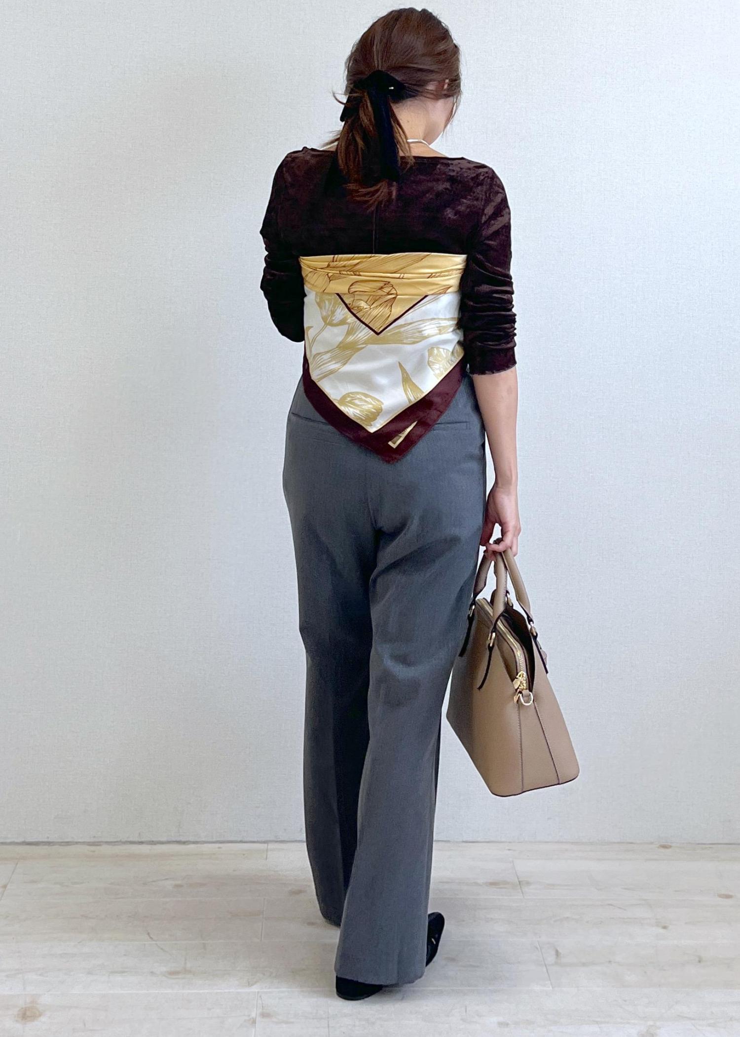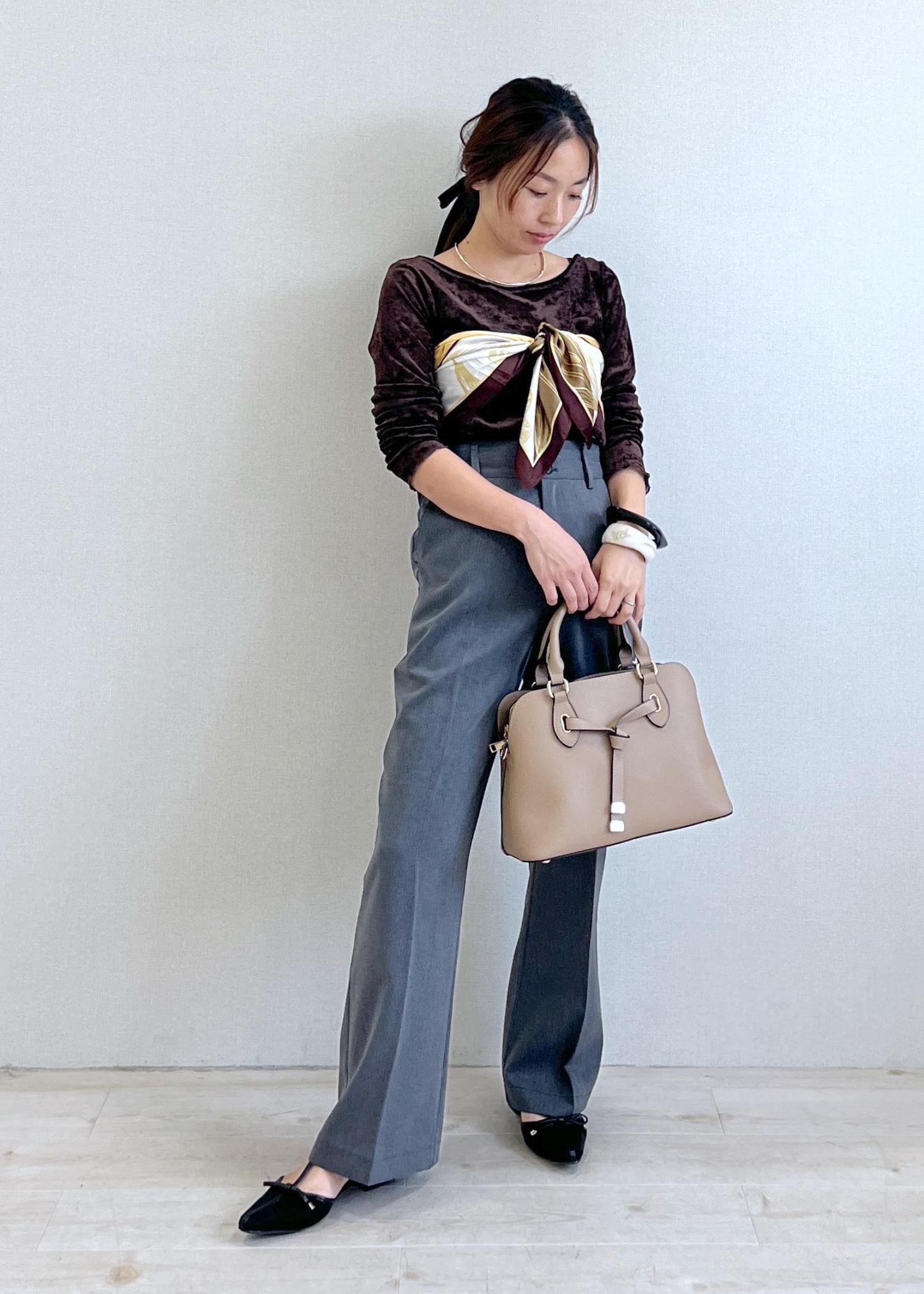 光沢感のあるトップスにスカーフをきゅっと結んで、シンプルなパンツスタイルを一気に華やかに。