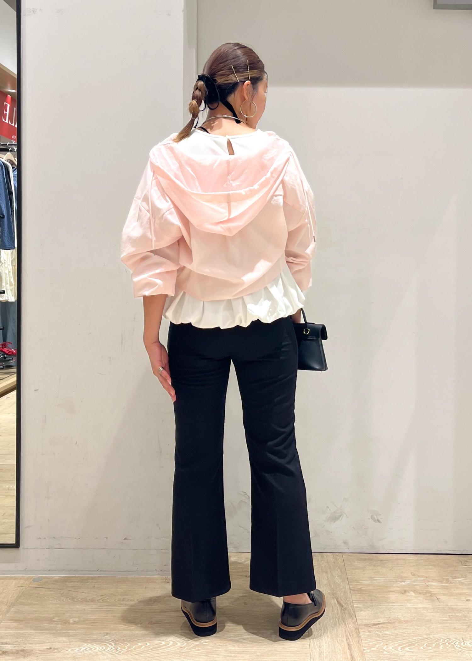 トップスにボリュームがあるのでスッキリシルエットのパンツでバランスよくが◎