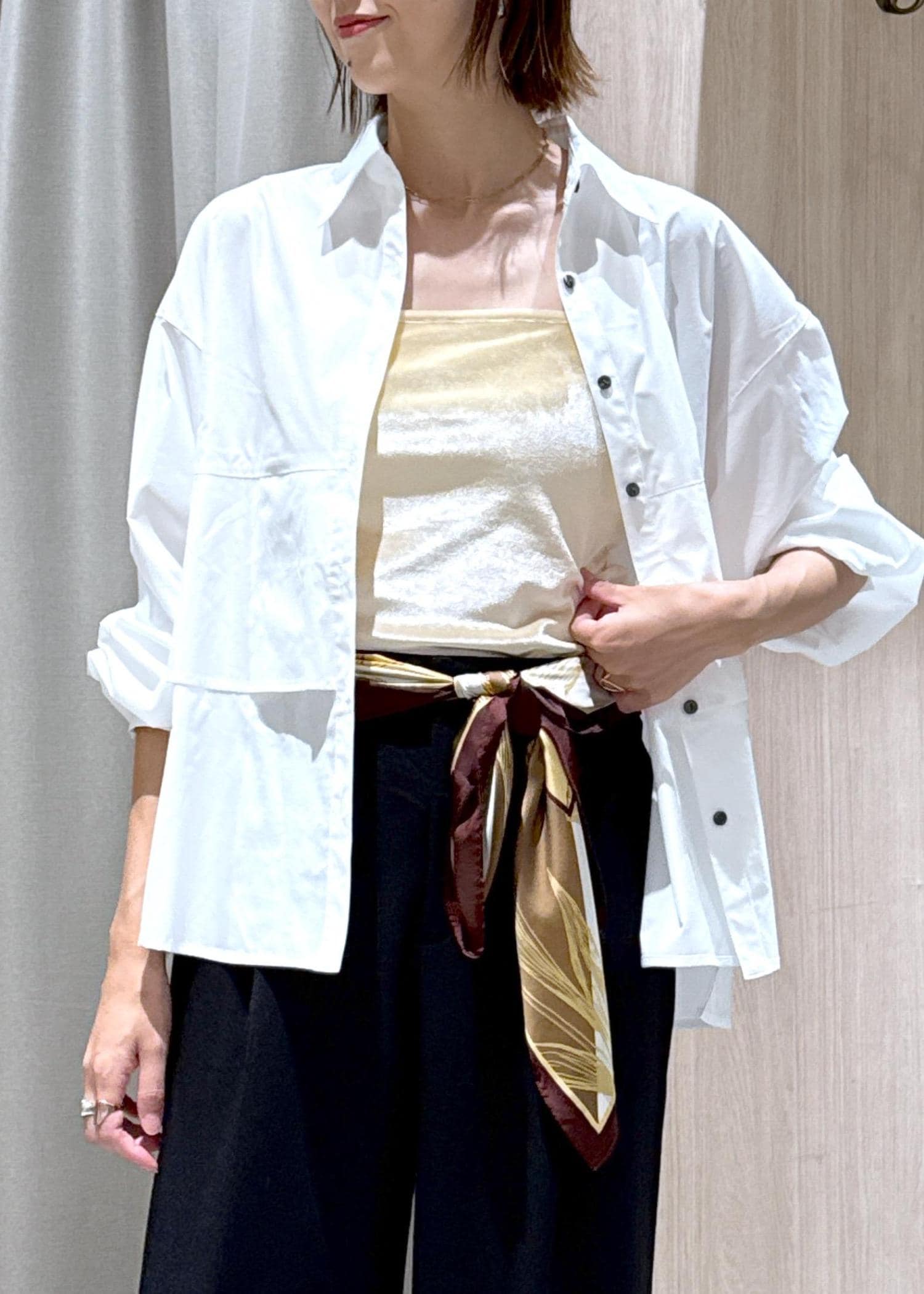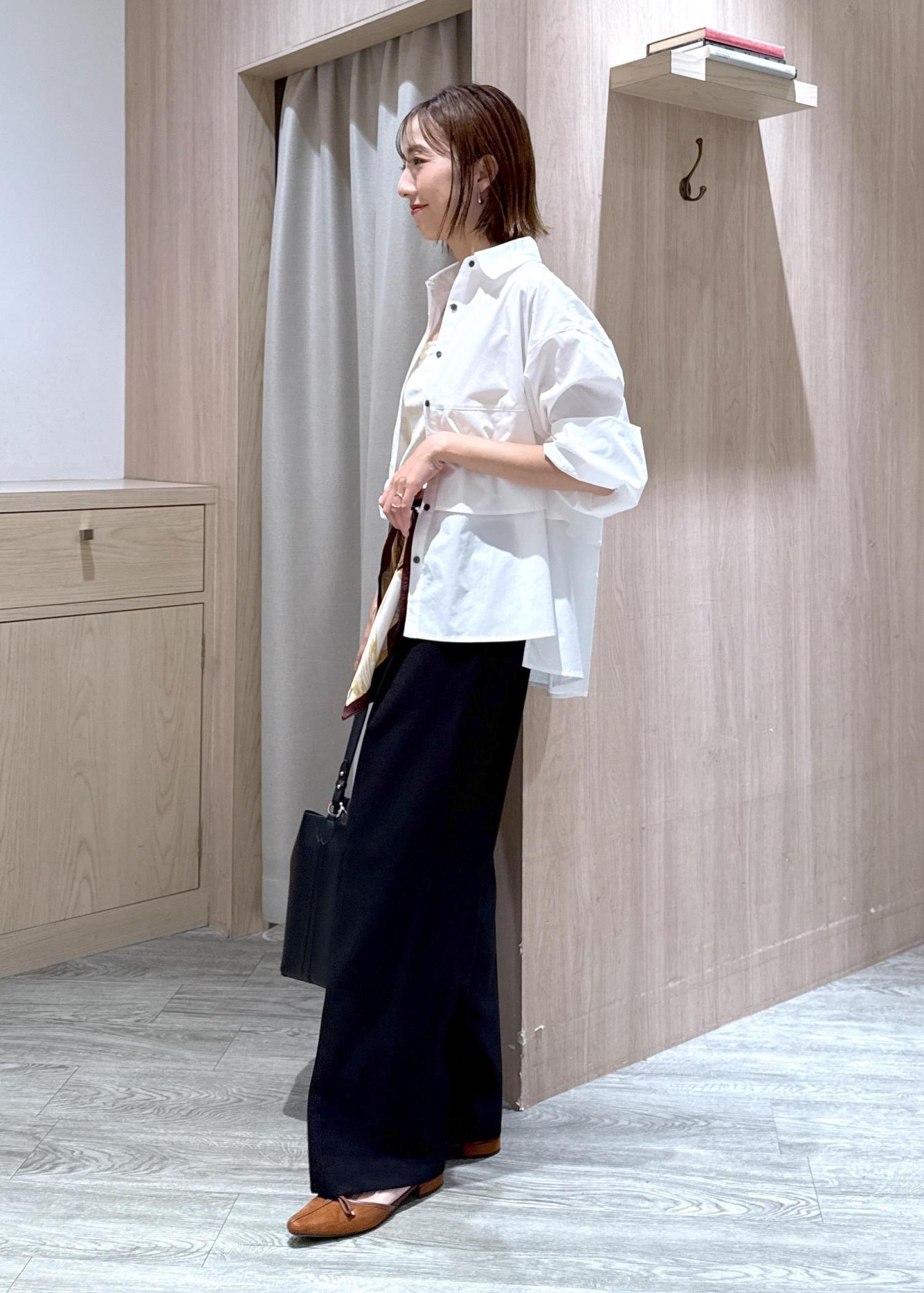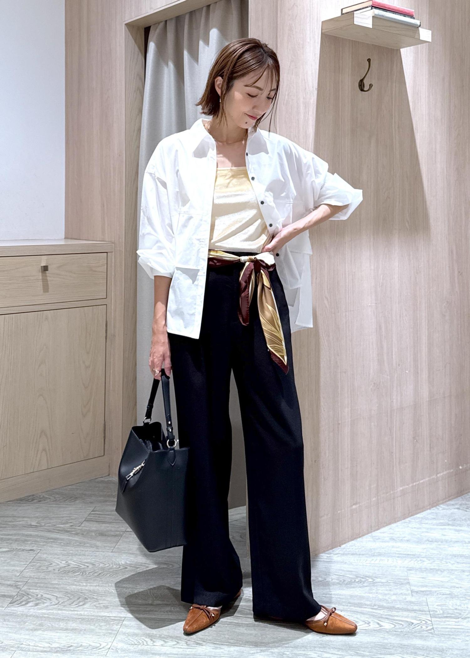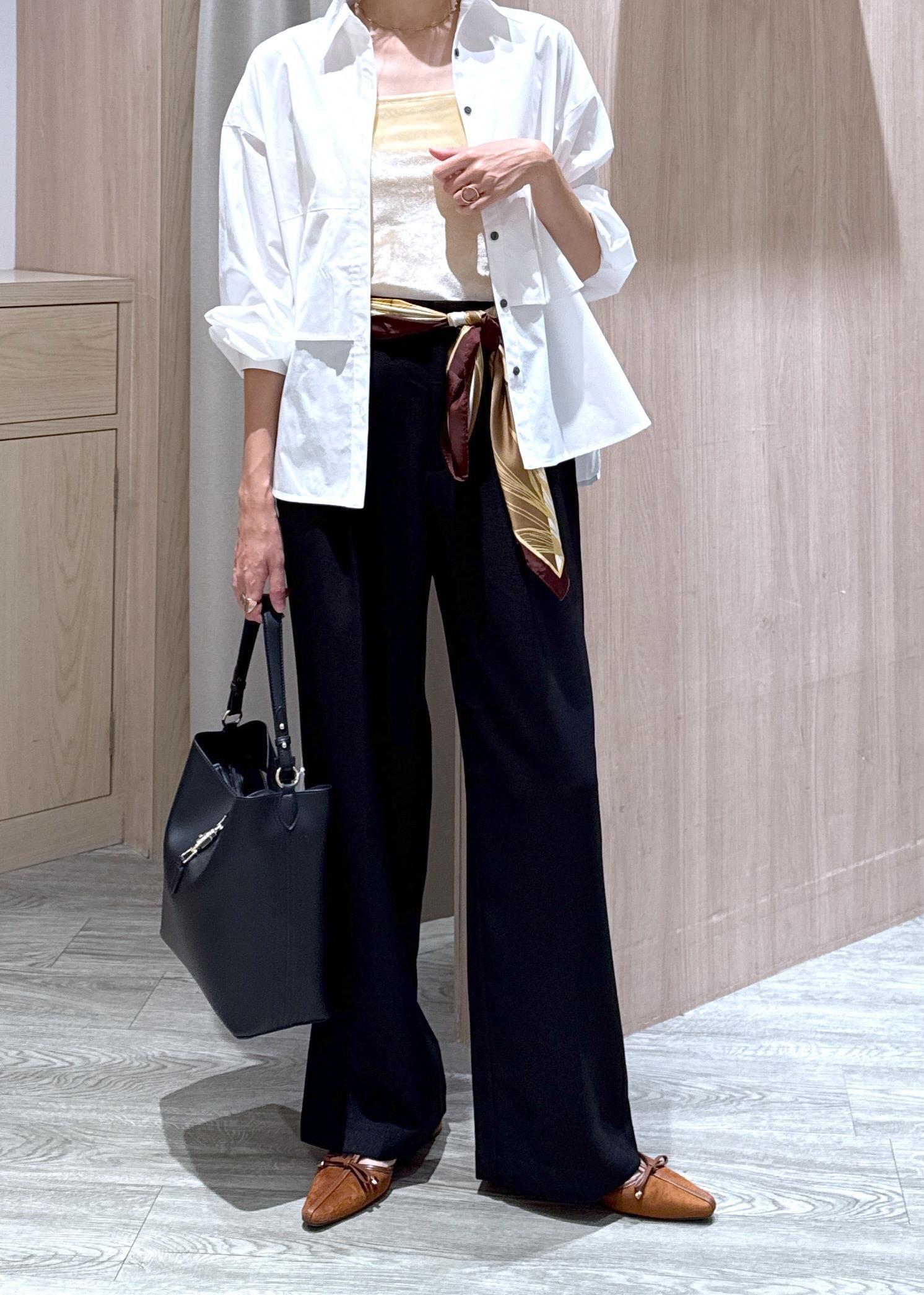 シンプルになりがちな白シャツ×スラックスの定番モノトーンコーデをスカーフで秋仕様にアップデートしました⭐︎