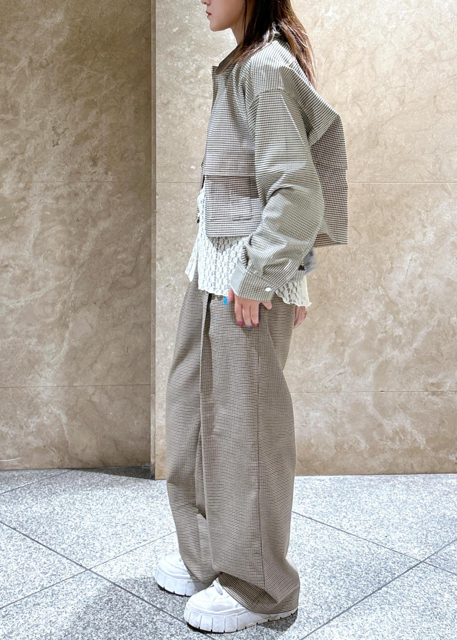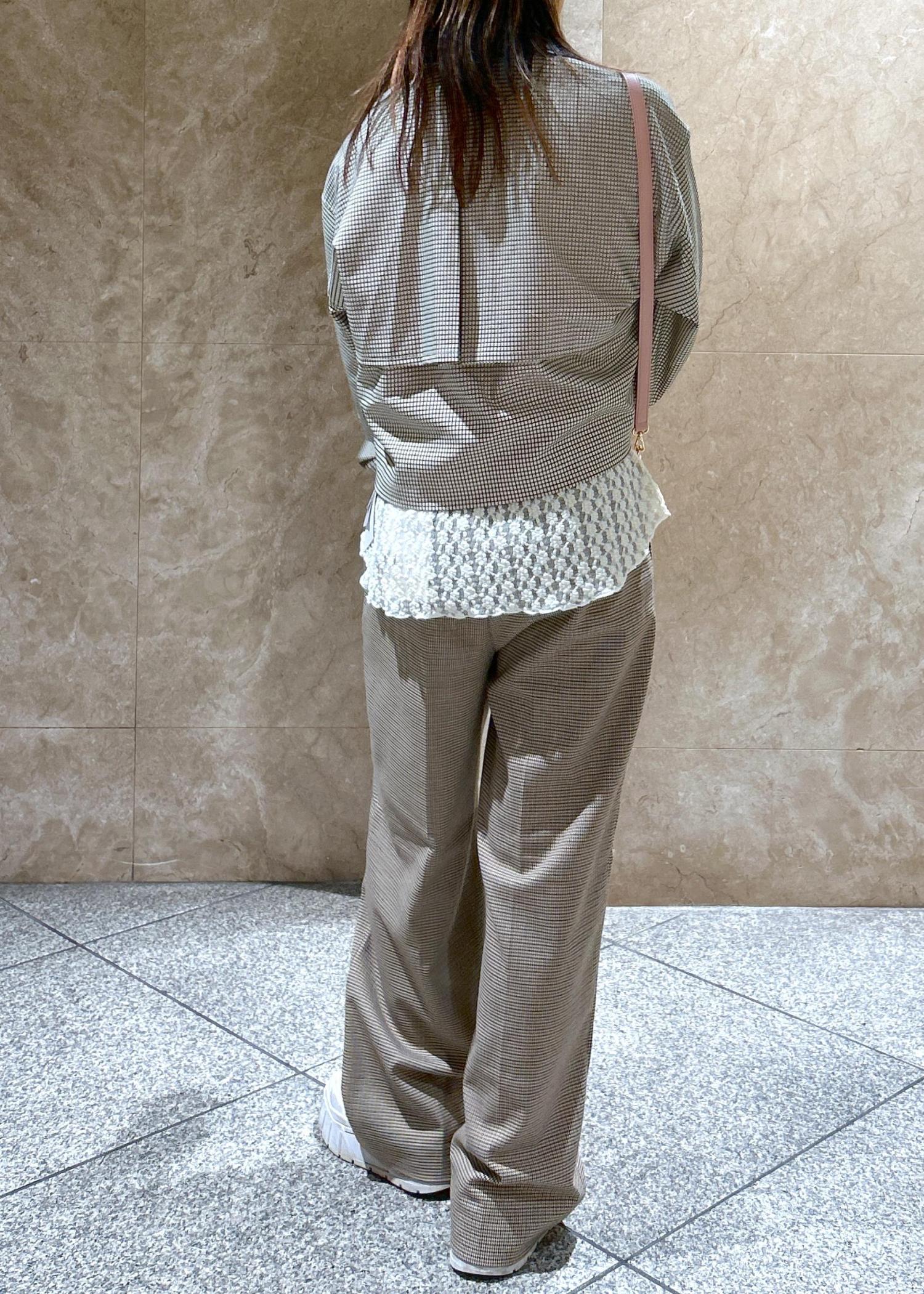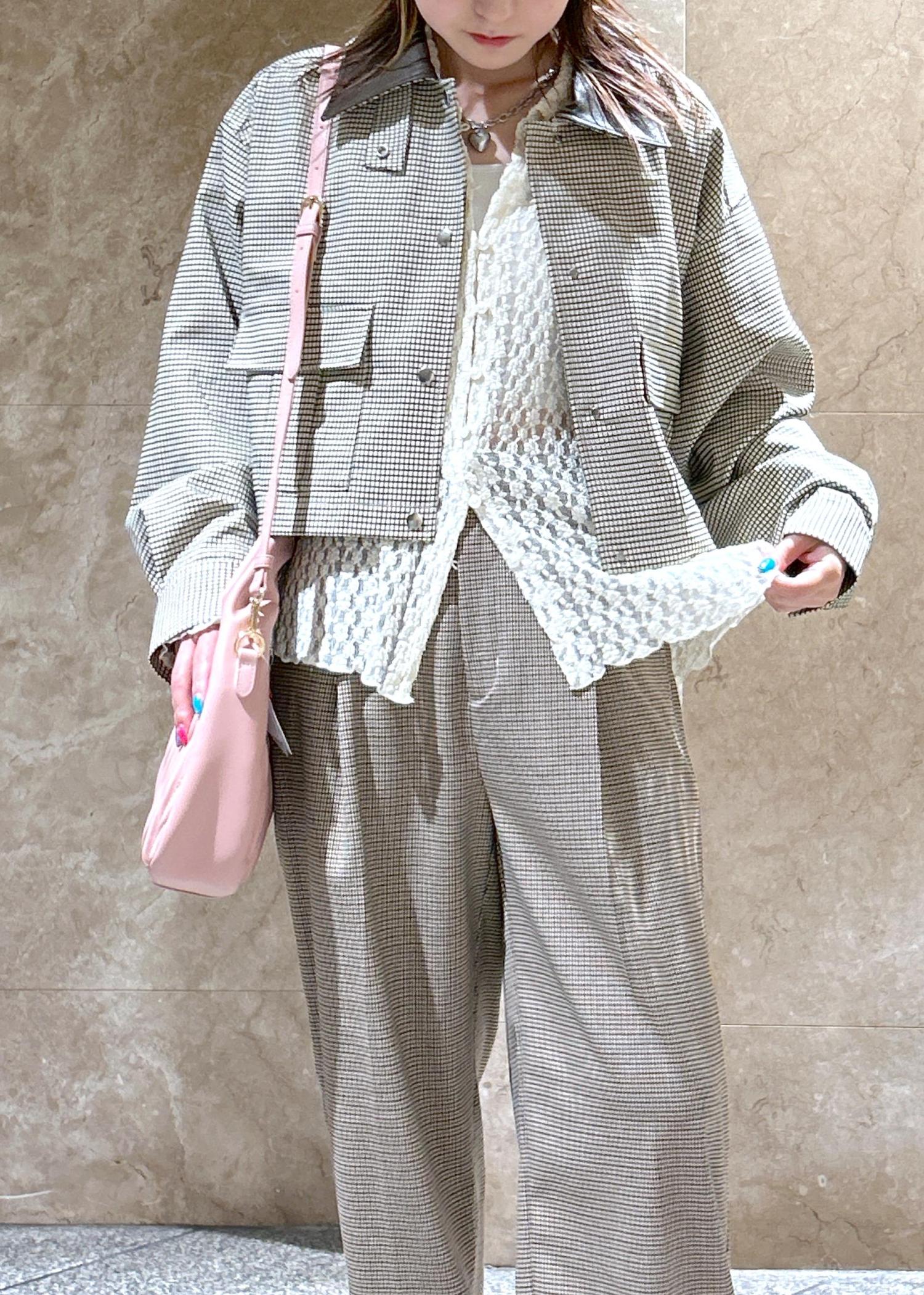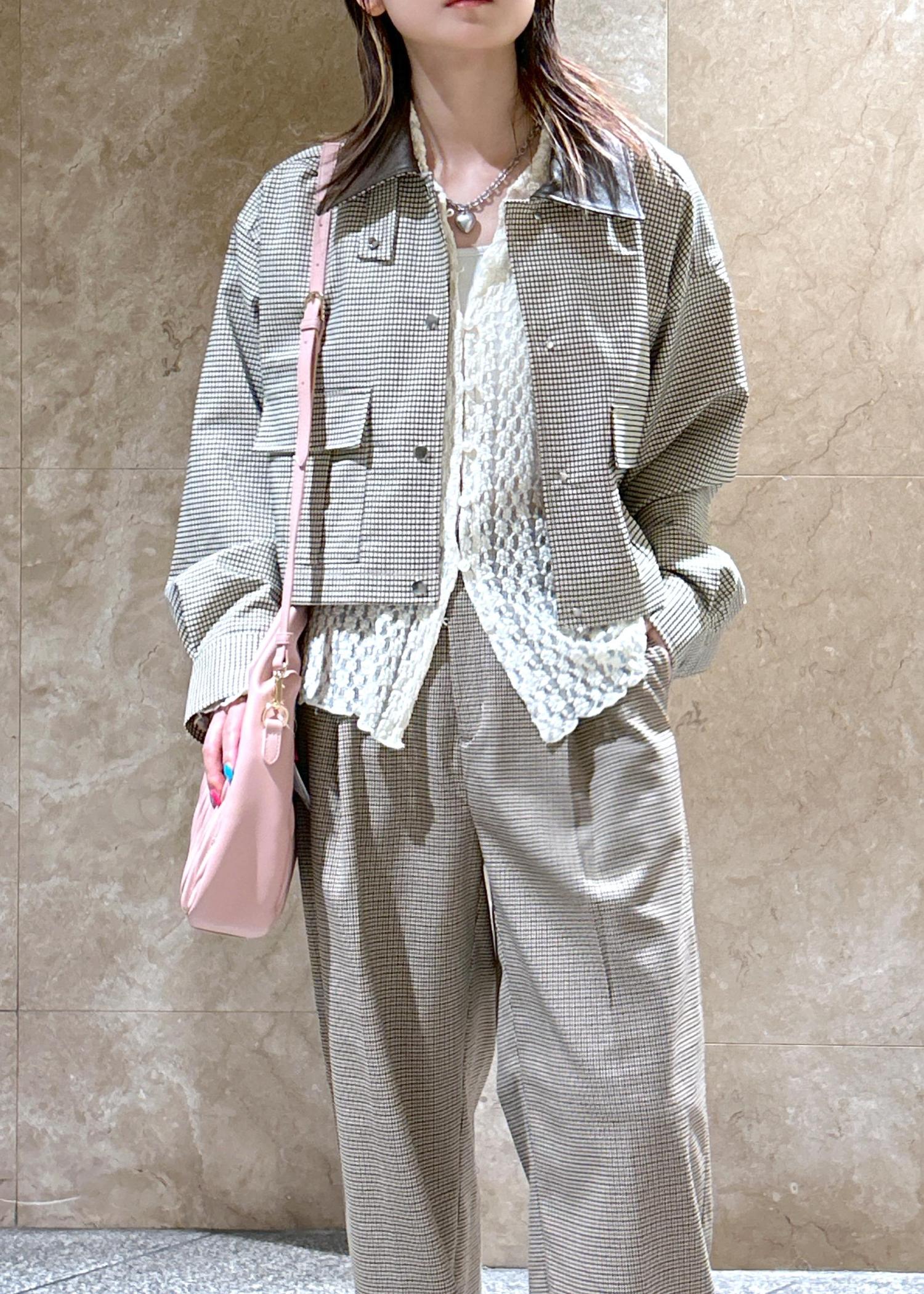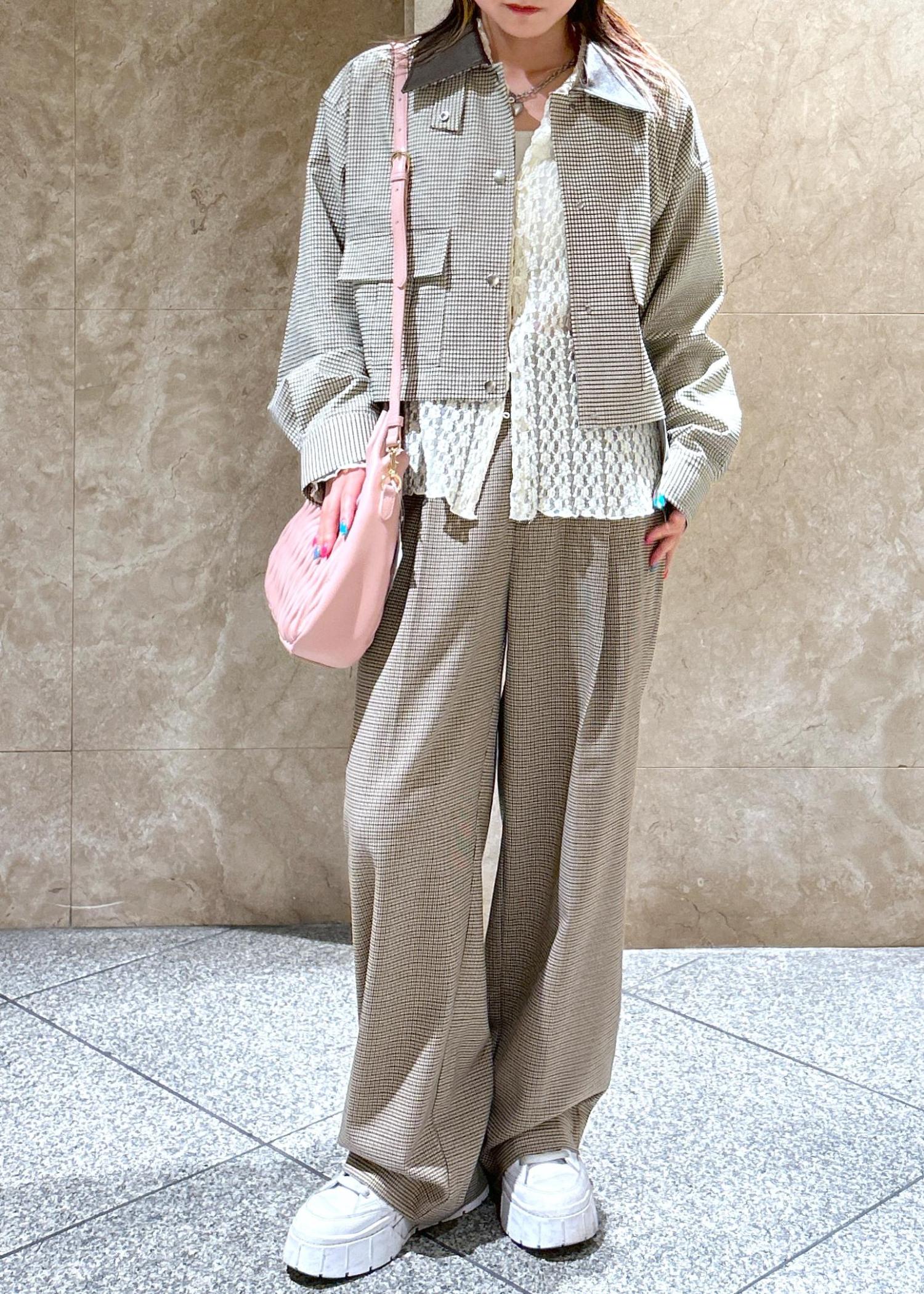 チェック柄のブルゾンとパンツを合わせたチェック柄コーデです!目の細かいチェック柄なので、ゴチャゴチャしすぎず◎