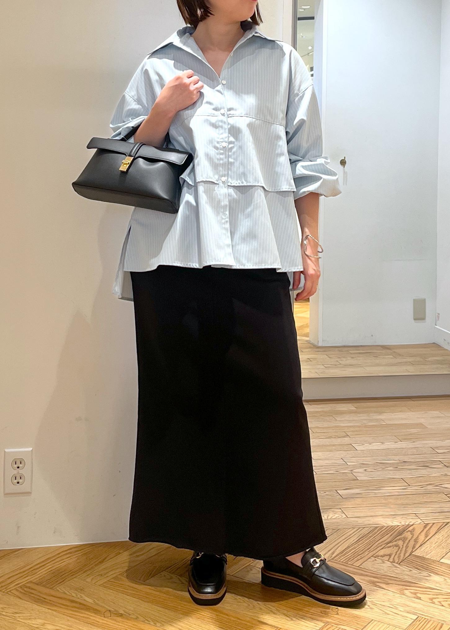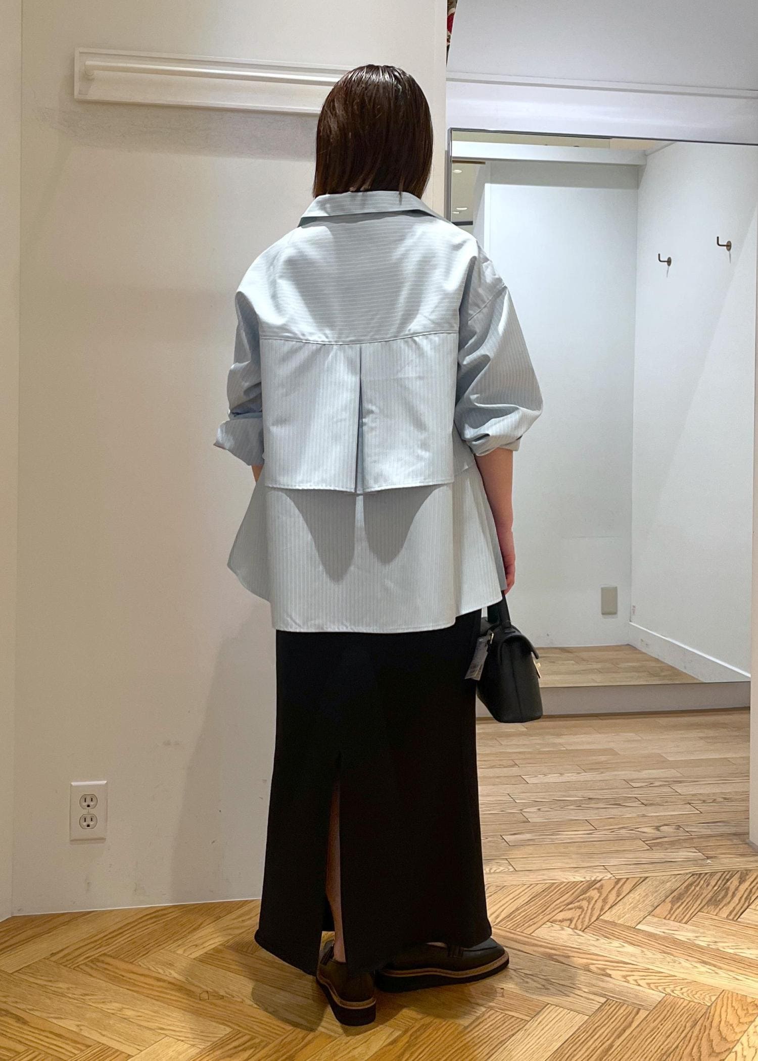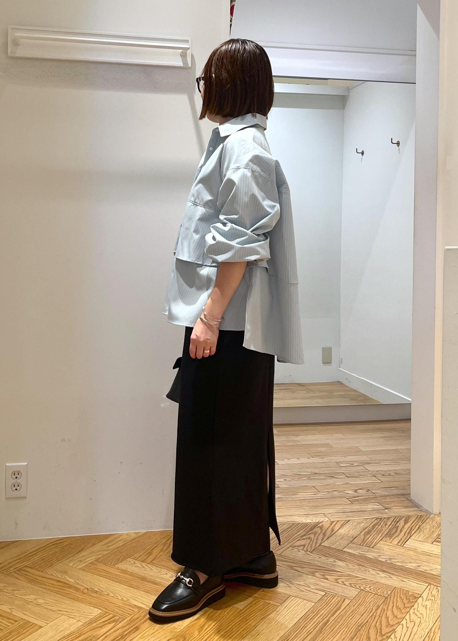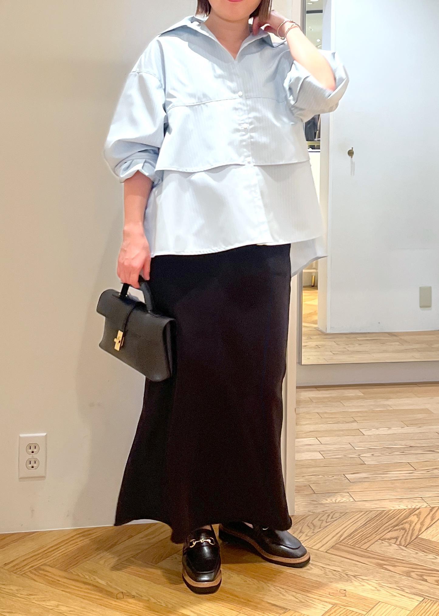 ハリ感ある生地で、こなれ感を楽しみつつもカッコよく着れるシャツは、スウェットスカートと合わせて、大人カジュアルなスタイルに♡