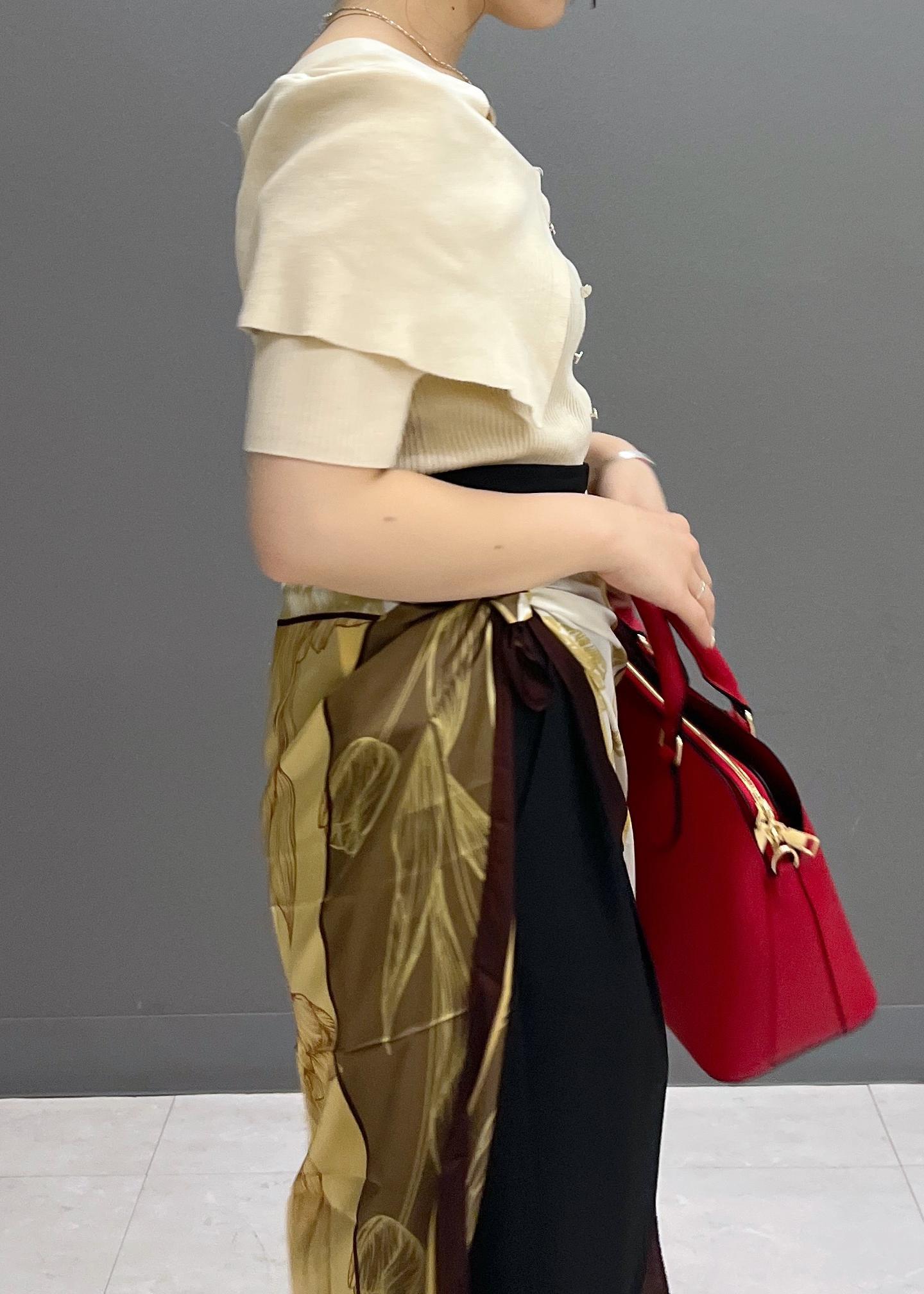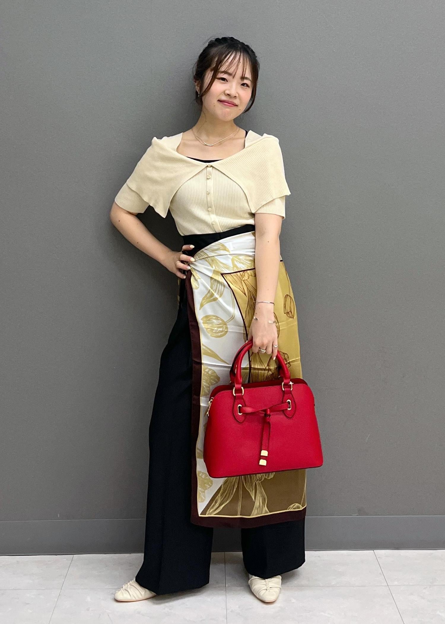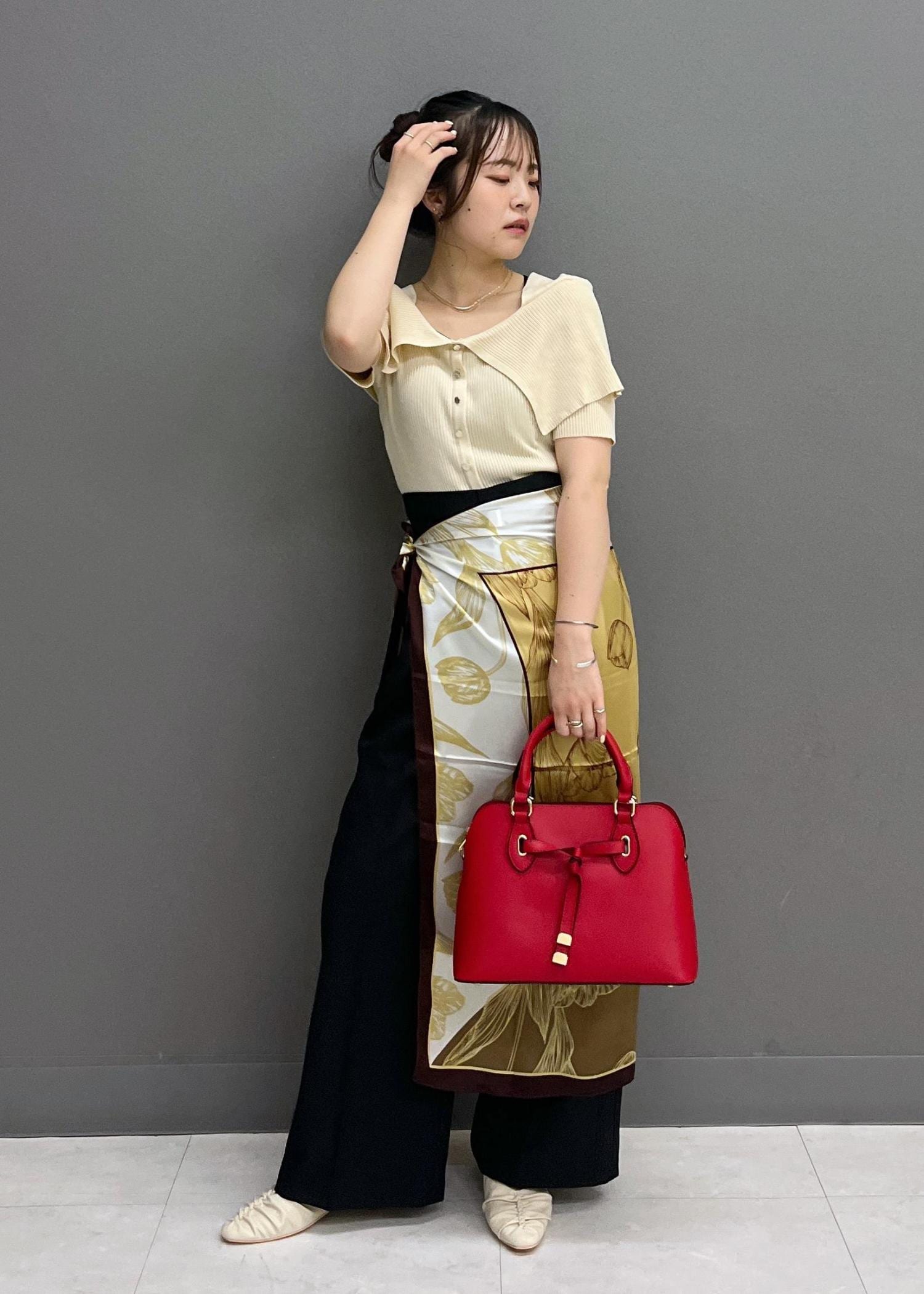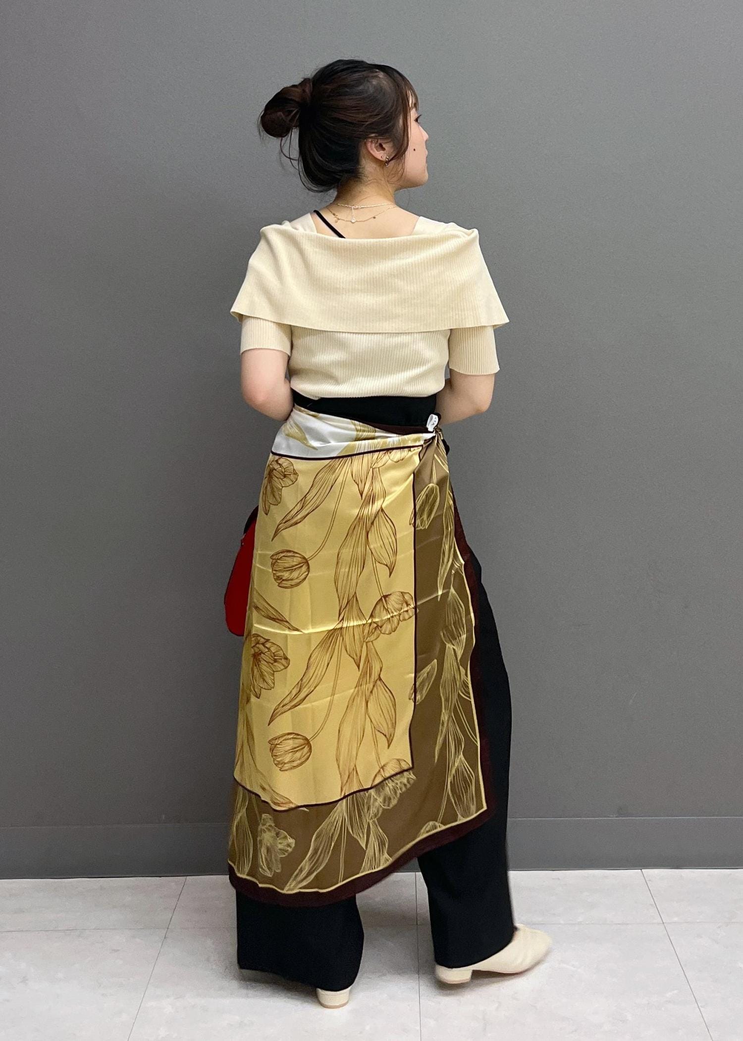 スカーフでお腹、腰周りのカバーをしつつ、コーディネートに華やかさがプラスされるようにしてみました☺︎