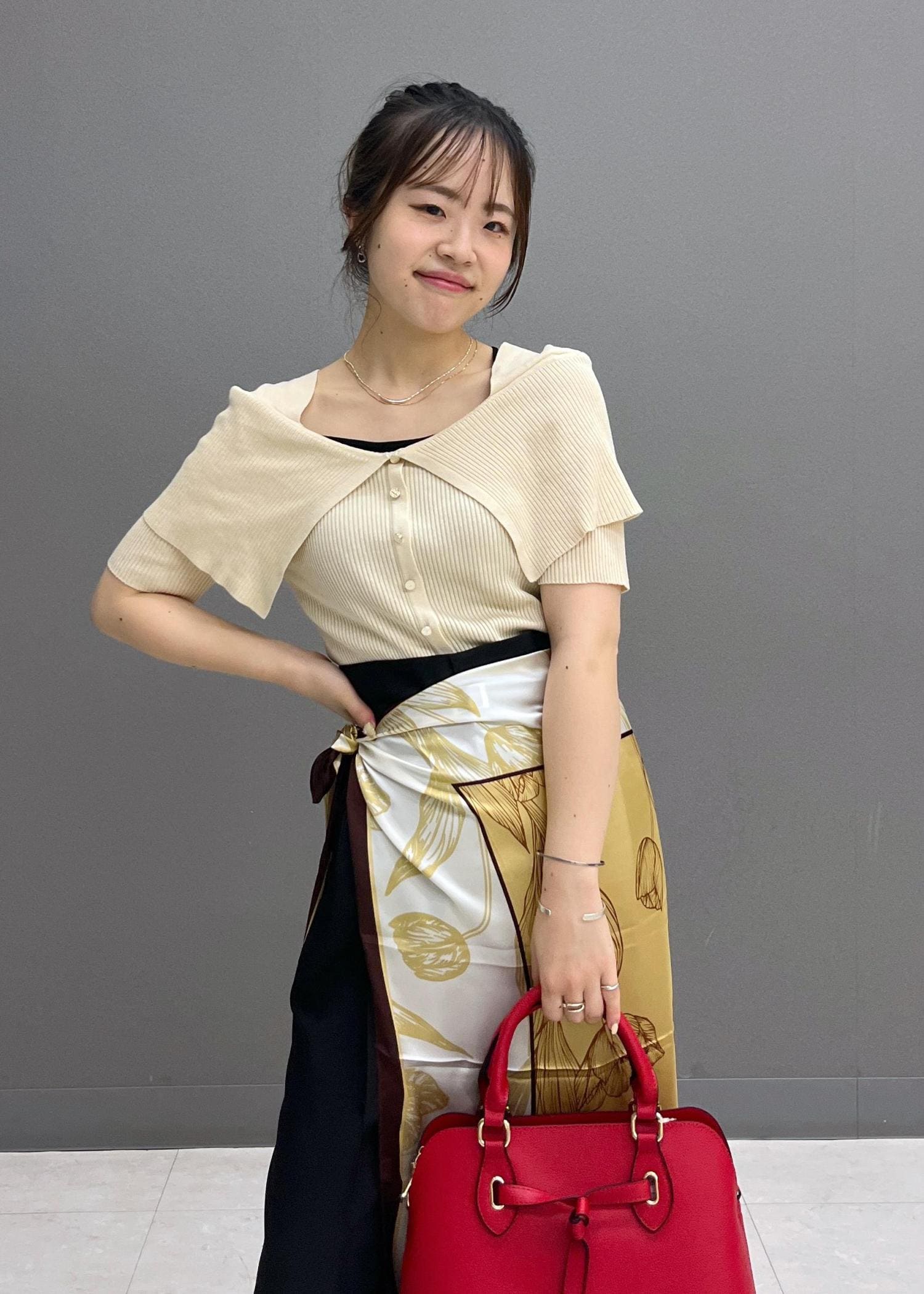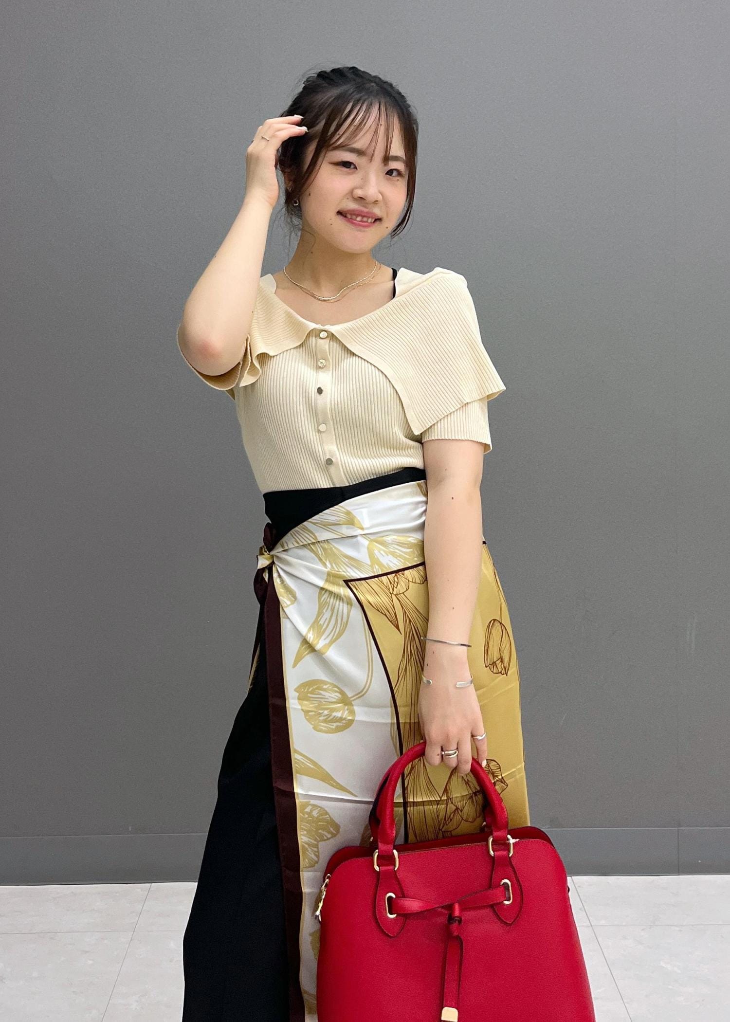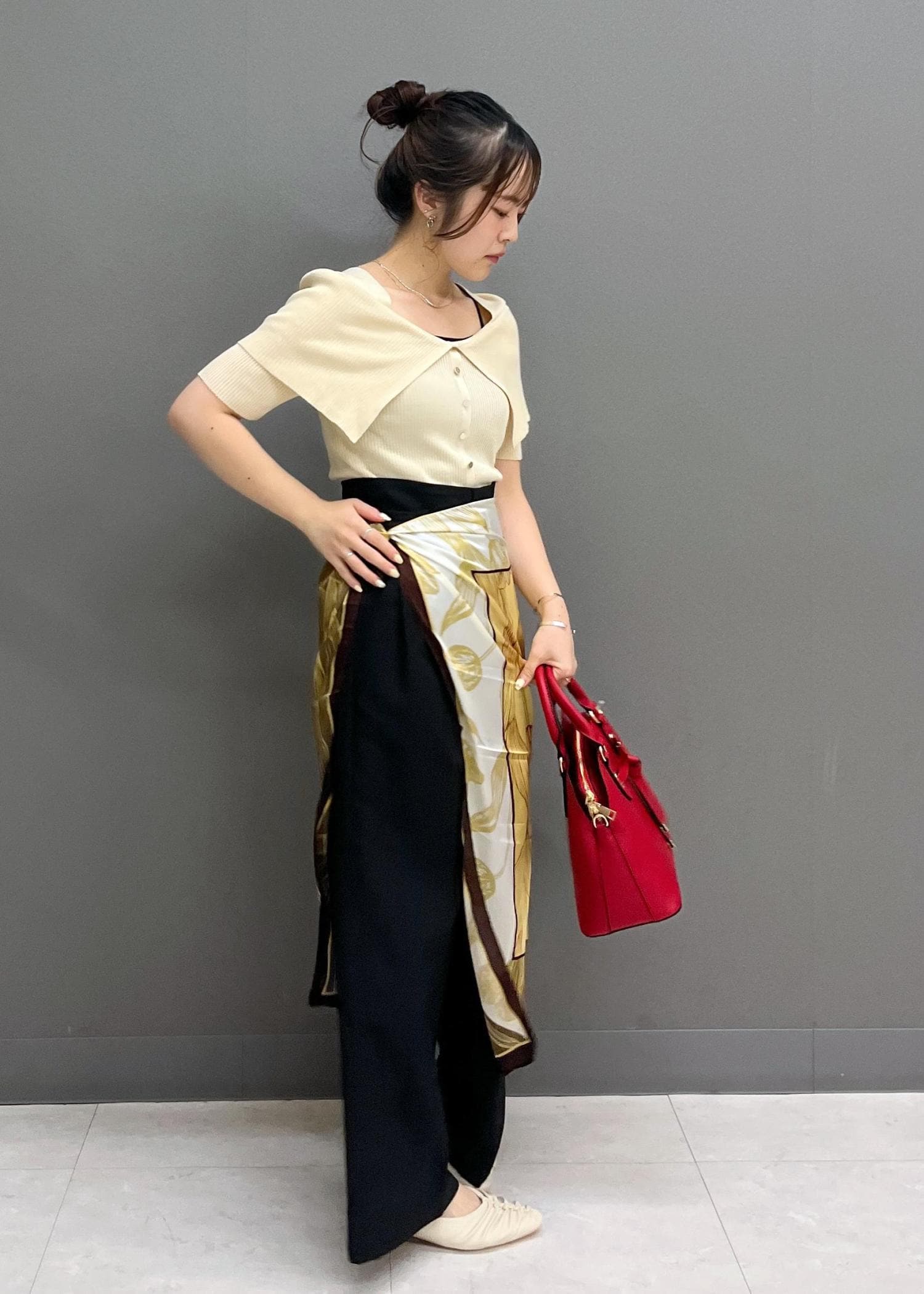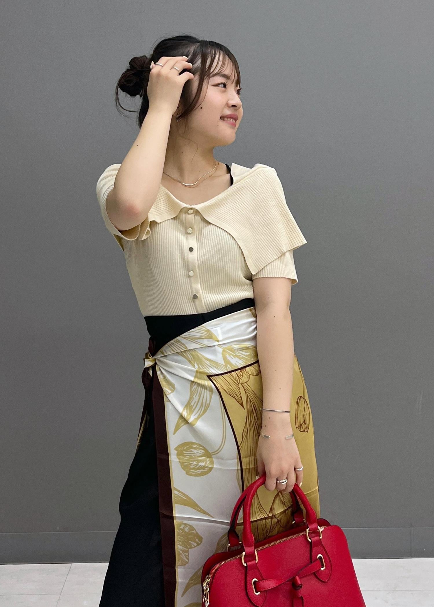 スカーフでお腹、腰周りのカバーをしつつ、コーディネートに華やかさがプラスされるようにしてみました☺︎