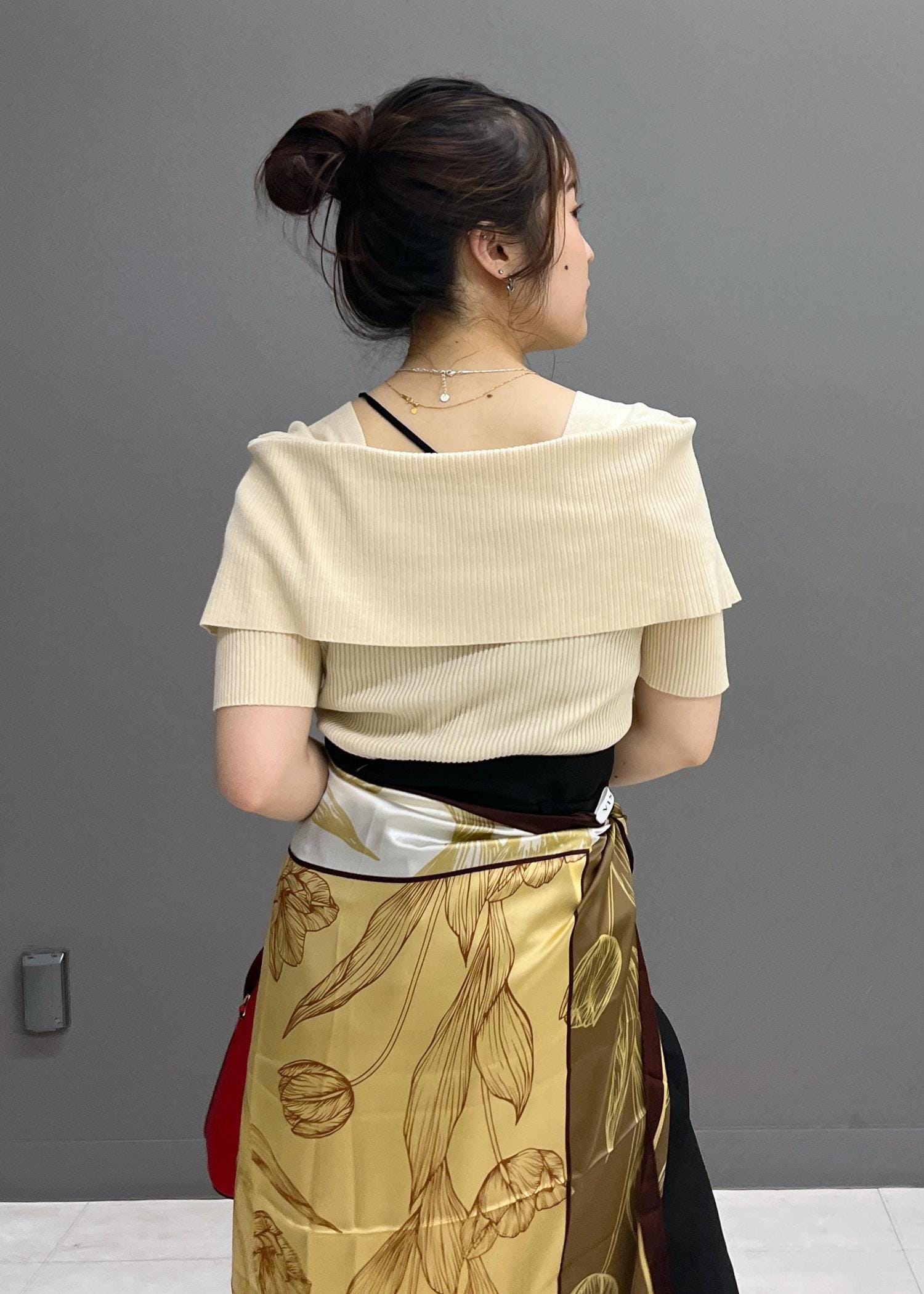 紐部分がアシンメトリーなデザインになるので、デコルテ周りがあいているトップスを着ても可愛いなと思いました☺︎